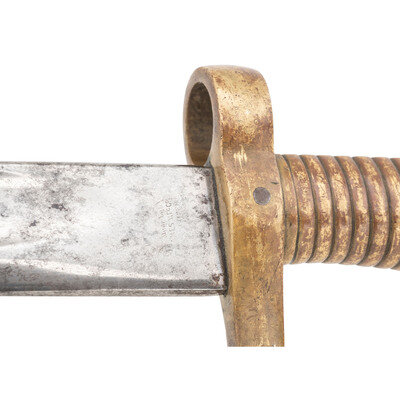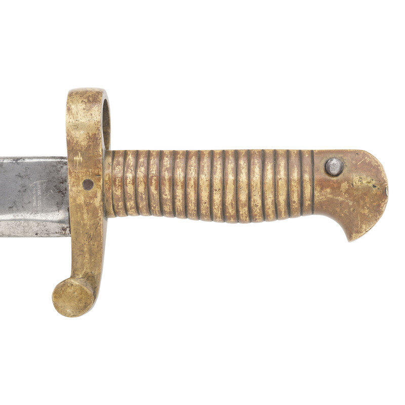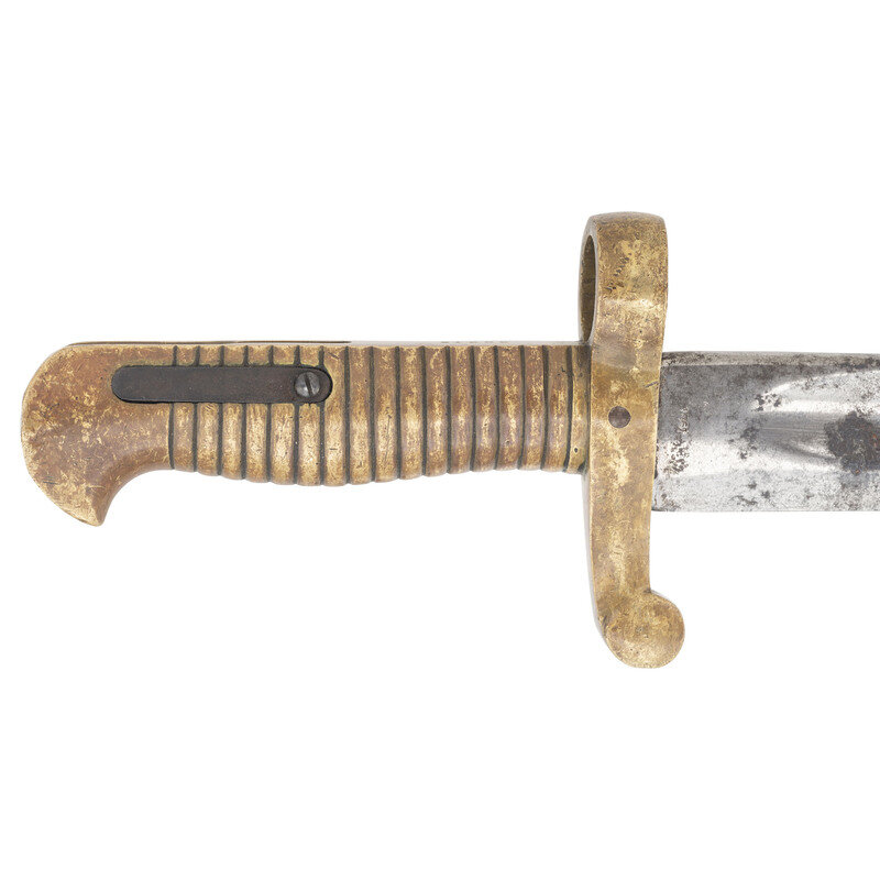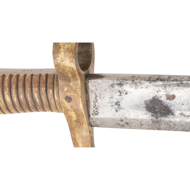 3) Sharps Rifle Saber Bayonet. 21.75" semi-Yataghan blade with 15" fuller. Overall length 26.625". Blade 1.21" wide at ricasso. 4.75" cast brass hilt with 17 grasping grooves. Mussle ring diameter is .817". Mortise cut for 1" guide lead on lug. Serial number 40319 on top of hilt. Obverse ricasso with Ames scroll mark, reverse ricasso dated 1861. No scabbard is present. This serial number falls in the range of Sharps Rifles issued to the 5th Michigan Infantry.