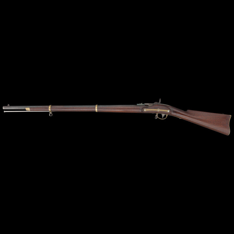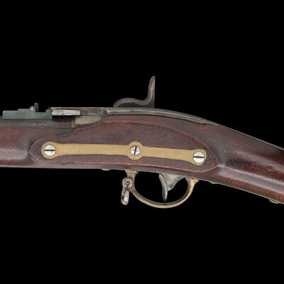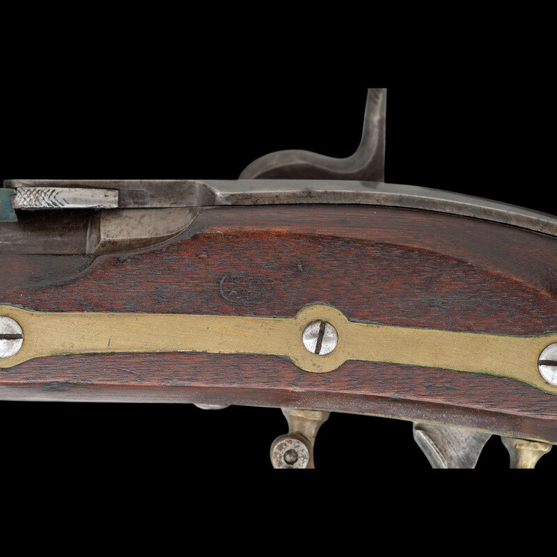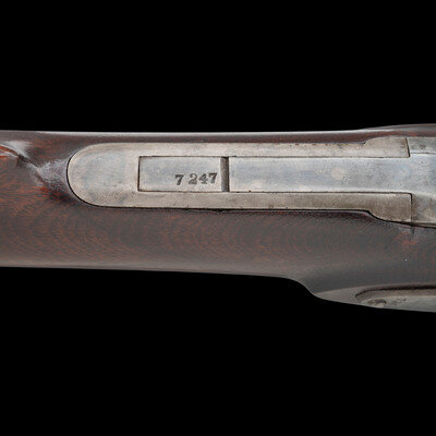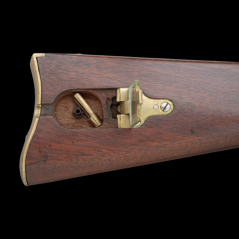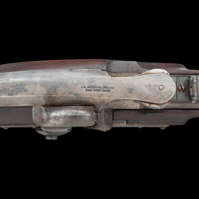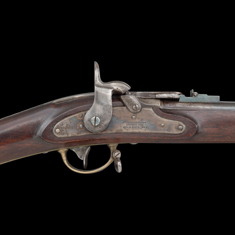 .54 caliber. 33" round barrel secured by two pin-retained brass barrel bands. S/N 7247. Blued barrel, color casehardened lock, breech and hammer, brass furniture, smooth straight-gripped walnut stock. Breechloading percussion rifle produced on JH Merrill's patented system. Lock marked J.H. MERRILL BALTO/PAT. JULY 1858/APL. 9 MAY 21-28-61 in three lines under the bolster and with the serial number vertically at the tail. Top of breech lever marked in two lines J.H. MERRILL BALTO/PAT. JULY 1858 and with the matching serial number found on the lock. Counterpane with a clear script ZB cartouche in an oval, the mark of arsenal sub-inspector Zadock Butt. Retains correct 1858 pattern rear sight, correct pattern front sight blade, correct saber bayonet lug and correct full-length button head cleaning rod with threads on the end for the brass cleaning jag that was issued with these guns. In the patchbox the correct original brass cleaning jag is present, as well as an original spare nipple. Only about 800 of these rare breechloading percussion rifles were produced by the Merrill company and acquired by the US government during the Civil War period. The largest single issue of these arms was to the 21st Indiana Infantry, with smaller numbers issued to the 7th & 10th Michigan Infantry, 4th Arkansas Infantry, and the 1st Massachusetts Infantry. A rare Civil War contract breechloading rifle not often found for sale. An original Merrill Rifle bayonet is offered in this sale as well as the next lot. {ANTIQUE}