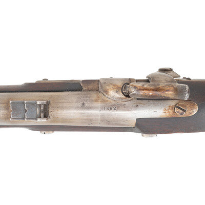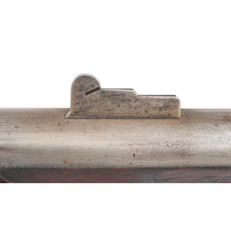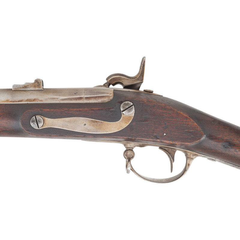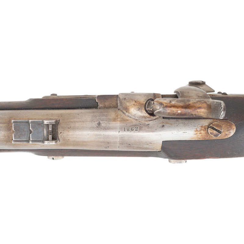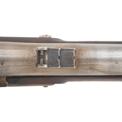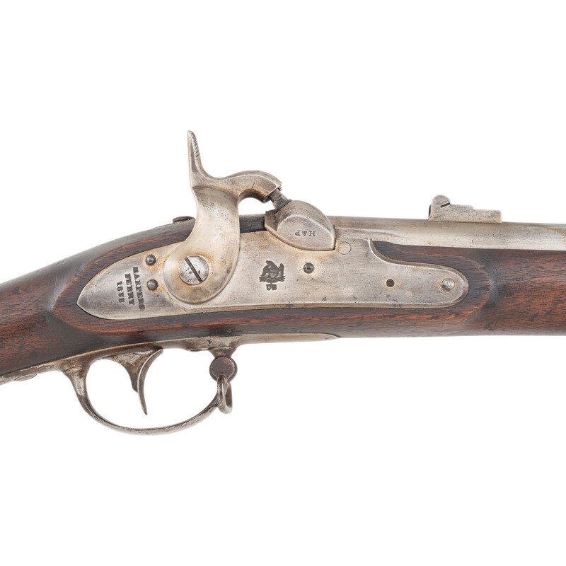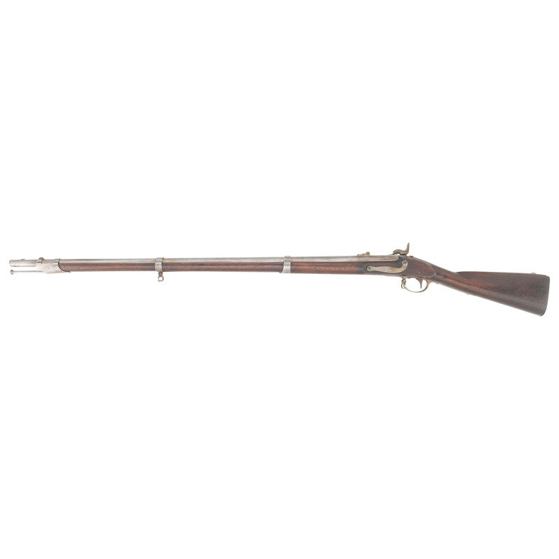 .69 caliber. 42" round barrel secured by three flat, spring retained bands. SN: NSN. National Armory Bright finish, iron furniture, smooth walnut stock. Single shot muzzleloading percussion altered US military musket. Lock marked with a {SPREAD-WINGED EAGLE}/US forward of the hammer and in three vertical lines at the tail HARPERS/FERRY/1833. Hewes & Phillips added patent breech dated 1862 with H&P mark on face of bolster. Counterpane no visible cartouches. Altered to percussion by the firm of Hewes & Phillips of Newark, NJ and additionally modified by adding a US 1858 pattern 3-leaf rear sight at the breech but without rifling the bores. Approximately 12,000 guns were so altered with patent breeches, and long range rear sights without rifled bores, primarily for the US government. Musket retains both original sling swivels, the H&P added, tall iron front sight on the upper band, the small socket bayonet mounting lug on the top of the barrel near the muzzle and a full-length original button head ramrod with good threads at the end. The rear sight is of the M1861 pattern, instead of the typical M1858 pattern. {ANTIQUE}