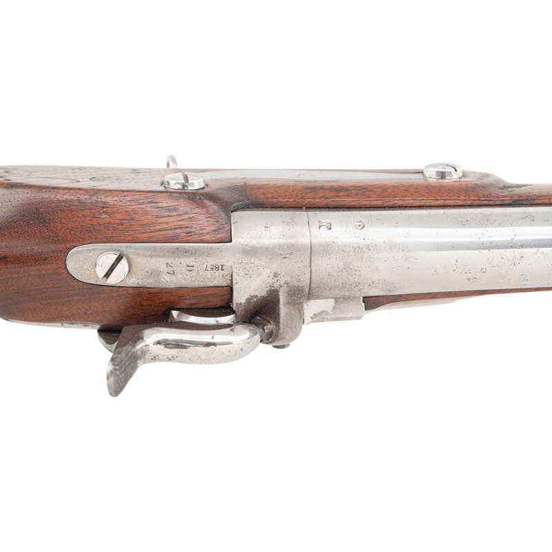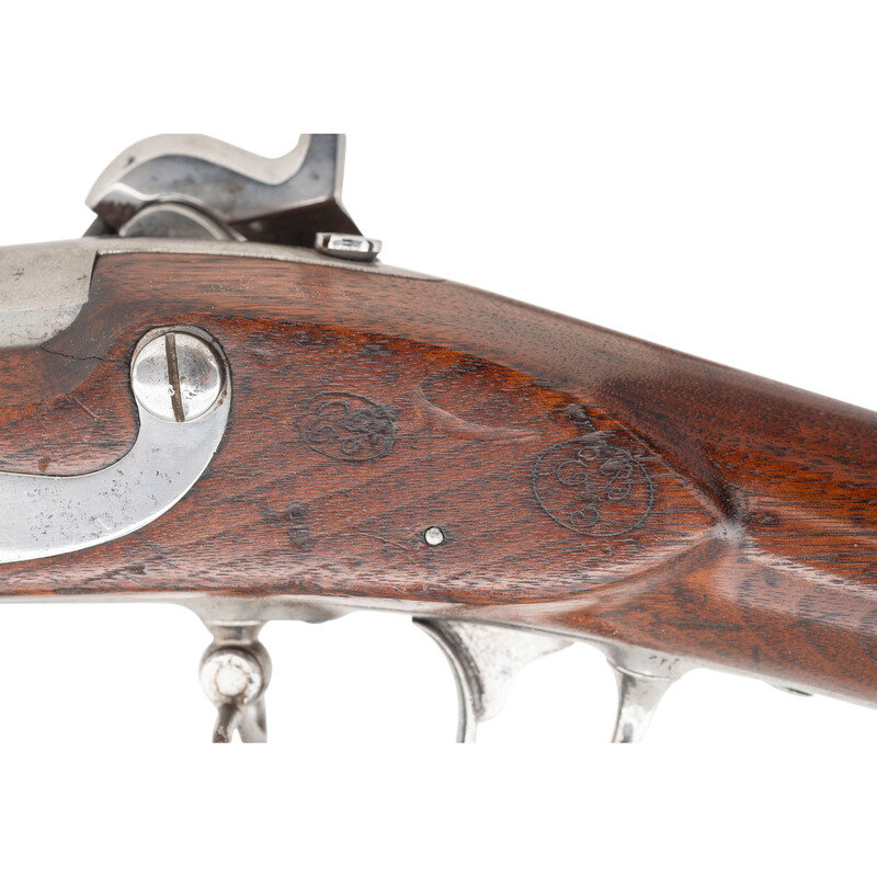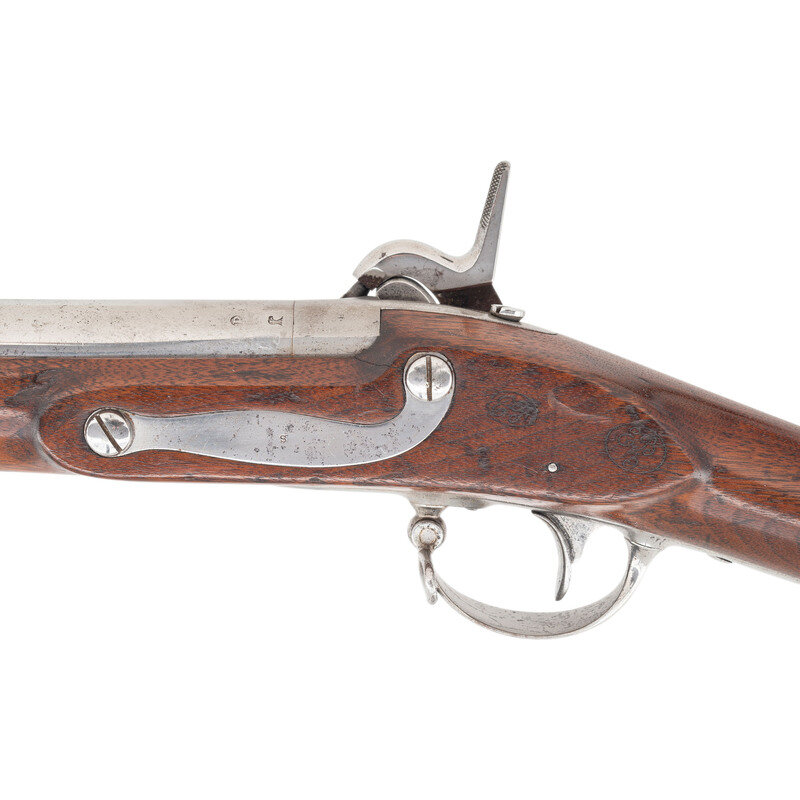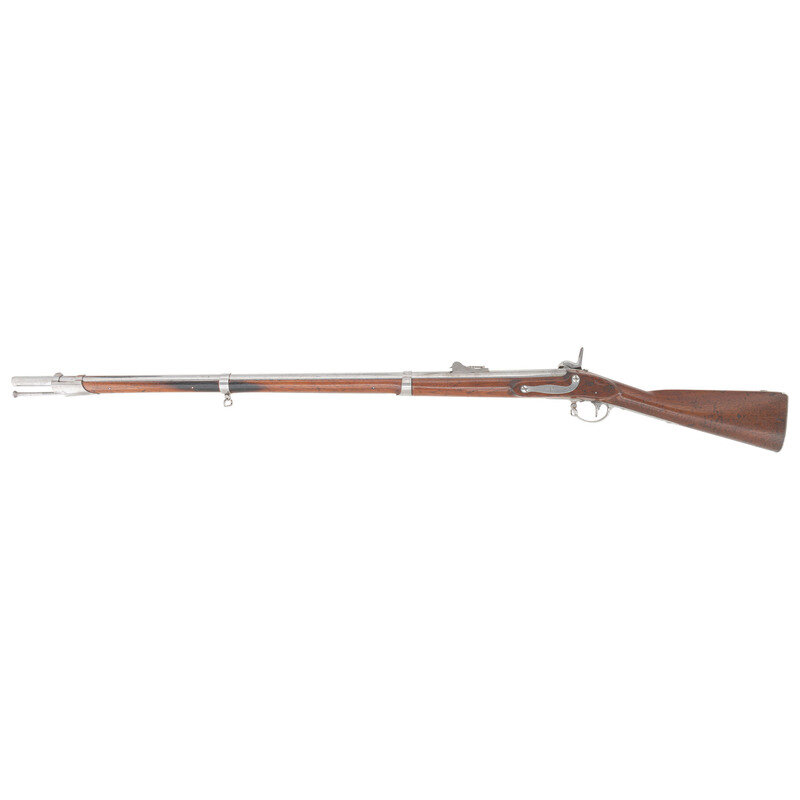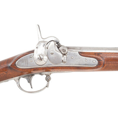 .69 caliber. 42" rifled barrel secured by three flat, spring retained bands. NSN. Bright finish, iron furniture, walnut stock. Single shot muzzleloading musket altered to rifled musket with automatic Maynard tape priming system. Lock marked REMINGTON'S/ILION, NY/1857/US in four vertical lines at tail. Tang of patent breech dated 1857, and with the bayonet mating code D/27. Counterpane with visible script cartouches, the ET of Springfield inspector Elisha Tobey and the EB/3 of sub-inpsector Elizur Bates who was part of the 1840s re-inspection team of Ordnance personnel inventorying and categorizing flint muskets in inventory. A script JS final inspection cartouche from Springfield Arsenal's Master Armorer John Stebbins is present behind the triggerguard. Rifled bore and upgraded with a US 1855 pattern long range rear sight and a steel blade front sight. Maynard priming system remain compete and intact. Retains both sling swivels and a full-length button head ramrod that is not dished for use with elongated ball ammunition. The musket is one of the US 1816 pattern muskets altered to percussion with a patent breech and the Maynard automated priming system at Frankford Arsenal circa 1856-1858, with 20,000 altered for the US government and 2,000 for the State of New Jersey. The guns were also rifled during the conversion process, with the US gun fitted with long range rear sights as this one is and most of the NJ guns not so equipped. {ANTIQUE}