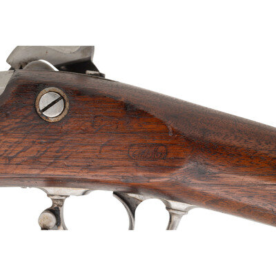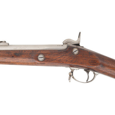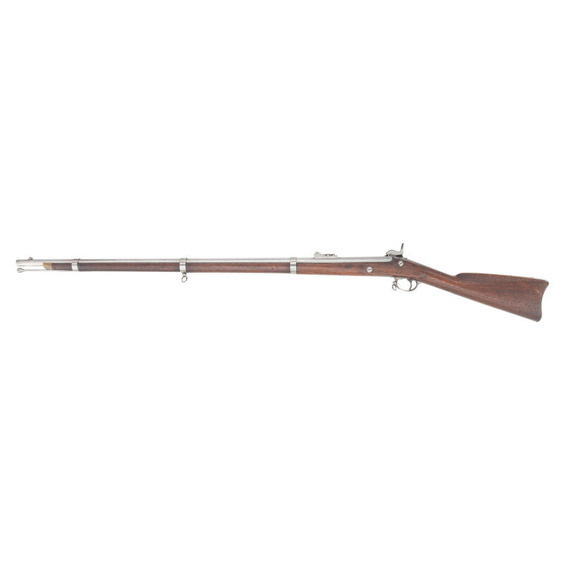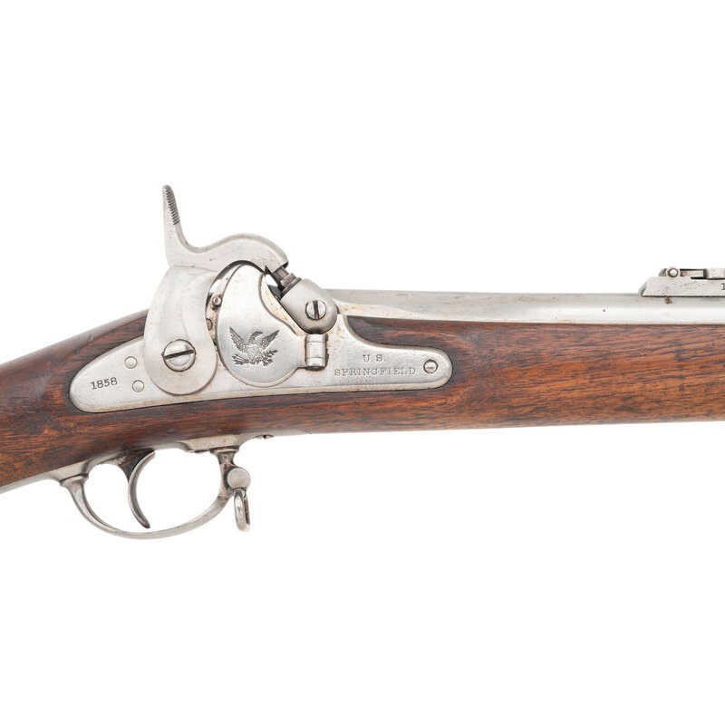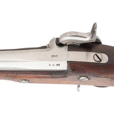 .58 caliber. 40" barrel secured by three flat, spring retained bands. NSN. Bright finish, iron furniture, brass nose cap, full-length walnut musket stock. Single shot percussion muzzleloading rifle musket with Maynard automatic tape primer, M1855 long range rear sight, Barleycorn combination front sight and socket bayonet lug, sling swivels and swelled shank tulip head ramrod. Lock marked with a {Spread Winged Eagle} on the tape primer magazine door and in two lines U.S./SPRINGFIELD forward of the hammer. Dated 1858 at tail of lock and top of breech. Standard V/P/{Eagle Head} proofs on breech. A weak illegible sub-inspection cartouche is present on counterpane, as well as a clear script ESA cartouche. {ANTIQUE}