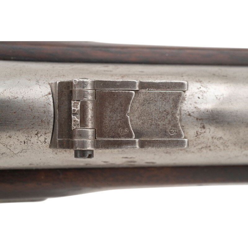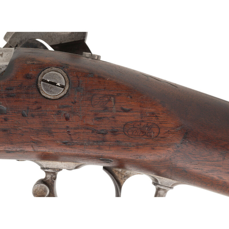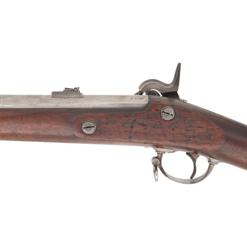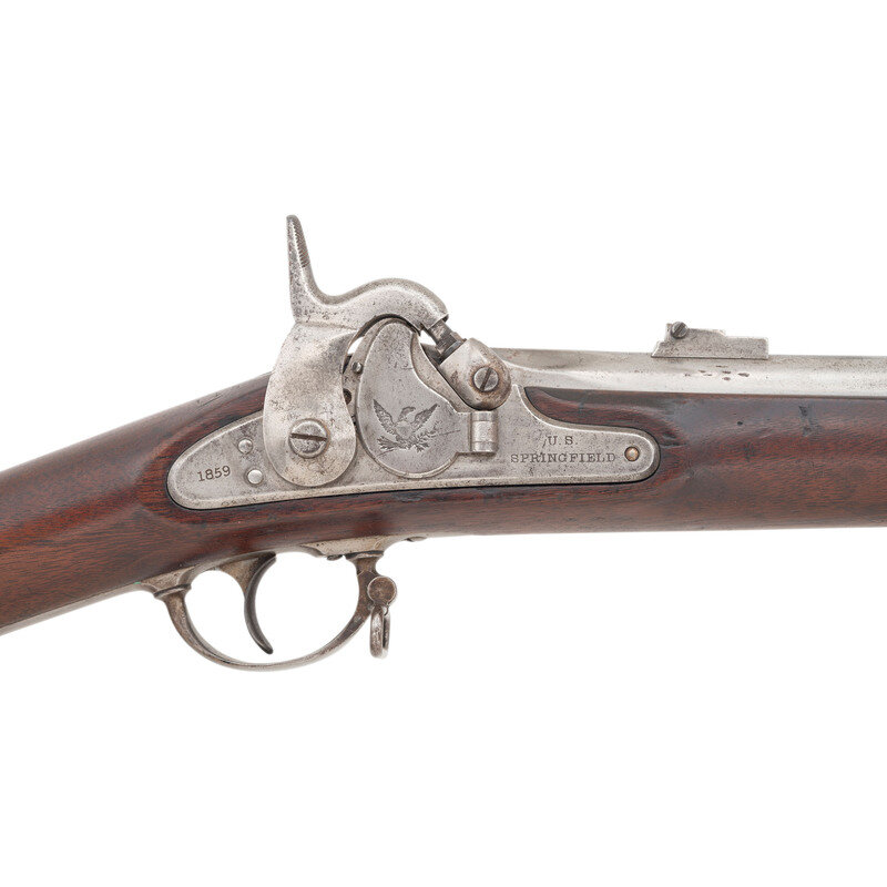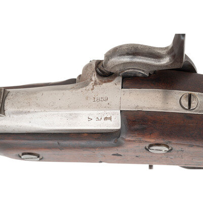 .58 caliber. 40" barrel secured by three flat, spring retained bands. NSN. Bright finish, iron furniture, brass nose cap, full-length walnut musket stock. Single shot percussion muzzleloading rifle musket with Maynard automatic tape primer, M1855 long range rear sight, Barleycorn combination front sight and socket bayonet lug, sling swivels and swelled shank tulip head ramrod. Lock marked with a {Spread Winged Eagle} on the tape primer magazine door and in two lines U.S./SPRINGFIELD forward of the hammer. Dated 1859 at tail of lock and top of breech. Standard V/P/{Eagle Head} proofs on breech. A legible script JS cartouche is present opposite the lock, the mark of Springfield Arsenal inspector James Stillman, as well as the script ESA of Master Armorer Erskine Allin. {ANTIQUE}