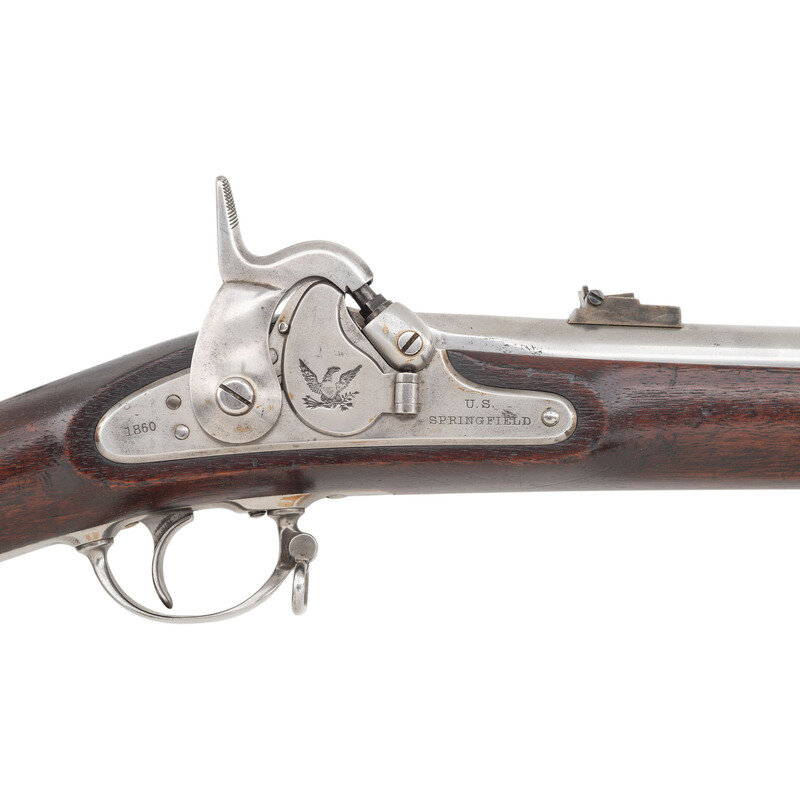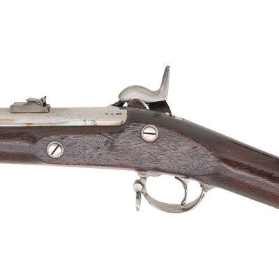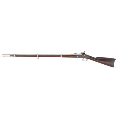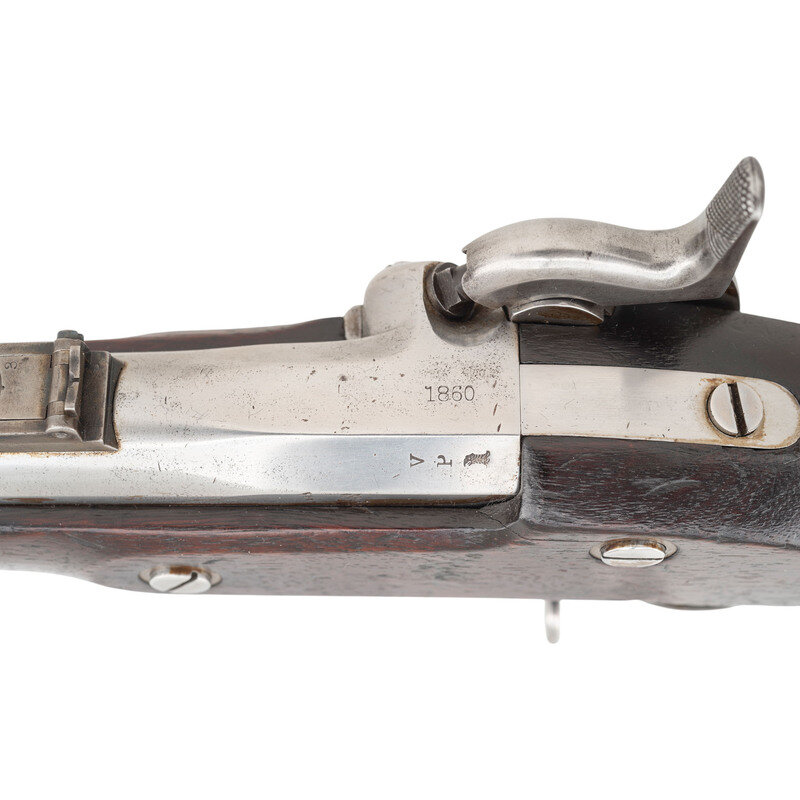 .58 caliber. 40" barrel secured by three flat, spring retained bands. NSN. Bright finish, iron furniture, full-length walnut musket stock with iron patchbox. Single shot percussion muzzleloading rifle musket with Maynard automatic tape primer, M1858 three-leaf rear sight, Barleycorn combination front sight and socket bayonet lug, sling swivels and swelled shank tulip head ramrod. Lock marked with a {Spread Winged Eagle} on the tape primer magazine door and in two lines U.S./SPRINGFIELD forward of the hammer. Dated 1860 at tail of lock and top of breech. Standard V/P/{Eagle Head} proofs on breech. No cartouches on counterpane or evidence there ever were any. A nice example of a scarce and desirable "patch box" US Model 1855 Rifle Musket produced immediately prior to the outbreak of the American Civil War. {ANTIQUE}