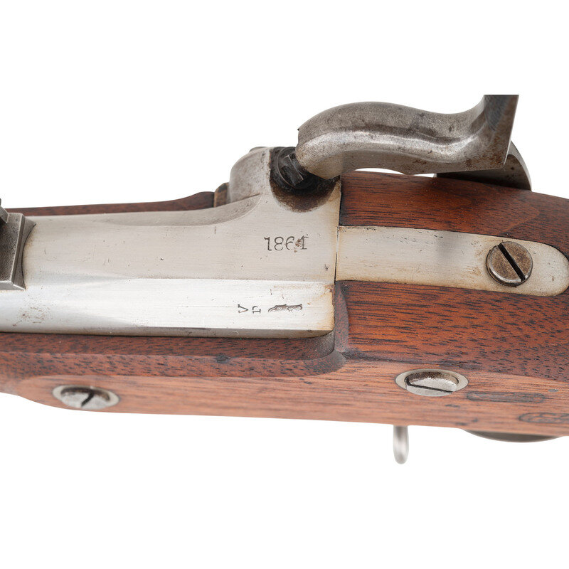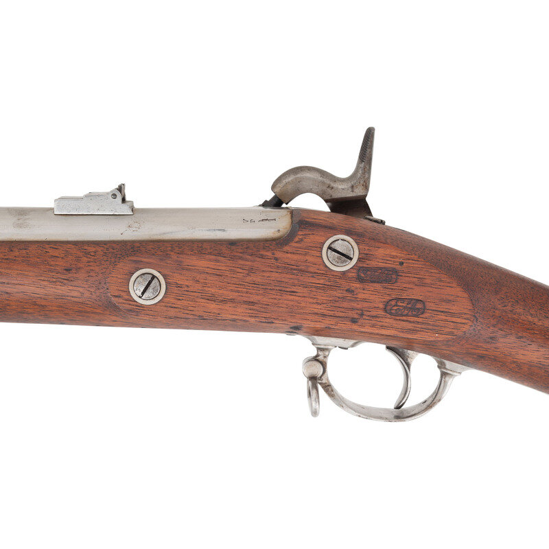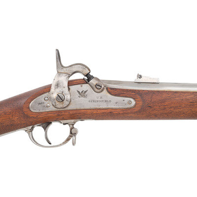 .62 caliber. 40" round barrel secured by three flat, spring-retained barrel bands. NSN. Bright finish, iron furniture, walnut stock. Single shot percussion muzzleloading rifle musket with M1861 three leaf rear sight, Barleycorn combination front sight and socket bayonet lug, sling swivels and a swelled-shank tulip head ramrod. Lock marked with a {Spread-Winged Eagle}/U.S. forward of the hammer and in two horizontal lines U.S./SPRINGFIELD and dated 1861 at the tail. Breech of barrel dated 1861 as well. Upper left breech with typical V/P/{Eagle Head}. Counterpane of stock with two inspection cartouches, the a not fully decipherable finish cartouche that appears to be the JCB of J.C. Bragg and then the script ESA of Springfield's Master Armorer Erskine S Allin. The most desirable and representative US used military long arm from the American Civil War is a Springfield produced US Model 1861 Rifle Musket. 1861 and 1862 dated examples that are correct and in good condition are quite scarce as these guns saw the brunt of the fighting for the majority of the war. Finding one of these guns in very good to fine condition is even more difficult. This 1861 dated example is correct in every way, with the exception of having been bored smooth at some point in time, but otherwise remains in very nice condition, making it a fine addition to any serious collection of Civil War small arms. {ANTIQUE}