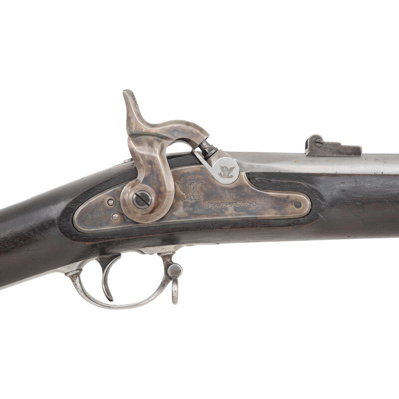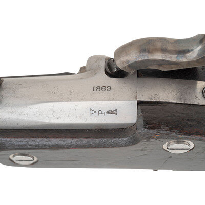 .58 caliber. 40" barrel. NSN. Bright finish, color casehardened lock, iron furniture, full length walnut musket stock. Single shot percussion ignition muzzleloading military rifle musket with solid, rounded M1864 pattern barrel bands with band springs, M1861 pattern leaf rear sight with aperture hole drilled in the 300-yard leaf for 200 yards, Barleycorn front sight and socket bayonet lug, sling swivels on the triggerguard and middle barrel band and a straight shank tulip head ramrod. Standard Springfield lock markings, dated 1863 at the tail. Breech with standard proof and inspection marks and dated 1863 as well. Two script crouches are present on the counterpane including the an illegible arsenal sub-inspector's cartouche and the ESA of Master Armorer Erskine S Allin. {ANTIQUE}