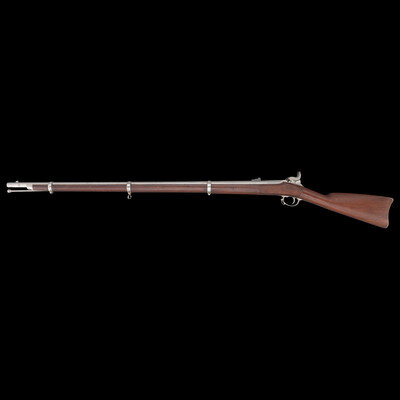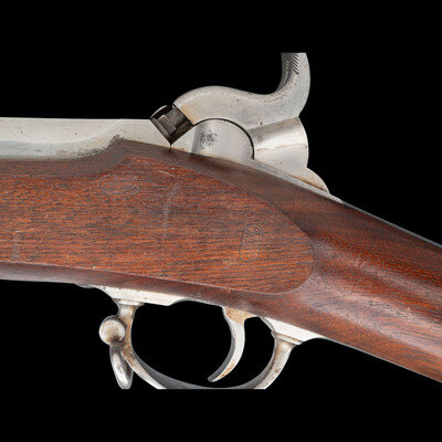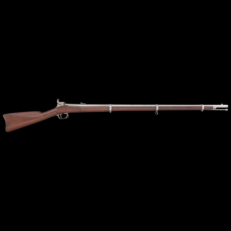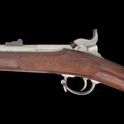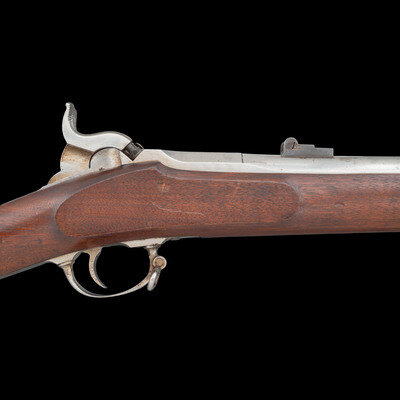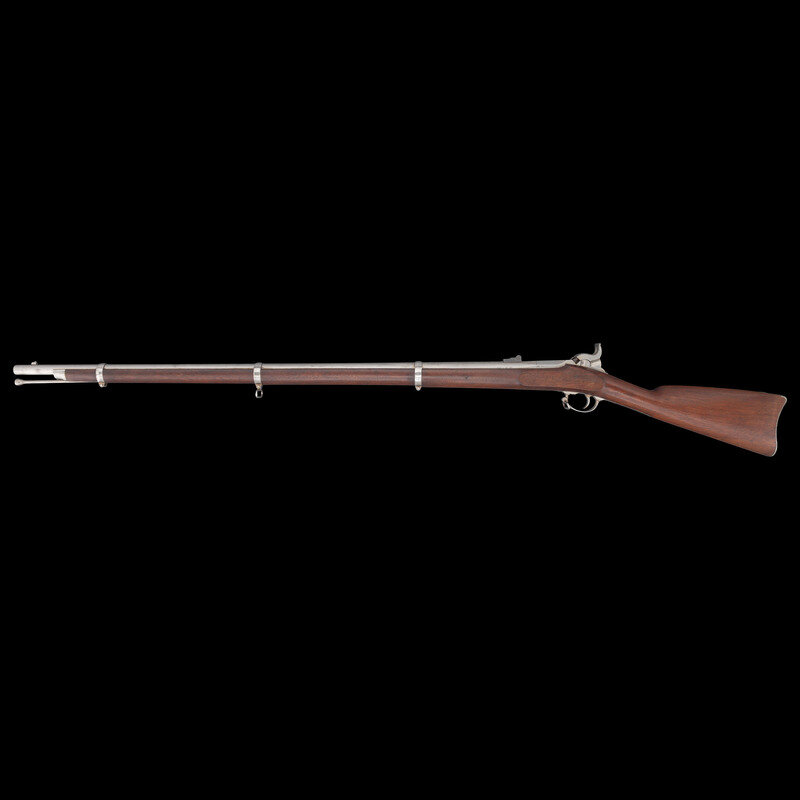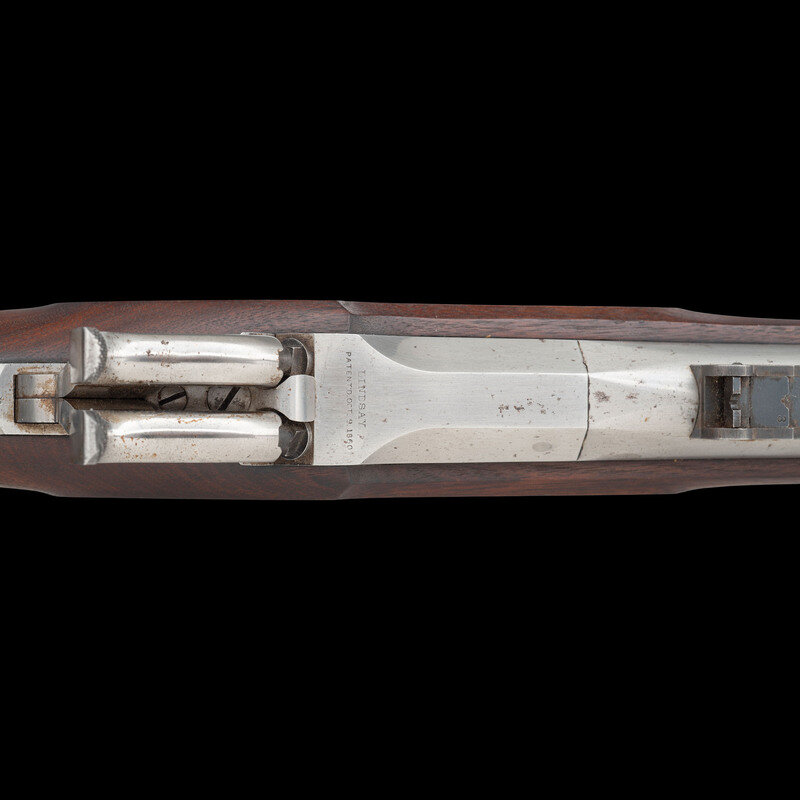 .58 caliber. 41" round barrel secured by three rounded screw clamping bands. NSN. Bright finish, iron furniture, walnut stock. Double shot, single barrel, muzzleloading superimposed load percussion rifle musket with M1861 pattern three-leaf rear sight, Barleycorn combination front sight and socket bayonet lug, sling swivels and a straight shank tulip head ramrod. Top of patent breech marked in two lines: LINDSAY/PATENTED OCT. 9, 1860. Counterpane with two crisp script ADK cartouches, the mark of arsenal sub-inspector A.D. King. Unique single trigger, double hammer mechanism that is the forerunner of the single trigger systems used on many double barrel shotguns today, with the right hammer always tripping with the first pull of the trigger and the left always falling with the second pull. Only 1,000 of these scarce and somewhat dangerous rifle muskets were produced and then procured by the Ordnance Department in 1864 and the guns were primarily issued to the 15th, 16th & 26th Michigan and 9th New Hampshire infantry regiments. Some reports from the field were of catastrophic failure, so the guns were universally reviled and some were apparently intentionally destroyed by the men they were issued to. A scarce and important Civil War long gun and a good example of how some ideas are better on paper than in practice. {ANTIQUE}