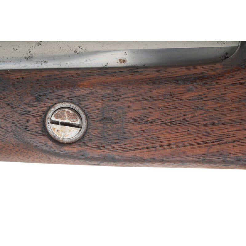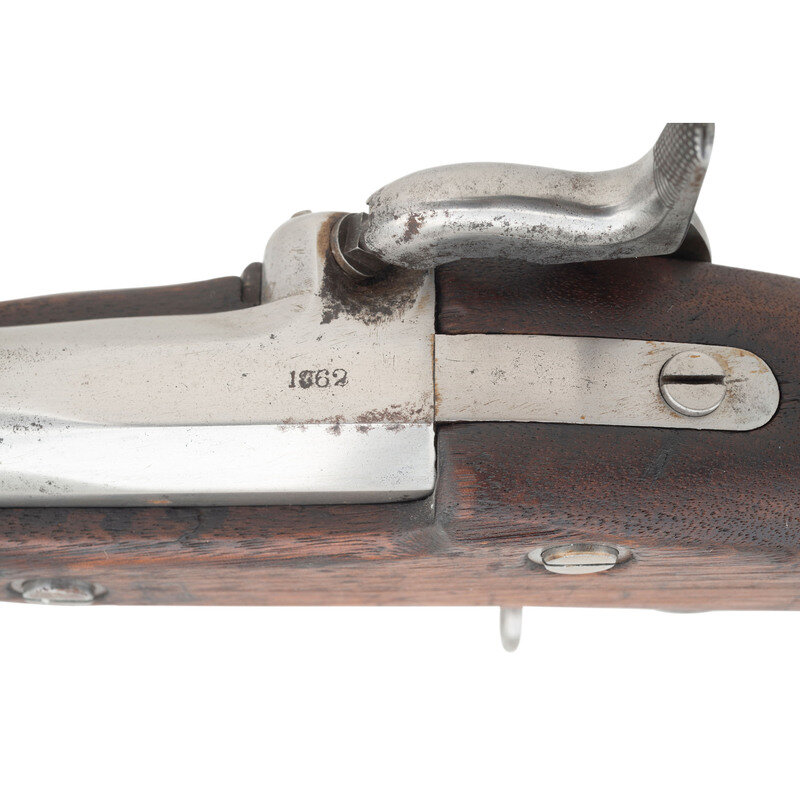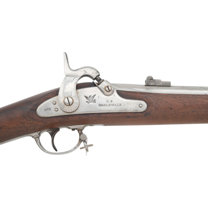 .58 caliber. 40" barrel secured by three flat, spring retained bands. NSN. Bright finish, steel furniture, walnut musket stock. Single shot percussion muzzleloading military rifle musket with M1861 pattern three leaf rear sight, Barleycorn combination front sight and socket bayonet lug, sling swivels and a swelled shank tulip head ramrod. Lock marked with a {Spread-Winged Eagle} forward of the hammer and U.S./Eagleville in two lines. Tail of lock dated 1862 horizontally with a matching 1862 date on the top of the breech. Upper left angled breech flat with standard V/P/{Eagle Head} proofs. An illegible script cartouche is present on the counterpane, behind the forward lock screw. The Eagle Manufacturing Company was established in late 1861 and received a contract to delivery 25,000 US Model 1861 Rifle Muskets at the rate of $20 each. The principles in the company were Henry Almy and James D Mowry. The firm delivered only 5,500 guns under the contract in 1863, before the firm was acquired by Mowry's newly formed Norwich Arms Company. Norwich would deliver the balance of the Eagle Mfg. Co. contract. Eagle Manufacturing was responsible one of the three smallest deliveries of US M1861 contract rifle muskets with Sarson & Roberts being the least successful contractor at 5,140 deliveries and Eagle Mfg. Co. and James Mulholland tying for the second least successful contractors with both delivering 5,500 guns. Eagleville marked muskets are particularly scarce on the collector market. {ANTIQUE}