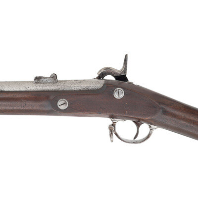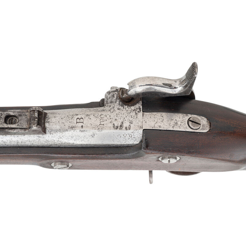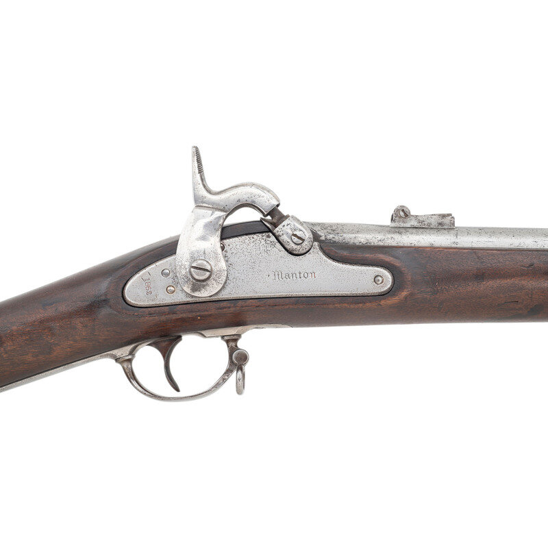 .58 caliber. 40" barrel secured by three flat, spring retained bands. SN: C83. Bright finish, iron furniture, walnut musket stock. Single shot muzzleloading percussion rifle musket with Whiteny mid-range leaf rear sight, Barleycorn combination front sight and socket bayonet lug, sling swivels and a straight shank tulip head ramrod. Lock marked in Gothic letters MANTON forward of the hammer and dated 1862 at the tail. Top of breech with B/100 rack mark as well as V and P proofs. Left angled breech flat with G.W.Q inspection mark. Barrel serial numbered C/83 behind the front sight. No cartouches on counterpane as it typical. These "Good & Serviceable" muskets produced by Whitney were of inconsistent enough quality that he did not want his own name placed on them, or for anyone to know that they were a Whitney product. Less than 2,000 were produced with the bulk being sold to Fitch & Waldo of New York, who subsequently resold them. Most use English made barrels that were acquired from Colt after Colt found out they would not be accepted for US Ordnance contract muster deliveries. As this one has "U" marked barrel bands and a G.W.Q barrel inspection, it may have started life as a Connecticut contract rifle musket that was rejected and then was repurposed as a "Manton". Other similarly marked examples are known. A scarce and interesting part of the story of Whitney's Civil War arms production and an uncommon rifle musket to find for sale. It is worth noting that the rack number B/100 is specifically listed in George Moller's American Military Shoulder Arms - Volume III in the section discussing these guns, suggesting that Mr. Moller at the very least examined this gun prior to writing his book and may have owned it. {ANTIQUE}