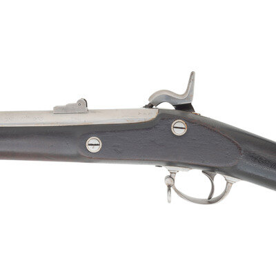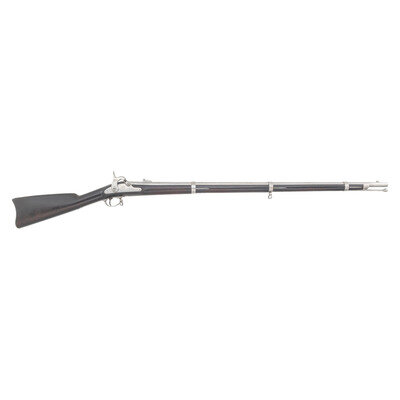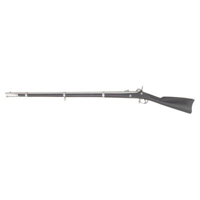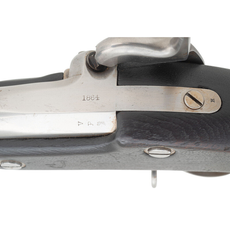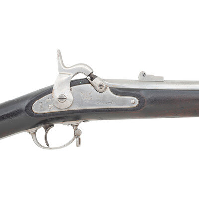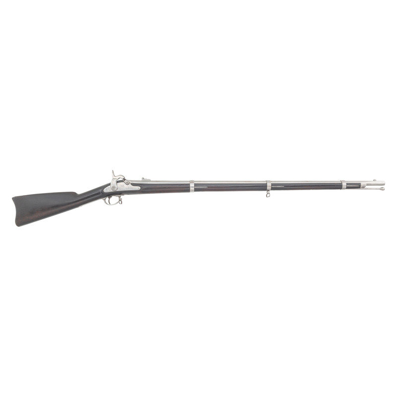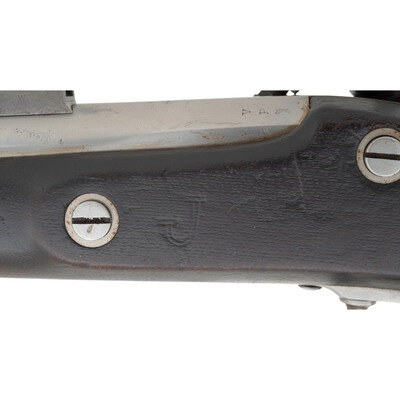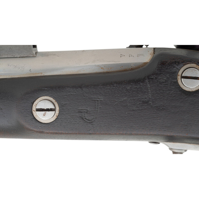 .58 caliber. 40" barrel secured by three flat spring retained bands. NSN. Bright finish, iron furniture, walnut musket stock. Single shot percussion muzzleloading rifle musket with M1861 pattern three leaf rear sight, Barleycorn combination front sight and socket bayonet lug, sling swivels and a swelled shank tulip head ramrod. Lock marked with a {Spread-Winged Eagle}/U.S. and WHITNEY-VILLE forward of the hammer and dated 1864 horizontally at the tail. Breech dated 1864 as well with the standard V/P/{Eagle Head} inspection marks on the left angled flat. A small W sub-inspection is present on the left breech flat and the outline of a worn and illegible cartouche is on the counterpane. The letter "J" is carved on the counterpane and the letters "JS" which were painted red at one time, are carved in the top of the stock comb. The majority of the Whitney production of long arms during the American Civil War were of his numerous "Good & Serviceable" arms which were "not subject to gauging" and were not fully interchangeable. However, he did receive two contracts from the US Government to produce fully interchangeable Model 1861 Rifle Muskets, one for 40,000 guns and one for 15,000 guns. Due to his facility being tied up producing US Model 1861 Navy Rifles ("Plymouth Rifles") and numerous state contracts, particularly for Connecticut, he did not deliver any guns under that contracts in a timely fashion. In the end the two contracts were combined and were reduced to 25,000 gun, of which Whitney delivered 15,000 between 1863 and 1865 with the bulk of the deliveries in 1864. {ANTIQUE}