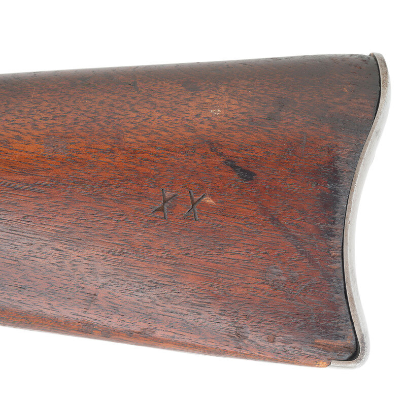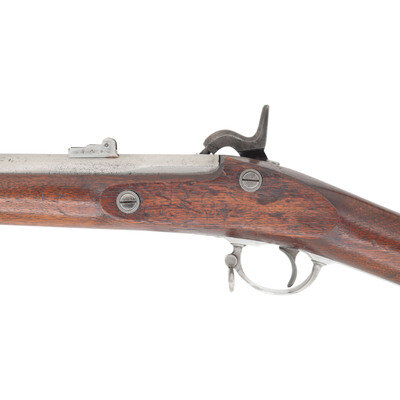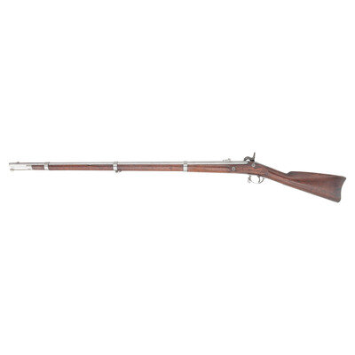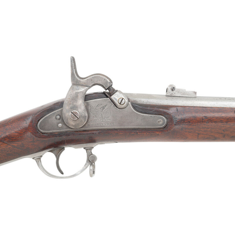 .58 caliber. 40" round barrel secured by three flat, spring-retained bands. SN: E32. Bright finish, iron furniture, including nose cap, walnut stock. Single shot muzzleloading percussion rifle musket with M1861 pattern three leaf rear sight, Barleycorn front sight and socket bayonet lug, sling swivels and a straight shank tulip head ramrod. Lock with large Whitney {Eagle, Flag & Panoply of Arms} motif over the words WHITNEY-VILLE, as found on many of his Model 1861 Navy contract rifle muskets, not dated at the rear. Barrel unmarked as is often the case on these guns, with the exception of the weak "serial number" E/32 on top, about 1.5" behind the front sight. This exact serial number is referenced in Moller's American Military Shoulder Arms Volume III in the section discussing these guns, suggesting that he either owned the gun at one time or had previously surveyed it for research purposes. No inspection marks in wood, as is typical. Flat bands with "U" markings, as is sometimes found on these guns, no "US" on butt plate tang which is typical. Bore rifled with Whitney's 7-groove pattern which is typical of many of his "Good & Serviceable" arms, and common on the earlier Connecticut contract rifle muskets. Rear sight of the M1861 pattern with three leaves, which is atypical for these guns, as is the iron forend tip. A well used but fairly scarce example of a Connecticut Contract Whitney Model 1861 Variant Rifle Musket that is a good example of the many liberties Whitney took when producing arms for state, rather than Federal contracts. Whitney delivered 8,000 of his variant M1861 Rifle Muskets to Connecticut under various contracts. {ANTIQUE}