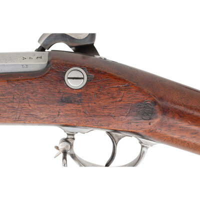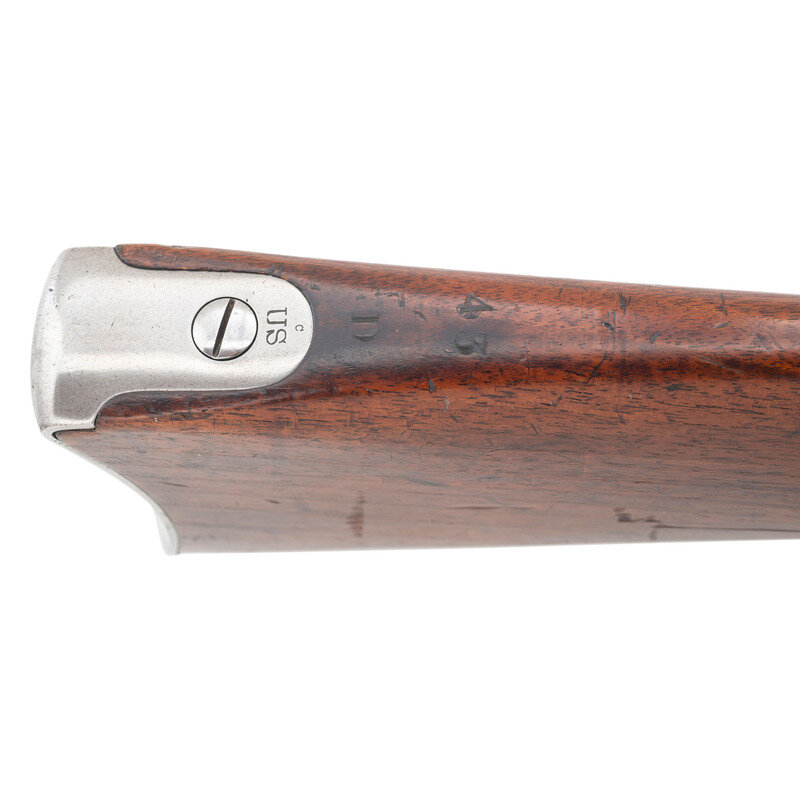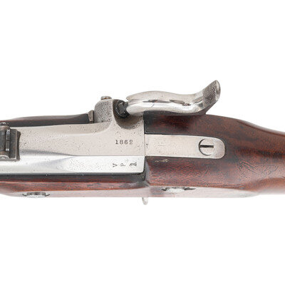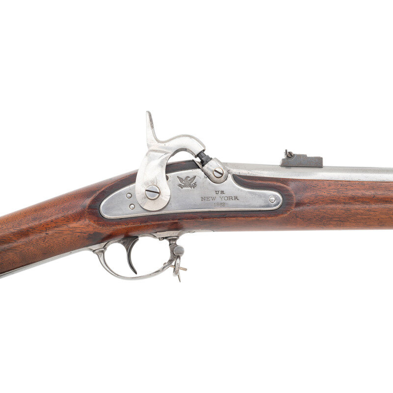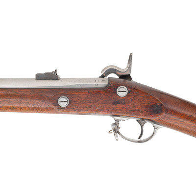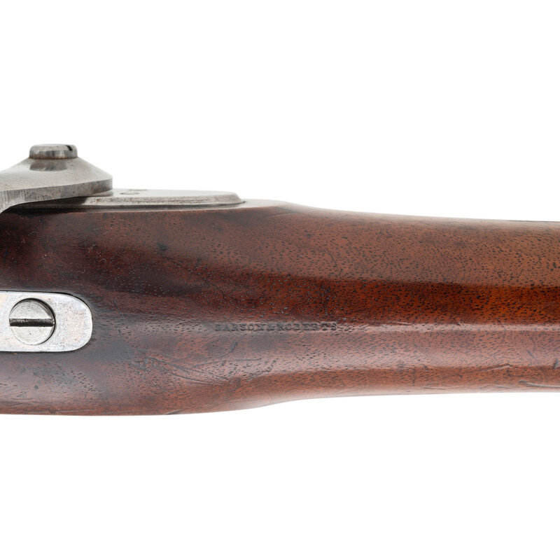 .58 caliber. 40" barrel searched by three flat, spring retained bands. NSN. Bright finish, blued rear sight, iron furniture, walnut musket stock. Single shot percussion muzzleloading military musket with correct, early M1861 production M1858 pattern three leaf rear sight, Barleycorn combination front sight and socket bayonet lug, sling swivels a swelled shank, tulip head ramrod. Lock marked with a {Spread-Winged Eagle} forward of the hammer and in three lines U.S./NEW YORK/1862. Top of breech dated 1862 as well, with standard V/P/{Eagle Head} proofs on the upper left angled breech flat. Counterpane with two crisp script cartouches, the AC of an unknown inspector and the LD of Lewis Draper, whose block LD mark is present on the left breech flat as well. Top of wrist stamped with a small, single line die SARSON & ROBERTS. Like so many of the early war contractors who intended to produce US Model 1861 Rifle Muskets, the newly formed firm of Sarson & Roberts appears to have had minimal gun manufacturing experience and hoped to secure the majority of the parts necessary to build the guns from other makers and simply assemble the guns from those parts and then deliver them to the Ordnance Department. The firm initially received a contract for 25,000 guns on August 3, 1861 at the price of $18.50 each. The contract was subsequently reduced to 20,000 guns on June 17, 1862. At that point no guns had been delivered by the firm. The first deliveries would not be made until November of 1862 and from that time until November of 1863, only 5,140 of the guns contracted for would be delivered. The delivered guns ranged in quality from 1st Class, which were paid for at the rate of $20 each to 4th Class, which were paid for at the rate of $16 each. This contract resulted in the fewest deliveries of completed arms of all the contracts that were let for M1861 rifle muskets during the war, with only James Mulholland delivering a similarly low number at 5,500 total completed guns. This is for all practical purposes the rarest of the US Model 1861 Contract Rifle Muskets produced for the Ordnance Department and appears to be all correct. {ANTIQUE}
