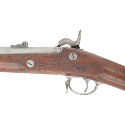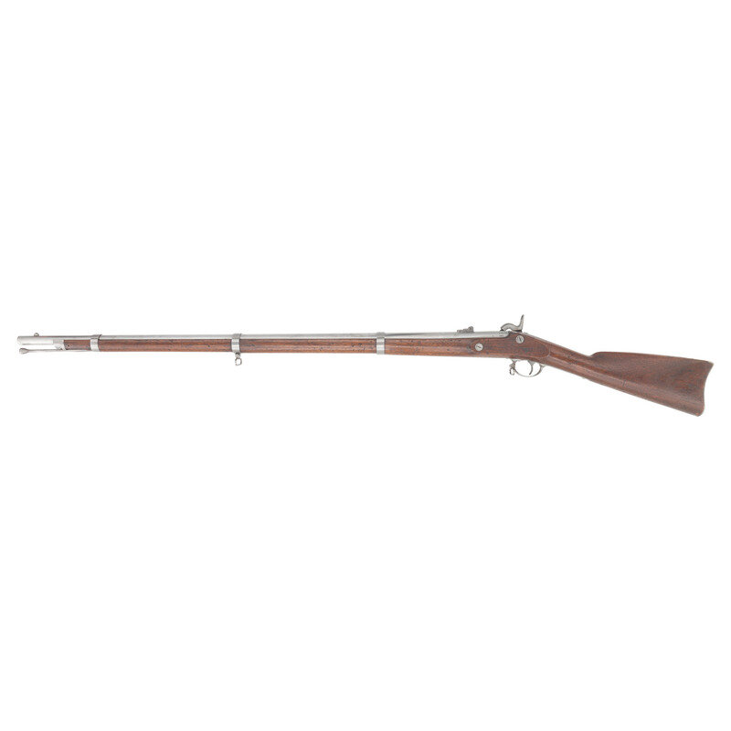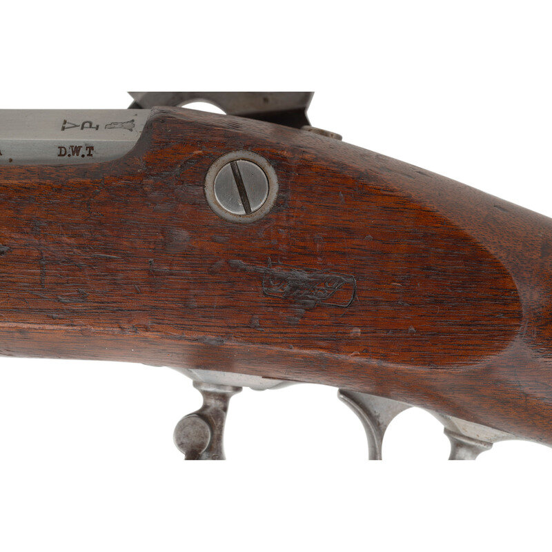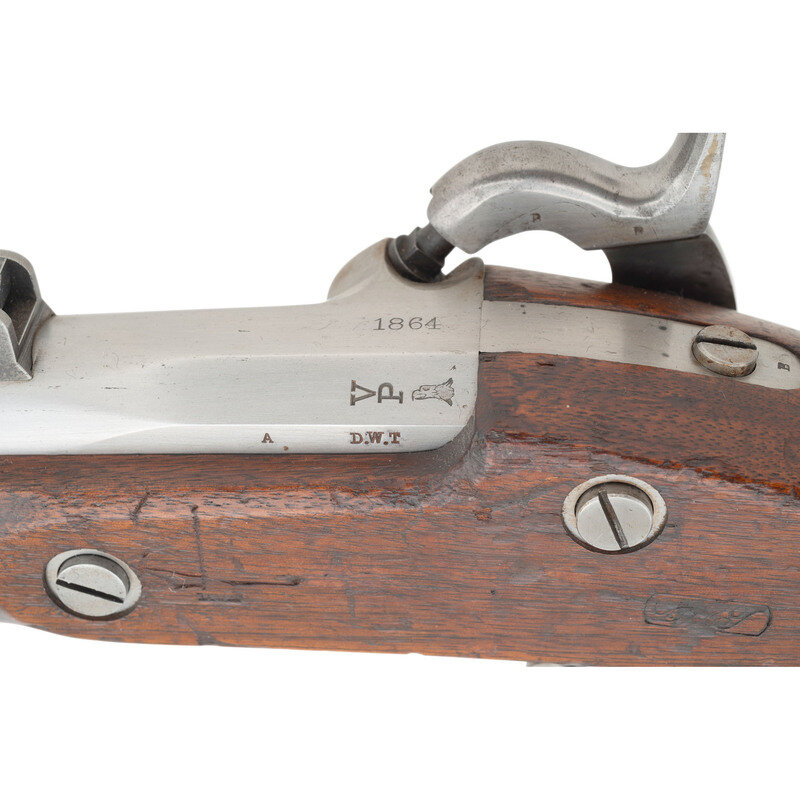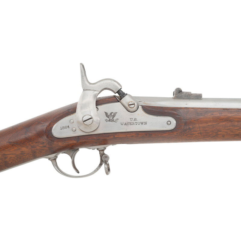 .58 caliber. 40" barrel secured by three flat, spring retained barrel bands. NSN. Bright finish, iron furniture, smooth walnut stock. Single shot percussion muzzleloading rifle musket with M1861 pattern three leaf rear sight, Barelycorn combination front sight and socket bayonet lug, sling swivels and a swelled shank tulip head ramrod. Lock marked with a {Spread-Winged Eagle} and US/ WATERTOWN forward of hammer and dated 1864 at tail. Breech with matching 1864 date and the standard V/P/{Eagle Head} barrel proofs. Left barrel flat with a block D.W.T. sub-inspection, the mark of arsenal sub-inspector Daniel W. Tyler. Counterpane with a script DWT cartouche, as well as another small block letter DWT. C.B. Hoard of Watertown, NY received a contract for 50,000 US M1861 Rifle Muskets in late 1861 and a second for 20,000 in late 1863. Between 1863 and 1865 he only managed to deliver some 12,800 guns, placing his arms in the lower half of all Civil War contract rifle musket deliveries. Of the 18 contractors who delivered some 448,314 M1861 pattern arms to the US government only six delivered fewer arms than Hoard, with eleven delivering significantly more. This is one of the scarcer Civil War contract rifle muskets and appears to be completely right in terms of configuration and inspection marks {ANTIQUE}