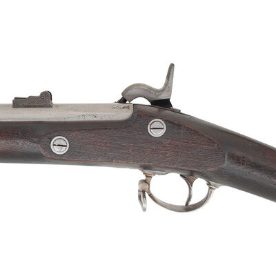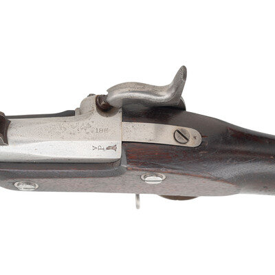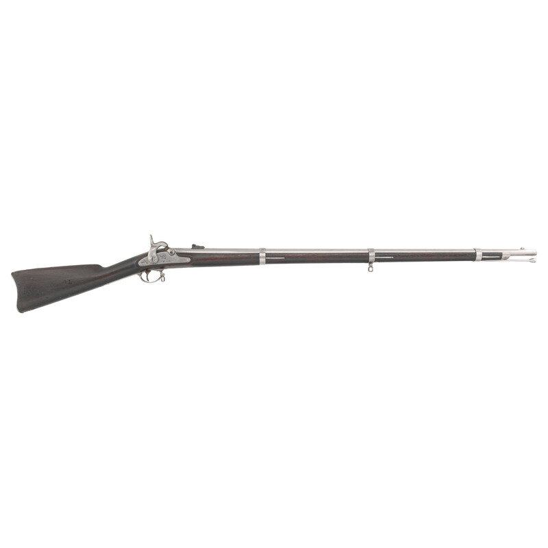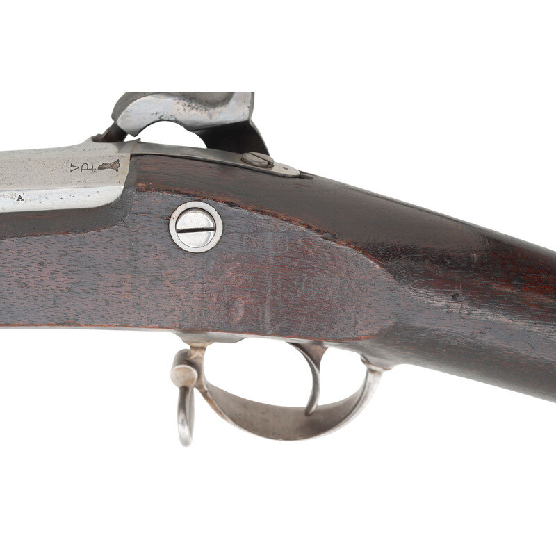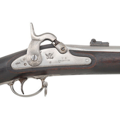 .58 caliber. 40" barrel secured by three flat, spring-retained barrel bands. NSN. Bright finish, iron furniture, walnut stock. Single shot percussion muzzleloading rifle musket with M1861 three-leaf rear sight, Barleycorn combination front sight and socket bayonet lug, sling swivel and a tulip head, swelled shank ramrod. Lock marked with a {Spread-Winged Eagle} and U.S./TRENTON forward of the hammer and dated 1864 at the tail. Breech with matching 1864 date and standard V/P/{Eagle Head} proof marks. Counterpane stamped vertically in small letters A.M. BURT and with two script cartouches that are not fully legible, with one possibly being the TAB of Theodore A. Belknap an arsenal sub-inspector of contract arms. The initials TD are carved upside down in the obverse stock of the gun. {ANTIQUE}