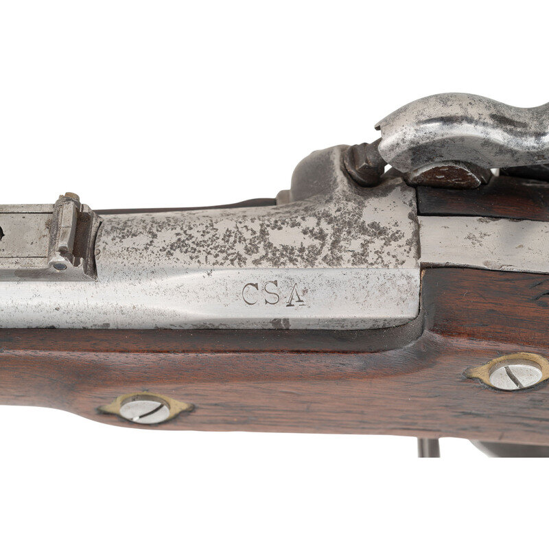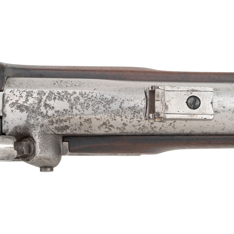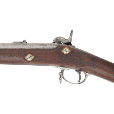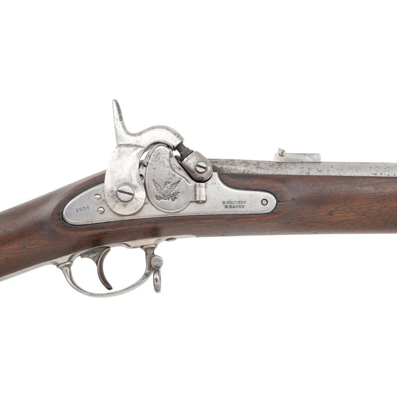 .58 caliber. 40" barrel secured by three flat, spring retained barrel bands. SN: D74. Bright finish, iron furniture, brass lock screw escutcheons, pewter forend cap, walnut stock. Single shot percussion ignition muzzleloading rifle musket with functional Maynard tape priming lock, Whitney "mid-range" folding leaf rear sight, Barleycorn combination front sight and socket bayonet lug, sling swivels and a correct style straight shank tulip head ramrod. Lock marked on the lower front in two lines E. WHITNEY/N. HAVEN and dated 1858 at the tail. Tape primer magazine door with {Spread-Winged Eagle}. A spurious CSA is stamped on the left angled breech flat. The Whitney alphanumeric serial number D/74 is stamped on the barrel, behind the rear sight. Buttplate without "US" mark, as is correct. These very rare examples of "Good & Serviceable" Whitney arms were produced using condemned Maynard tape priming locks that Whitney purchased from Harpers Ferry. Whitney had initially tried to obtain 1,000 M1855 pattern locks from Springfield in 1860, but as the M1855 was still in production, locks were not available to for. The Ordnance Department subsequently authorized the sale of as many as 1,000 M1855 pattern locks that were "damaged or otherwise unsuitable for public service" to be sold to Whitney, and in the end he obtained 350 of those locks from Harpers Ferry. He apparently obtained some other parts, primarily furniture, that was likely condemned as well. He assembled the M1855 pattern arms using the Harpers Ferry locks, other arsenal pattern parts like barrel bands, triggerguard and buttplates, and with parts acquired at the Robbins & Lawrence auction that had been intended for use in their Pattern 1853 Enfield Rifle Musket contract. The Enfield pattern parts included things like the band springs, lock screw escutcheons and front sights. Barrels were either finished Robbins & Lawrence barrels that Whitney had obtained in an unfinished state, those that he made, or some surplus US Arsenal barrels. Only 350 were produced and all were sold to the state of Connecticut. Photographic evidence suggests that nearly all of those subsequently saw use with the 8th Connecticut Infantry. A solid example of one of the rarest Civil War era contract long arms.