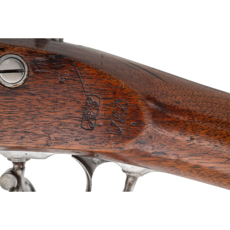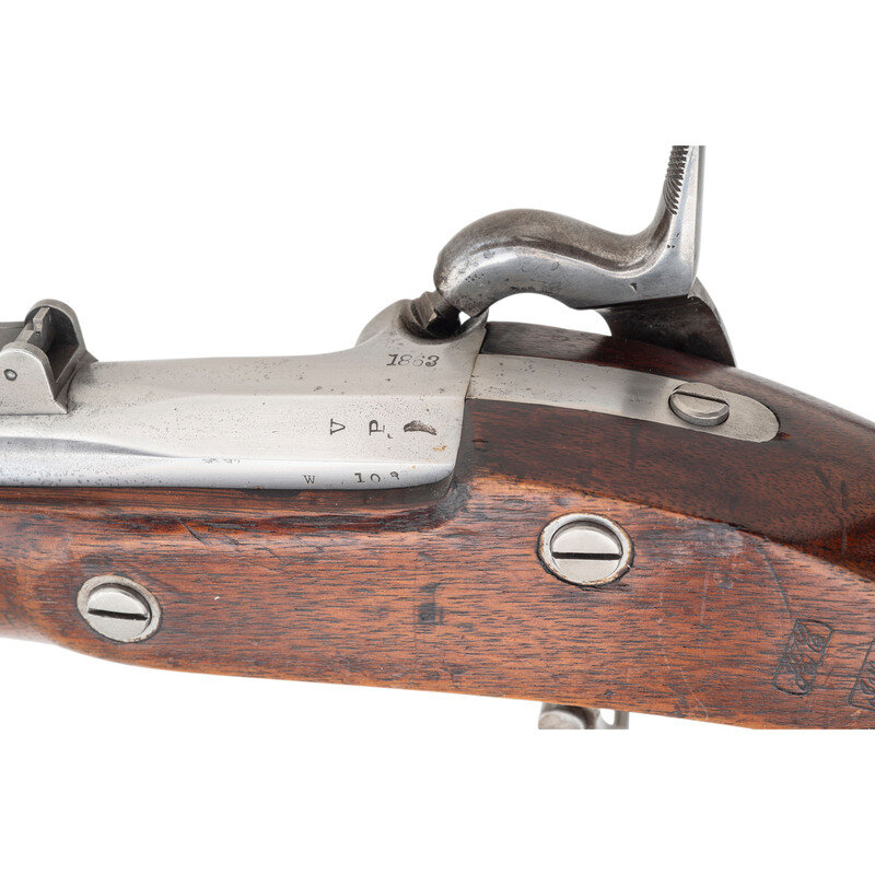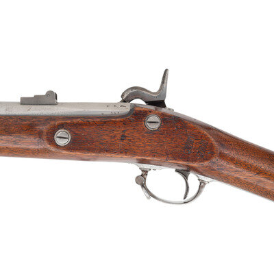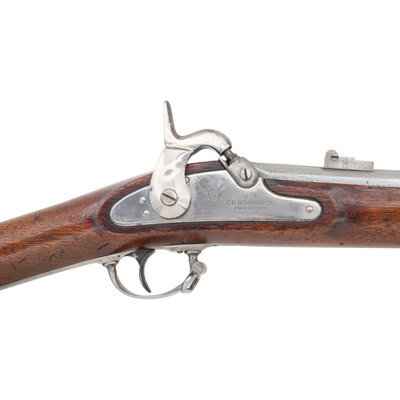 .58 caliber. 40" round barrel secured by three flat, spring-retained bands. NSN. Bright finish, iron furniture, walnut stock. Single shot percussion muzzleloading rifle musket with M1861 three leaf rear sight, Barleycorn combination front sight and socket bayonet lug, sling swivels and swelled shank tulip head ramrod. Lock marked with a {Spread-Winged Eagle} forward of the hammer and in three horizontal lines, U.S./C.D. SCHUBARTH/PROVIDENCE with the date 1863 at the tail. Top of breech with matching 1863 date and left angled flat with typical V/P/{Eagle Head} proof marks. Counterpane with two clear script cartouches, the JTC of John T Cleveland and the JHL of John H Lord. C.D. Schubarth was one of the early war speculators who sought contracts to produce rifle muskets for the United States without having either a manufactory to do it in, the machinery or experience to do the work, or any real knowledge of the firearms industry. In fact his contract appears to have been obtained via bribery and as a result he was subpoenaed to testify by the Holt-Owens Commission in June of 1862. However, a contract was secured on October 11, 1861 for 20,000 Model 1861 Rifle Muskets and by November 26 had been increased to a total of 50,000 guns. Shcubarth relied entirely on contractors and jobbers to provide his parts with well-known contractors like Alfred Jenks and Providence Tool making many of the components and the Norwich Arms Company believed to have manufactured complete guns for Schubarth. Of the 50,0000 guns contracted for, Schubarth only delivered 9,500; 500 in 1862 and the balance in 1863. It is believed that only about 500 were delivered with the Schubarth name on the lock (See Moller, Volume III page 305). Schubarth's contract expired before he had delivered 20% of the guns and it was not renewed or extended. Today Schubarth contract arms, particularly those with a Schubarth marked lock are extremely rare on the collector market. In fact, based on a statistical analysis of the contract arms delivered during the American Civil War, Schubarth marked Model 1861 Rifle Muskets only represent approximately one-tenth of 1% of all Model 1861/63 contract arms delivered. This is one of those very rare guns that appears to be as delivered by Schubarth, with correct barrel markings and cartouches and not simply a Schubarth marked lock in a gun produced by another contractor. {ANTIQUE}