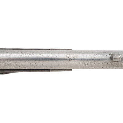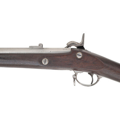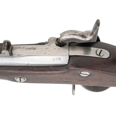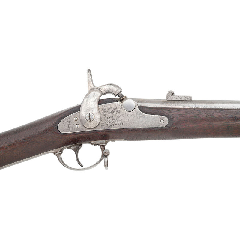 .58 caliber. 40" barrel secured by three flat, spring-retained bands. SN: A15. Bright finish, iron furniture, pewter nose cap, full length walnut musket stock. Single shot percussion muzzleloading rifle musket with Whitney's "mid range" leaf rear sight, musket pattern combination front sight and socket bayonet lug, sling swivels and a straight shank, tulip head ramrod. Flat milled lock without beveled edges is stamped with a {Spread-Winged Eagle} over a {Panoply of Flags} over the word WHITNEYVILLE forward of the hammer and dated 1863 vertically at the tail. No date or markings on top of breech, left angled breech flat with G.W.Q Whitney inspection mark. Unmarked bolster with a very slightly convex face, essentially milled flat as well. These interesting arms were made in fairly small numbers, with surviving records indicating that only about 700 were made of both "Direct Vent" variations. Most of these guns used English made barrels that had been ordered by Colt but were found unacceptable for use on US Government contract arms as the short bolsters did not line up correctly with regulation locks. Whitney obtained the barrels and found that by milling the locks thinner with an essentially flat profile and by using a hammer with a very slightly offset neck, the barrels could be made serviceable. These guns were sold on the open market to retailer Fitch & Waldo who subsequently sold them to whoever would buy them. A scare secondary martial arm from the American Civil War. {ANTIQUE}