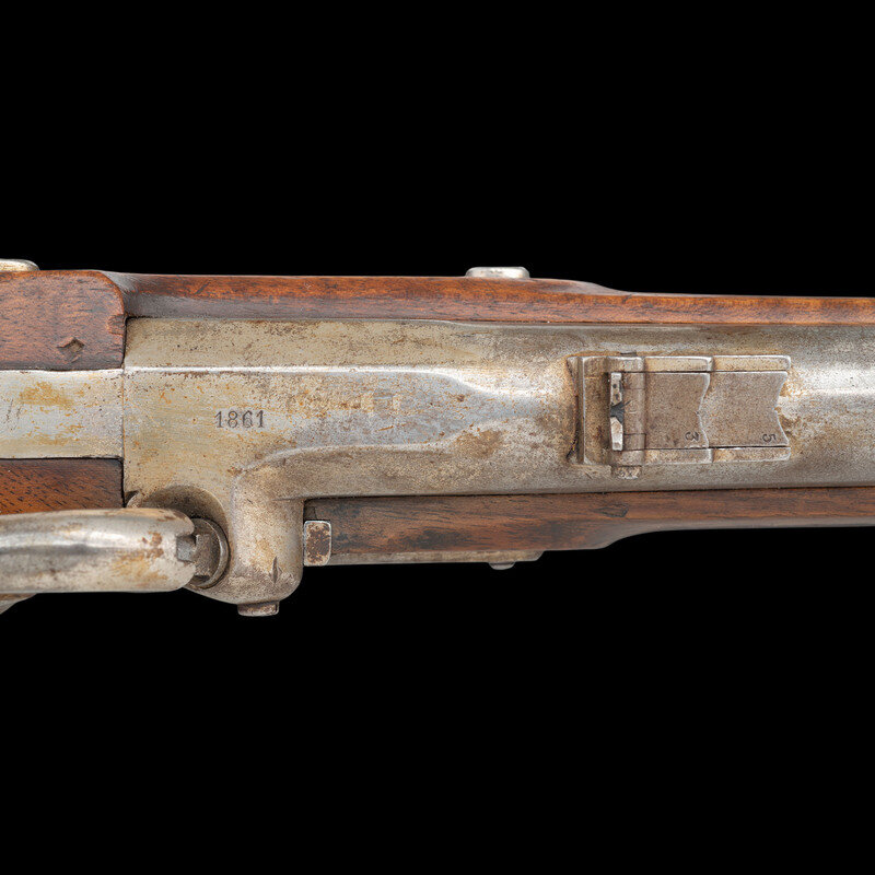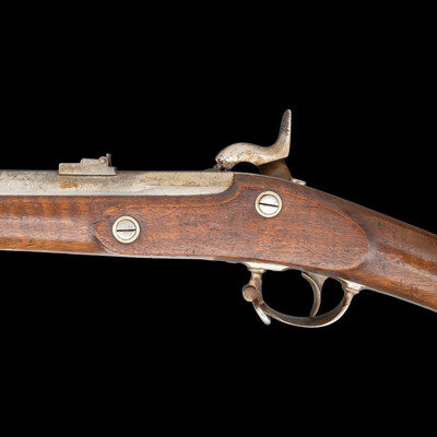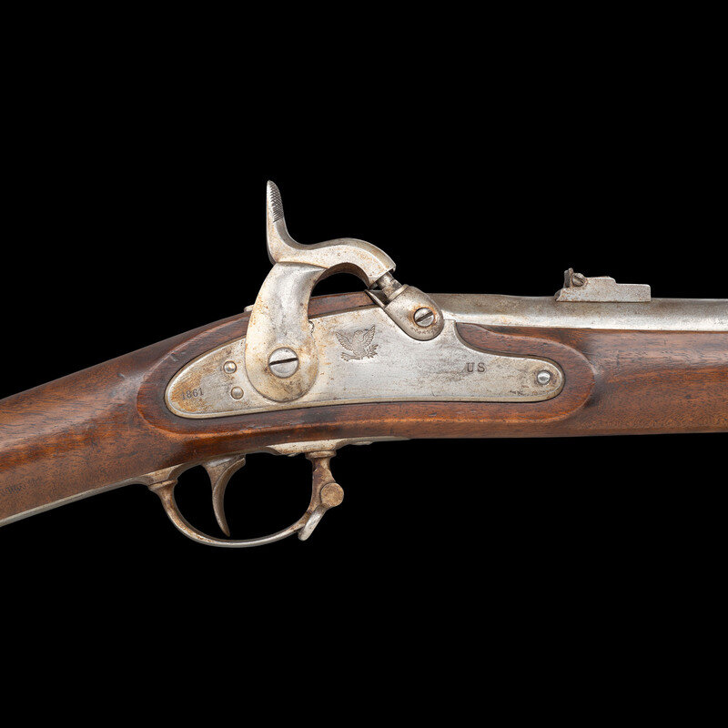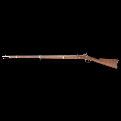 .58 caliber. 40" round barrel secured by three flat, spring-retained barrel bands. SN: 19. Tinned finish, iron furniture, European hardwood stock. Single shot percussion muzzleloading rifle musket with correct M1858 pattern three-leaf rear sight, Barleycorn combination front sight and socket bayonet lug, sling swivels and the original matching swelled shank tulip head ramrod. Lock marked with a {Spread-Winged Eagle} forward of the hammer and with US at the front of the lock. Tail of the lock dated 1861 with breech dated 1861 as well. US on buttplate and small U marks for "up" on barrel bands. Assembly numbered 19 on all major components, including inside the lock and hammer neck, under the barrel, under the breech plug, on the barrel bands, on the nose cap, inside the triggerguard bow, under the rear sight base, on the necks of the lock and tang screws and on the swell of the ramrod. Bottom of barrel additionally marked SUHL with additional depressed maker marks. As noted the gun retains correct original 1858 pattern "curved wing" rear sight. It is worth noting that the handful of very high condition examples of these guns that survive in collections today have a tinned finish, suggesting that they were originally delivered that way. This is a wonderful condition example of one of the rarest of Civil War import arms and a gun that is the missing from the majority of even the most advanced Civil War musket collections. Of all the imported arms utilized by the US government during the American Civil War, the "SUHL" Contract Model 1861 Rifle Musket is probably one of the most desirable and most difficult to obtain for a collection. In fact, the authors of Firearms from Europe (2nd Edition) describe the gun as "one of the rarest of all Civil War weapons" and further note that "only a handful are known to exist." The details regarding these handmade Germanic copies of the US Model 1861 Rifle Musket are not particularly clear, but it appears that the guns were produced by Christian Funk of Suhl, which was located in the German state of Thuringia. The guns were most likely imported by William Hahn of New York. According to US Ordnance Document records, Hahn delivered "German Muskets, Springfield Pattern", at prices that ranged from $14.50 to $16.50 each. The deliveries were made in two lots, with 179 being delivered March 7, 1862 and the balance of 302 being delivered on July 15, 1862. Schuyler, Hartley & Graham of New York delivered an additional 400 "Suhl Rifles" and "Suhl Rifle-Muskets" to the US Government between February 17 and March 10 of 1862. However, the pattern of these arms is not noted in the delivery documents. The majority of the rifle-muskets of Germanic origin that were delivered by Schuyler, Hartley & Graham were of the Enfield pattern, making it likely that these 400 guns of "unspecified pattern" were also of the Enfield pattern and not Model 1861 types. This is simply a great example of one of the rarest of Civil War import long arms that is all original and correct, down to the matching numbered ramrod. {ANTIQUE}