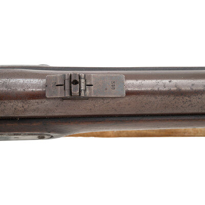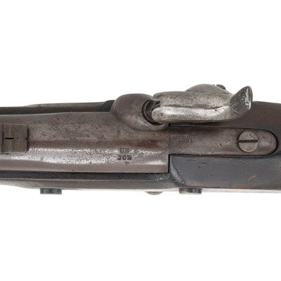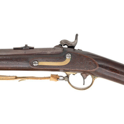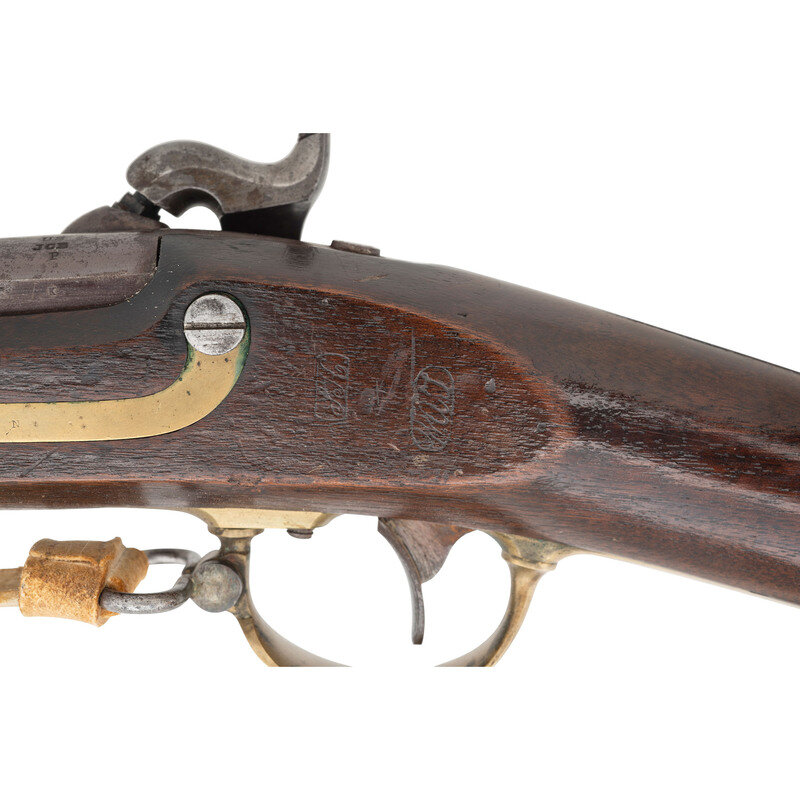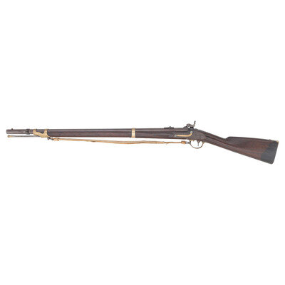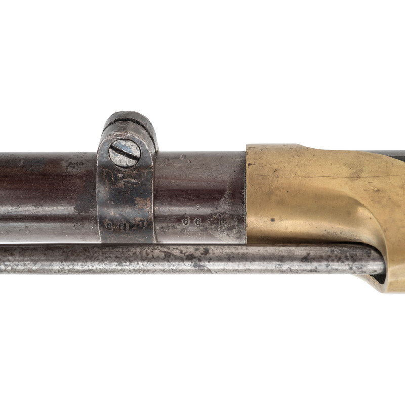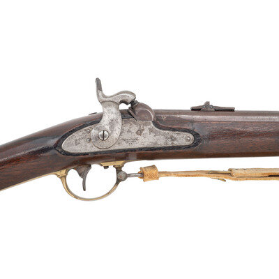 .58 caliber. 33" round barrel secured by two flat brass spring-retained clamping bands. SN: 1499. Browned barrel, color casehardened lock, brass furniture, smooth walnut stock. Muzzleloading percussion rifle modified by Colt. Lock marked REMINGTON'S/HERKIMER/N.Y. in three horizontal lines under the bolster and in two vertical lines at the tail US/1849. Breech plug tang dated 1851 with the upper left quadrant of the breech stamped with US/JCB/P inspections. The counterpane opposite the lock is stamped with two crisp script cartouches, the SK of arsenal sub-inspector Samuel Knous and the WAT of Ordnance Officer William Anderson Thornton. Colt installed Saber bayonet adapter ring numbered 1499 with the bottom of the barrel numbered to match. Rifle retains the original brass blade front sight, the Colt added rear flip up leaf rear sight, both sling swivels and an original full-length trumpet-head brass tipped ramrod with good threads. This rifle is one of the 10,411 purchased by Colt from the US Ordnance Department in 1861 for $10 each and which he subsequently resold to them for $18.50 each. The "alterations" that Colt performed were to rebore the rifles to .58 from their original .54 caliber configuration, and although he had offered to re-rifle them, few extant examples show the 3-groove rifling that Colt would have used, but rather nearly all retain the original 7-groove rifling from their .54 caliber round ball original manufacture, as does this one. Colt also equipped the guns with the three-leaf sight that was used on his Model 1855 Revolving Carbines and added a muzzle ring with bayonet lug to accept a brass handled saber bayonet. The rings and the bottoms of the barrels were both numbered to match when the alterations took place. As the Mississippi Rifle was produced on the principle of interchangeable parts, barrels were often swapped from their original host guns and installed in other guns, as the barrel was the part that had to be removed and machined as part of the upgrade process. These rifles were issued to a variety of US military units during the early days of the American Civil War and while they survive in reasonably good numbers for collectors to acquire today, rarely do they appear for sale in such nice condition or with matching numbers on the bayonet ring and barrel. The rifle retains an original period white buff leather sling with an illegible maker's and inspector's mark. {ANTIQUE}