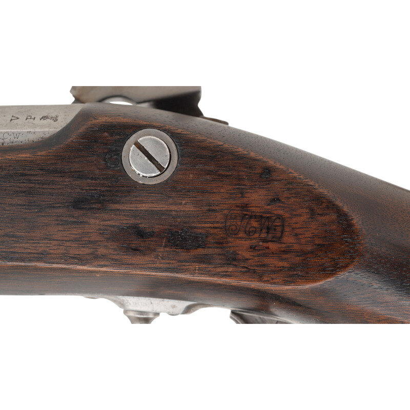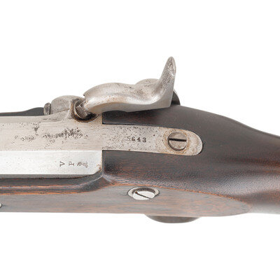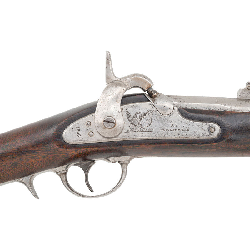 .69 caliber. 34" barrel. SN: 5643. Bright finish, steel furniture, walnut stock with two flat, spring-retained barrel bands. Single shot percussion muzzleloading Naval Rifle with 1,000 yard ladder rear sight, front sight blade, saber bayonet lug on right of barrel near muzzle, sling swivels and heavy cupped head ramrod. Lock marked with a a large {Spread-Winged Eagle} with flag and shield motifs and U.S./WHITENY-VILLE forward of the hammer, dated 1863 at the tail. Breech with matching 1863 date. Standard V/P/{Eagle Head} inspections at breech. Tang with serial number. Correct script FCW cartouche on counterpane. Based upon the French Model 1849 Chasseurs de Vincennes rifles for the French light infantry, these large bore, sturdy rifles were produced on contract for the US Navy by Whitney circa 1861-1864 with 10,000 produced. Roughly half saw Civil War service, with the remainder staying in storage at various US Navy yards. In an interesting footnote, at least a handful of these guns were acquired by the OSS during World War II for use by indigenous guerrilla fighters in the Pacific and CBI theaters of operation. This is probably the only example of a Civil War era firearm seeing service during World War II. {ANTIQUE}
