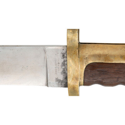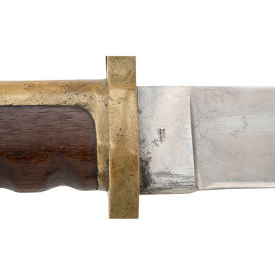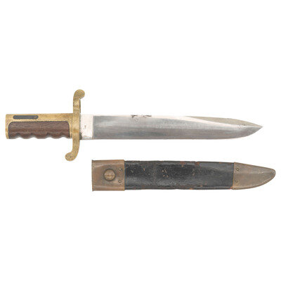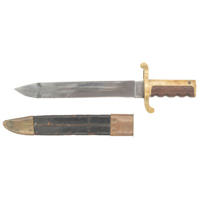 12" unfullered single-edged spear point blade, 1.63" wide at ricasso. Overall length 16.625". 4.75" brass hilt mounted with a muzzle ring with cock's comb and a rearwards swept lower quillon. Flat pommel cap is unmarked, correct for these early production Dahlgren bayonets. Hilt with wood grip with finger grooves. Reverse ricasso marked AMES MFG Co/CHICOPEE and obverse is dated 1861. No other markings are present. These early delivery bayonets did not receive Daniel Reynolds inspection marks. Second style grip retention system with a screw in the mortise cut, rather than pins. Bayonet is accompanied by its original brass mourned leather scabbard. A very nice example of an early war dated Dahlgren Bayonet.