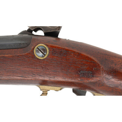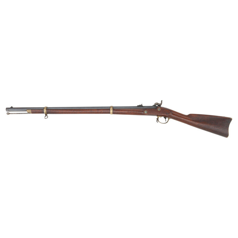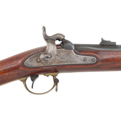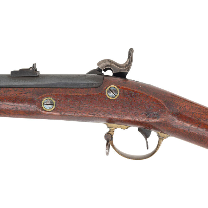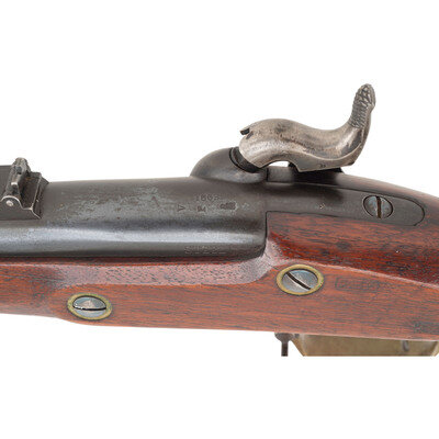 .58 caliber. 33" barrel. NSN. Blued finish, color casehardened lock, brass furniture, walnut stock with brass patchbox and two round brass spring-retained barrel bands. Single shot percussion muzzleloading military rifle with a hybrid pattern 1858/1861 three leaf rear sight, front sight blade, saber bayonet lug on right of barrel near muzzle, sling swivels and a tulip head, straight shank ramrod. Lock marked with a {Spread-Winged Eagle} and REMINGTON'S/ILION, NY forward of the hammer and dated 1863 at the tail. Breech with matching 1863 date and standard V/P/{Eagle Head} proof marks. Counterpane with correct script HSL and BH cartouches. The Model 1862 Rifle was a simplified version of the Harpers Ferry M1855 Rifle, which omitted the Maynard automatic tape priming lock. Remington delivered 10,001 of the rifles under contract to the US Government between April of 1863 and January of 1864. However the guns were never issued. The guns remained in US arsenal storage, initially at Watervliet and later New York Arsenal until their sale to Francis Bannerman & Sons on August 8, 1907 for .$0.54 cents each, a far cry from the original contract price of $17 each, including the saber bayonet. These were probably the most aesthetically pleasing rifles to be produced for the US Ordnance Department during the American Civil War. {ANTIQUE}