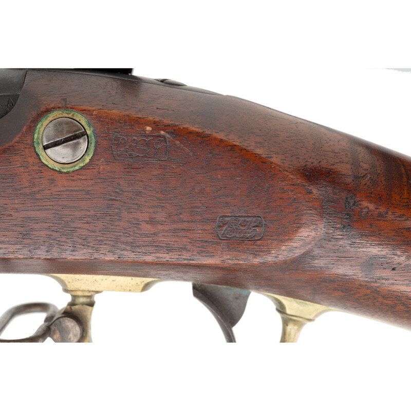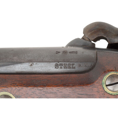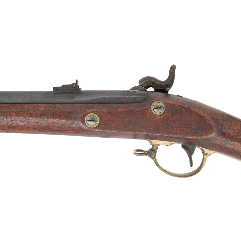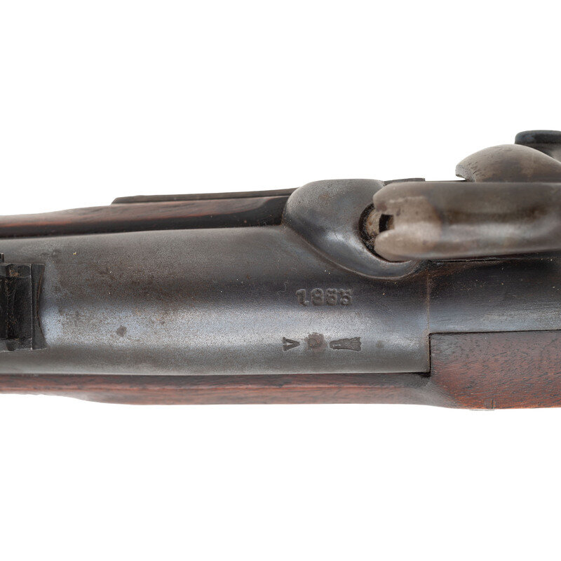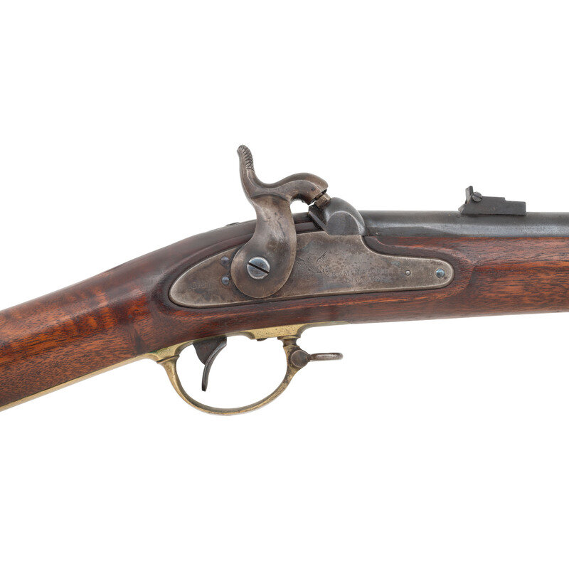 .58 caliber. 33" barrel. NSN. Blued finish, color casehardened lock, brass furniture, walnut stock with brass patchbox and two round brass spring-retained barrel bands. Single shot percussion muzzleloading military rifle with a hybrid pattern 1858/1861 three leaf rear sight, front sight blade, saber bayonet lug on right of barrel near muzzle, sling swivels and a tulip head, straight shank ramrod. Lock marked with a {Spread-Winged Eagle} and REMINGTON'S/ILION, NY forward of the hammer and dated 1863 at the tail. Breech with matching 1863 date and standard V/P/{Eagle Head} proof marks. Counterpane with correct script HSL and BH cartouches. The Model 1862 Rifle was a simplified version of the Harpers Ferry M1855 Rifle, which omitted the Maynard automatic tape priming lock. Remington delivered 10,001 of the rifles under contract to the US Government between April of 1863 and January of 1864. However the guns were never issued. The guns remained in US arsenal storage, initially at Watervliet and later New York Arsenal until their sale to Francis Bannerman & Sons on August 8, 1907 for .$0.54 cents each, a far cry from the original contract price of $17 each, including the saber bayonet. These were probably the most aesthetically pleasing rifles to be produced for the US Ordnance Department during the American Civil War. {ANTIQUE}