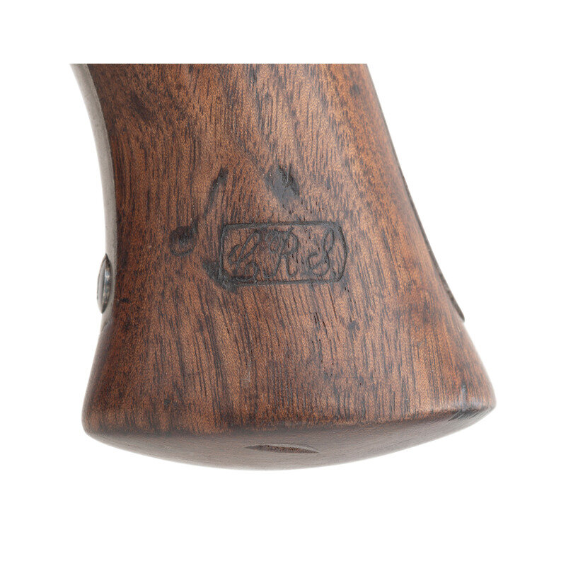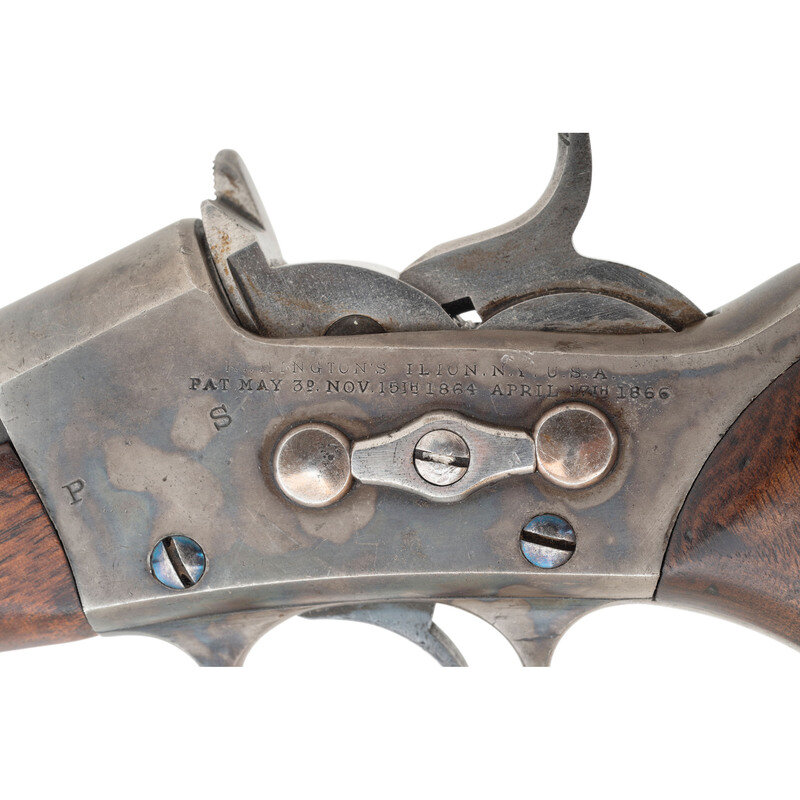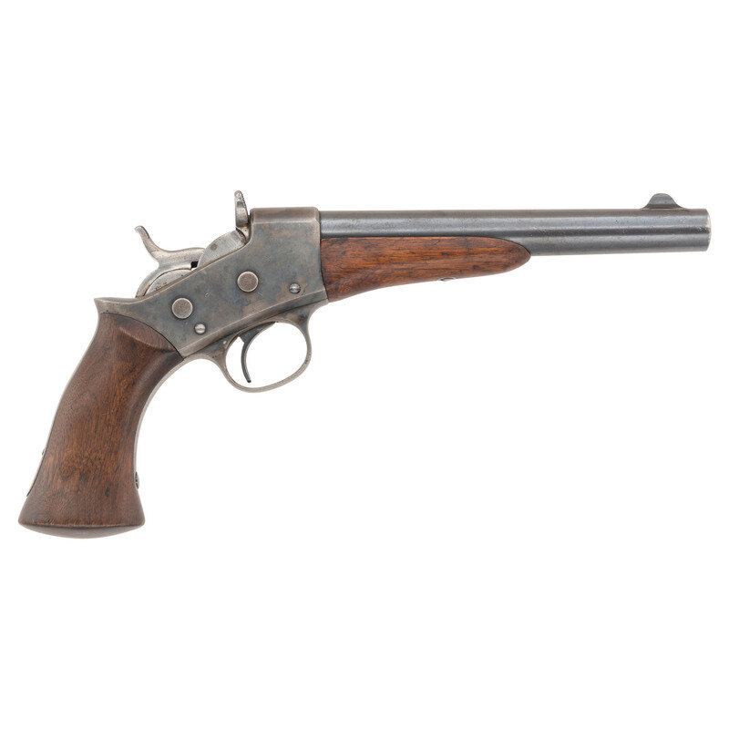 .50-25 Centerfire. 8" barrel length. NSN. Blued and color casehardened finish, smooth walnut forend and grip. Single-shot rolling bock pistol with front blade sight and rear notch cut into top of breechblock. Left with "P" and "S" inspection marks and marked in two lines: REMINGTON'S ILION. N.Y. U.S.A./PAT. MAY 3D. NOV. 5TH 1864. APRIL 17TH 1866. The top line of the marking is rolled very lightly. Left grip with a clear script CRS inspector's cartouche, the mark of arsenal sub-inspector of Curtis R. Stickney. In 1871 the US Army acquired 5,000 of these single shot pistols from Remington by trading in 5,000 Remington New Model Army percussion revolvers in payment. The single shot pistols proved to be impractical for use on the expanding western frontier and were quickly abounded in favor or the new Colt Single Action Army Revolver in 1873. {ANTIQUE}