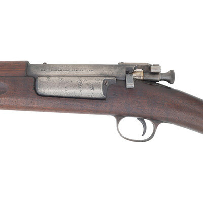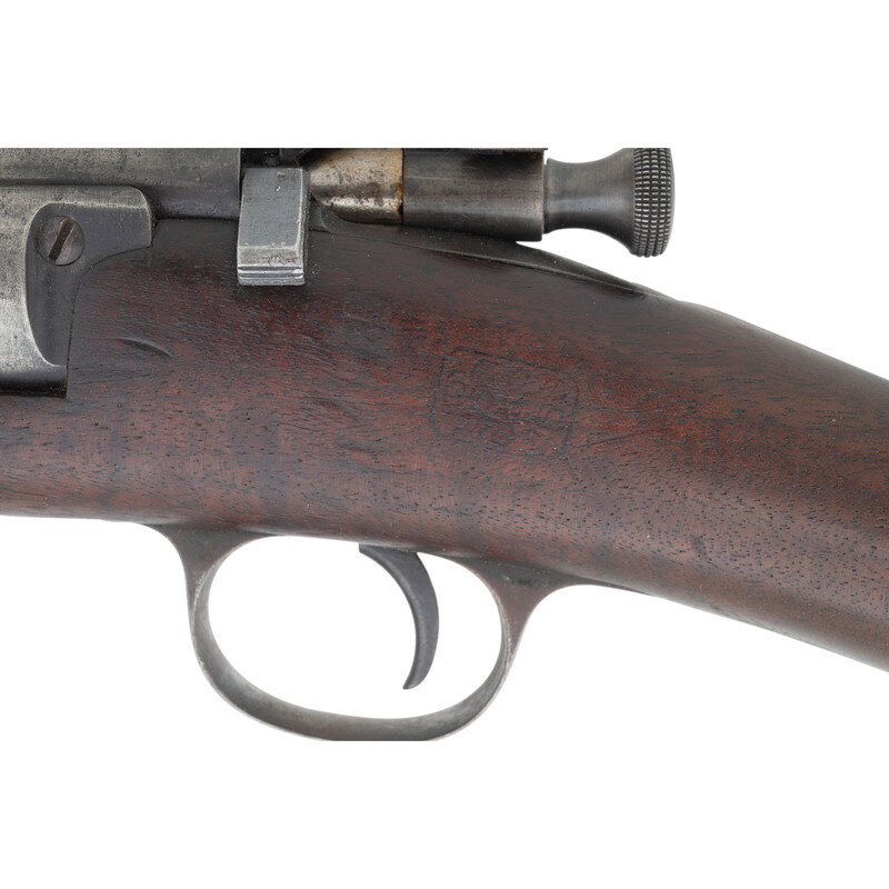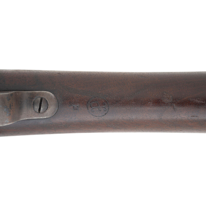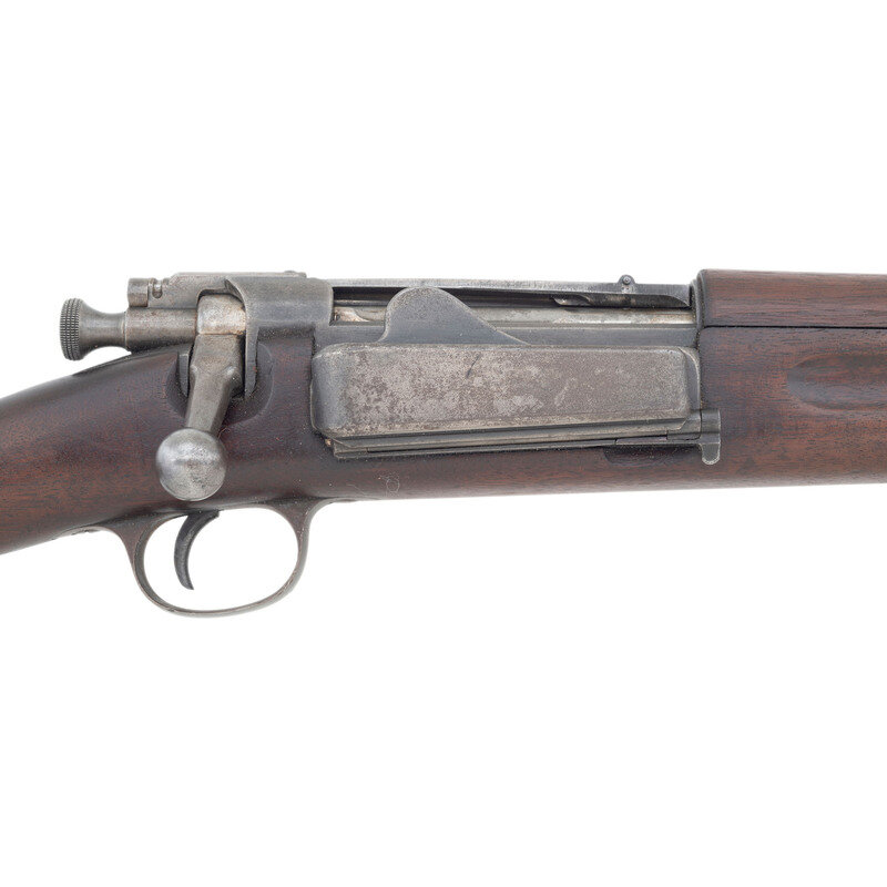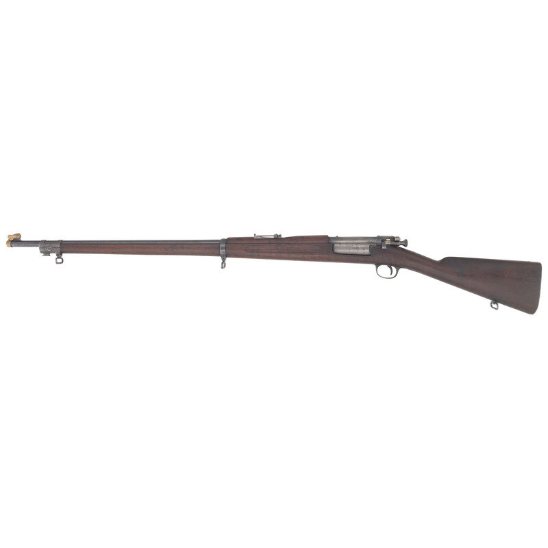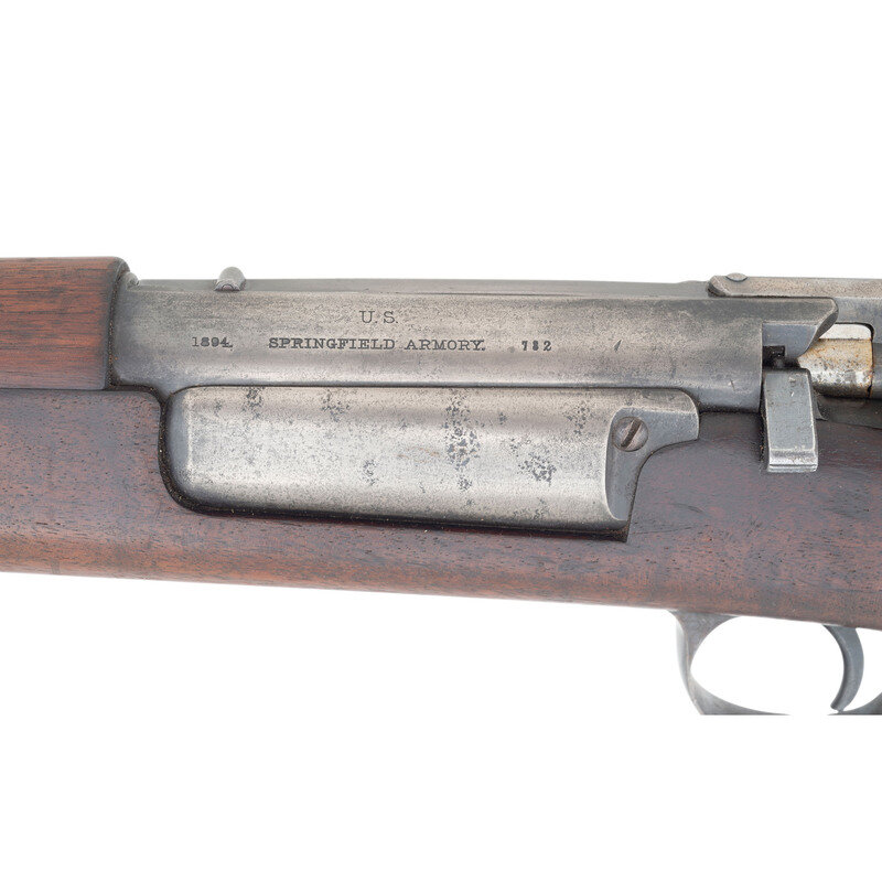 .30-40 Krag. 30" barrel length. SN: 782. Blued metal arsenal refinish with polished bolt and internals mounting a sanded full length walnut straight wrist stock and half length upper handguard. Bolt action internal magazine fed repeating rifle charged with loose rounds through a hinged magazine in obverse frame. Sights consist of an adjustable ladder rear notch and pinned front blade. Left receiver is marked U.S./1894 SPRINGFIELD ARMORY. followed by the serial number. Wrist shows a Circle P mark below E initial. Left wrist exhibits a weak JSA/1897 cartouche of inspector Joseph S. Adams. The original rod forend was cut and filled in at the arsenal with the wood shim secured by two transverse wood pegs. As part of its arsenal conversion, the butt was drilled for the rod and cleaning kit storage compartment, and the muzzle crowned. Upper barrel band replaced with the model 1896 variant. Item retains triple sling loops, and comes with a brass sight and muzzle cover. Trapdoor butt contains an oiler but no cleaning rod. {ANTIQUE}
