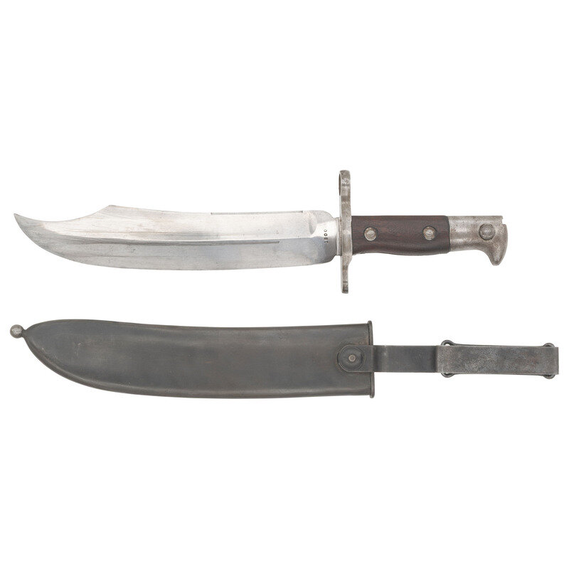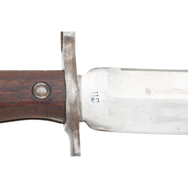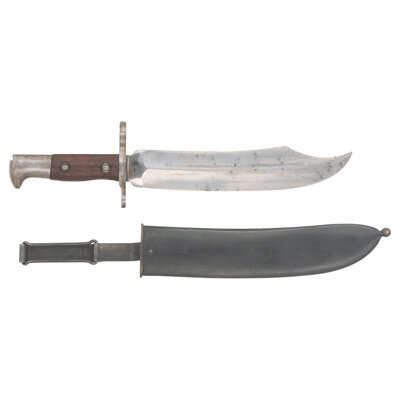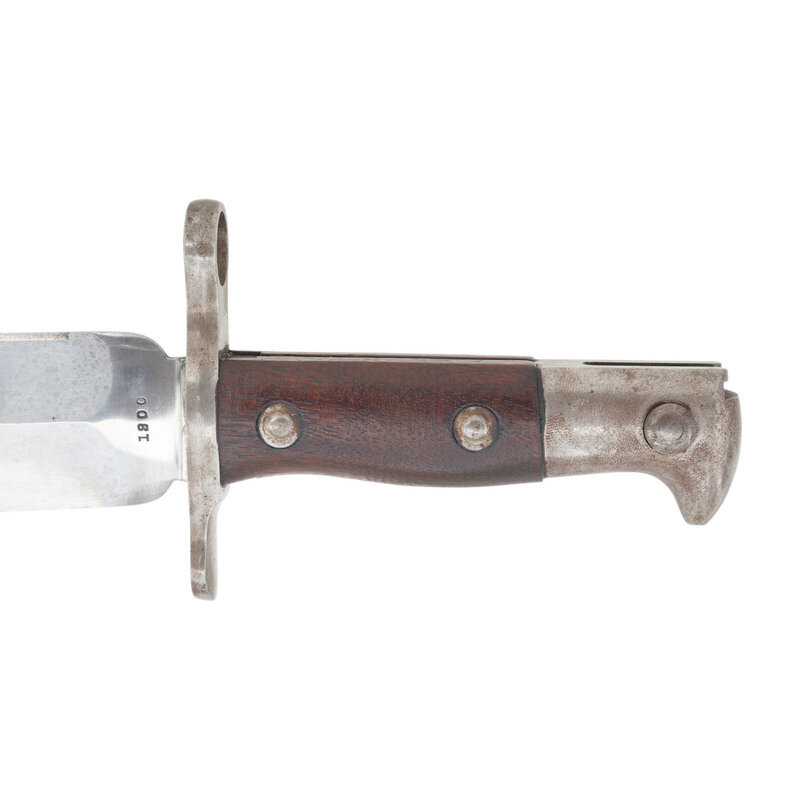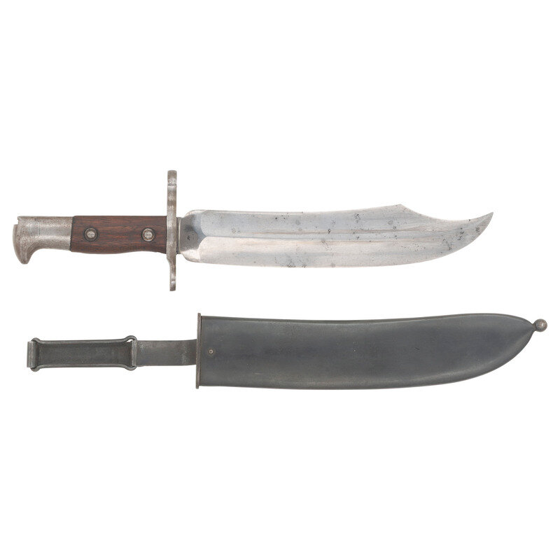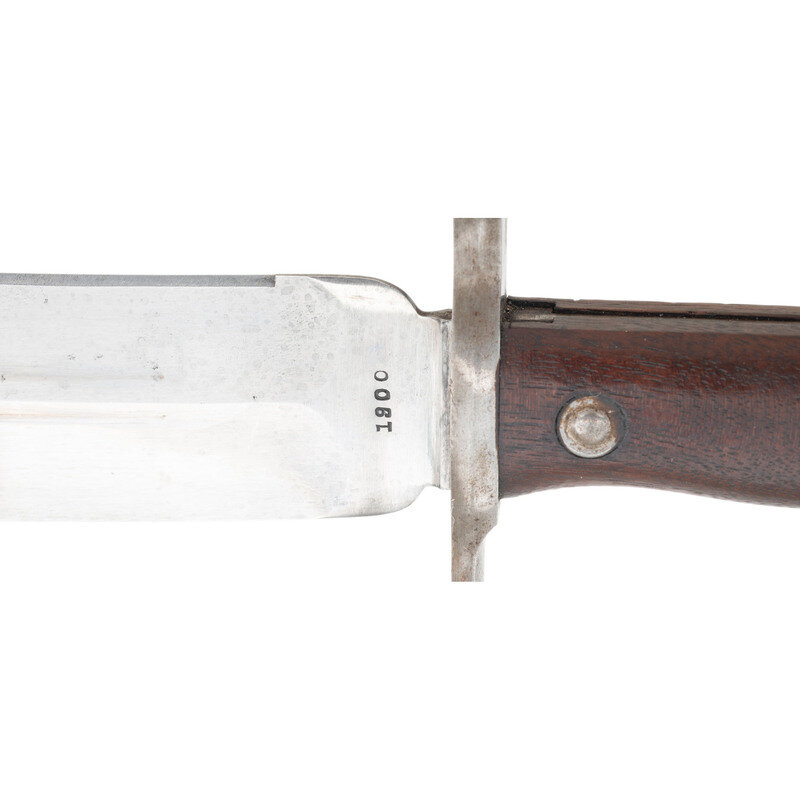 9" single edged clip point Bowie blade with 2.625" false edge and prominent median ridge. Blade 1.75" wide at widest point and 1.5" wide at ricasso. Overall length 13.5". 4.5" standard Krag pattern hilt with iron cross guard and pommel cap, push button lug latch and riveted smooth walnut grip scales. Obverse ricasso marked US and reverse ricasso dated 1900. Includes a blued steel scabbard with belt hanger. Sources vary as to the total of these bayonets being produced for the Krag Rifle in the wake of the Spanish American War. Numbers quoted as between 2,000 and 2,800. Supposedly 500 were sent to Cuba for field testing, while the bulk of the bayonets, some 1,500 were sent to the Philippines. A rare US bayonet not often seen for sale.