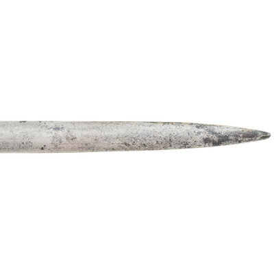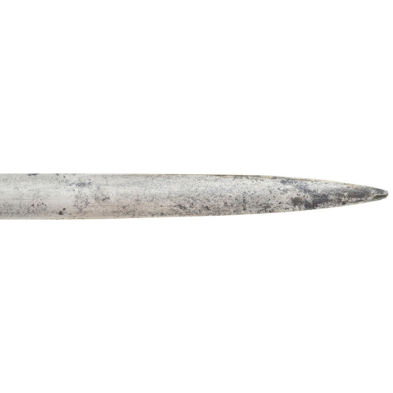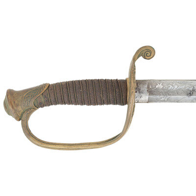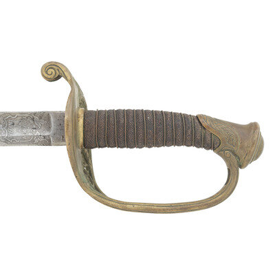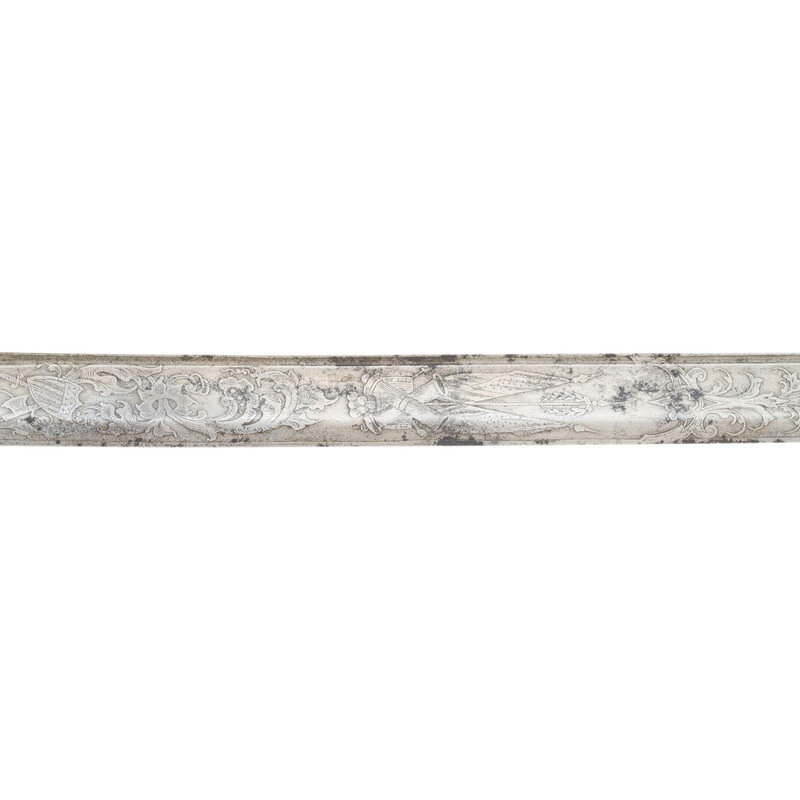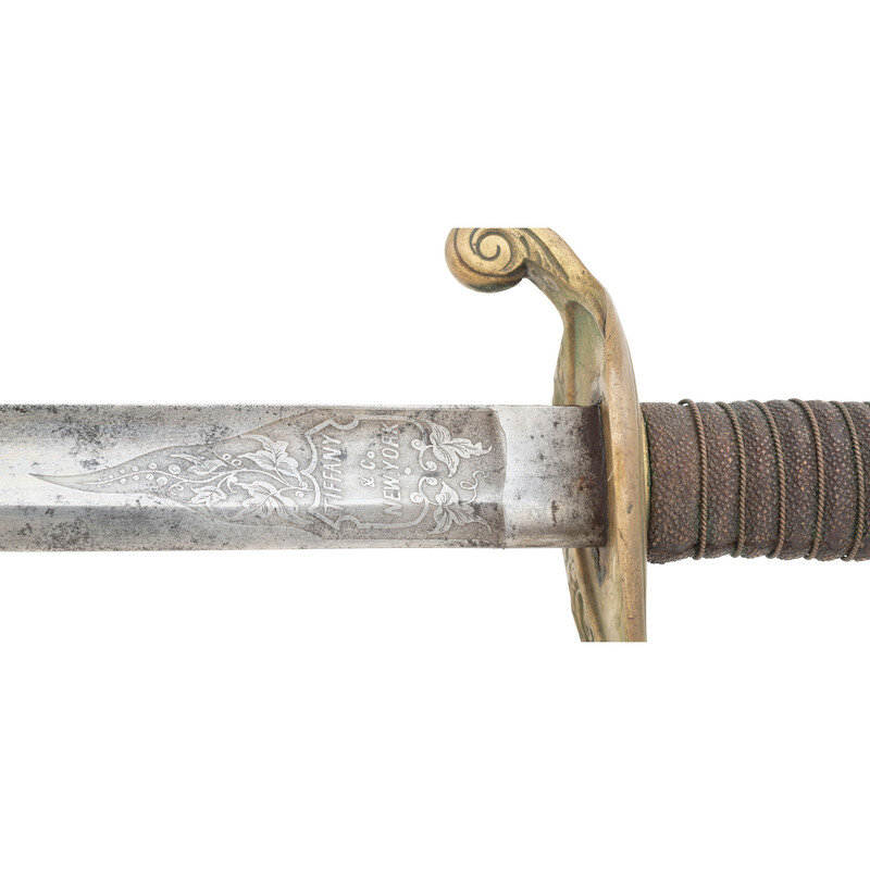 32" single edged spear point blade with a 21.75" stopped median fuller. Blade is 1" wide at ricasso. Overall length 38". 6" hilt with cast brass guard and grooved wooden grip with shagreen covering and 14 wraps of twisted wire. Blade etched TIFFANY/& Co/NEW YORK in a panel above the ricasso on the reverse of the blade. Blade decorated with acid etched foliate, marital and patriotic themes, with a large US in the central panel on the reverse and a panoply of arms in the central panel on the obverse. Face of guard marked with the bench number 239. No throat washer is present. The sword is accompanied by a German silver scabbard with no throat that is engraved with foliate, patriotic and martial themes.