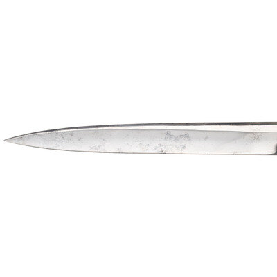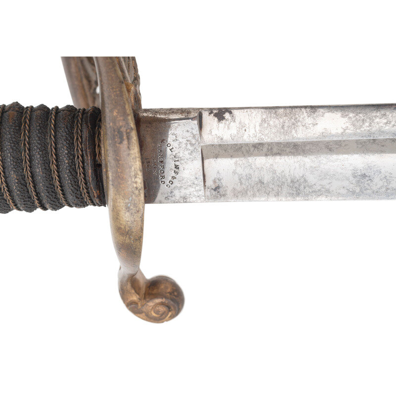 31.75" singled edged spear point blade with 22" stopped median fuller, 1.1" wide at ricasso. Overall length 37.75". 6" hilt with gilt cast brass guard with US in the face, grooved wood grip covered in shagreen and 14 wraps of twisted, multi-strand wire. Reverse ricasso marked COLLINS & Co in an arc over HARTFORD/CONN/1862. Plain blade without any etching. Leather throat washer on blade at face of guard. Includes a brass mounted leather scabbard with rear seam.