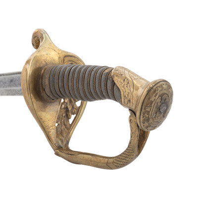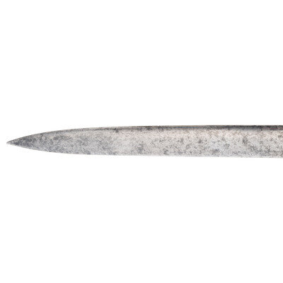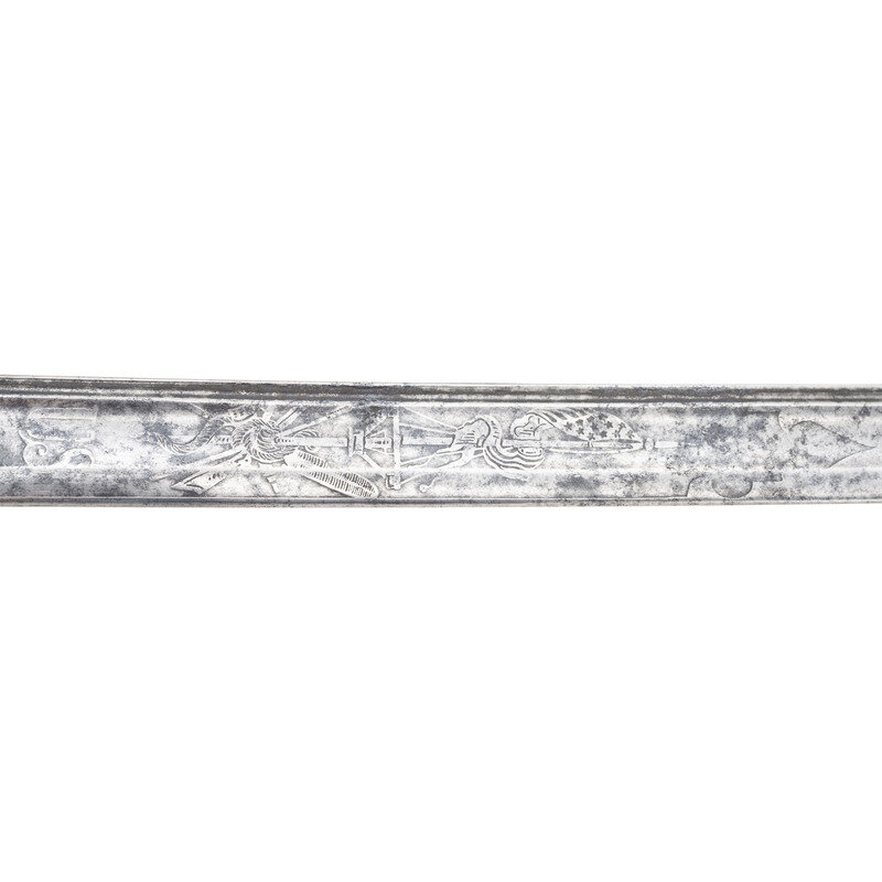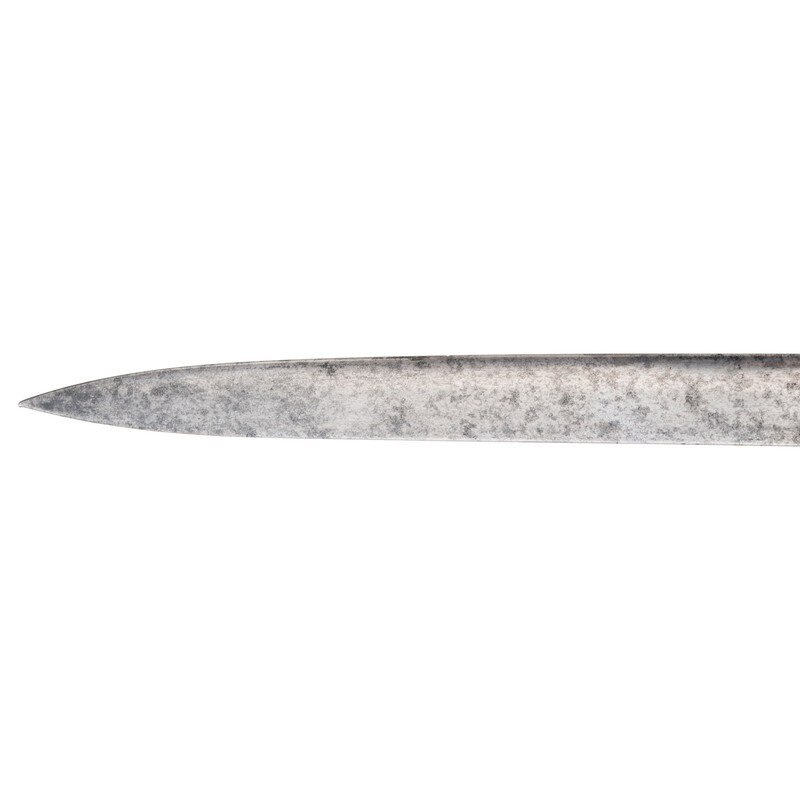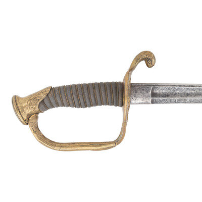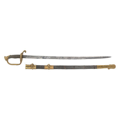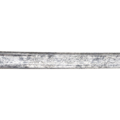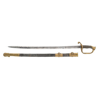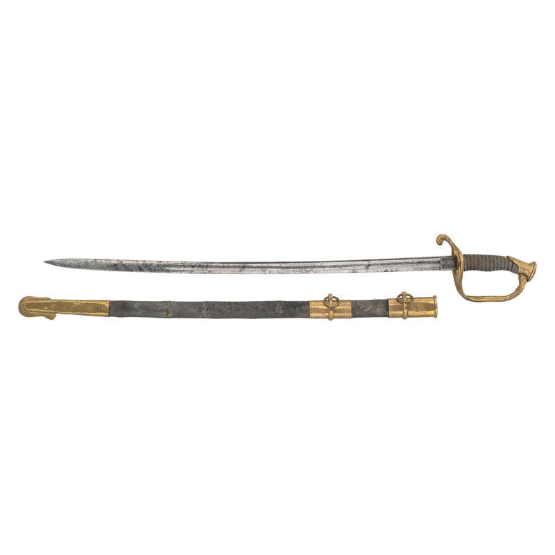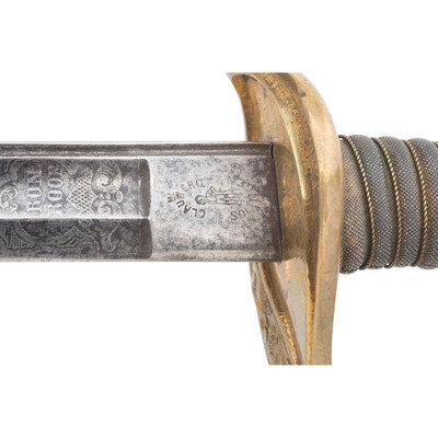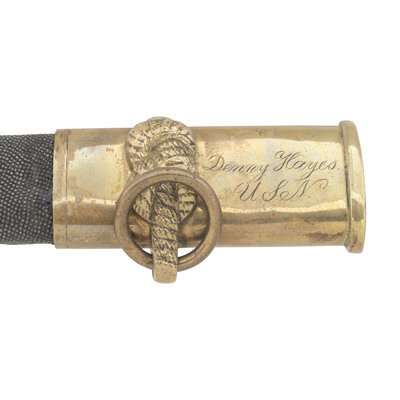 29" single edged spear point blade with 19.5" median fuller. Blade 1" wide at ricasso. Overall length 35". 5.25" hilt with cast gilt brass guard with USN in a ribbon it its face. Grooved wood grip covered in shagreen with 14 wraps of twisted wire. Reverse ricasso stamped CLAUBERG/SOLINGEN around their trademark. Blade etched with foliate, nautical, marital and patriotic themes as well as IRON PROOF on the reverse. The sword is accompanied by its shagreen covered scabbard with gilt brass mounts. The obverse of the upper mount is engraved Denny Hayes/USN. A search of Civil War records reveals two potential USN Officers that this sword could have belonged to with the most likely candidate being Denny M Hayes. He was mustered into service as a Mate on June 7, 1864 made Acting Ensign on November 18, 1864 and was honorably discharged on October 21, 1865. He returned to the Navy as an Acting Ensign on July 5, 1866 with the appointment revoked on December 7, 1867. Hayes was born in Ireland in 1843 and emigrated to America circa 1854 at the age of 11. No further information about Hayes' service was readily available.