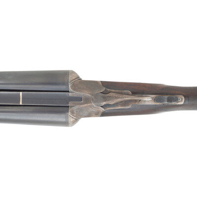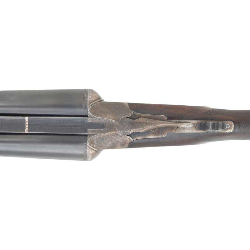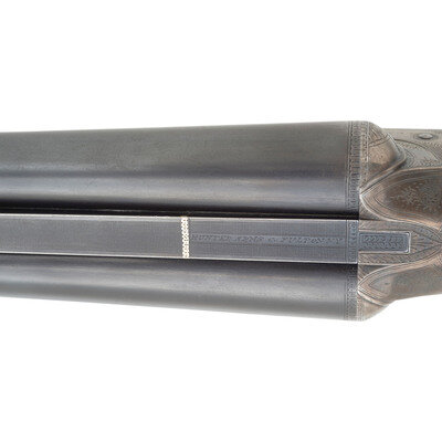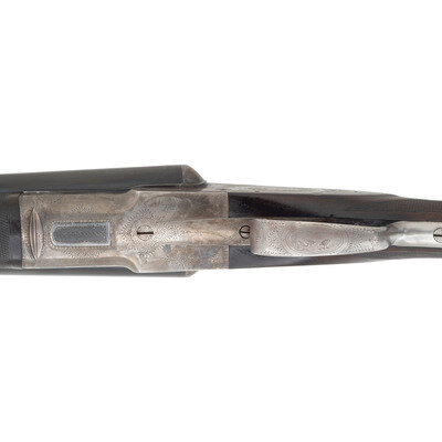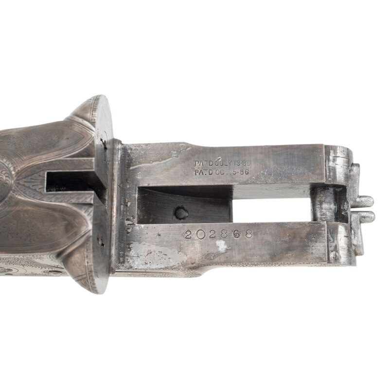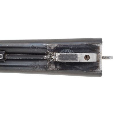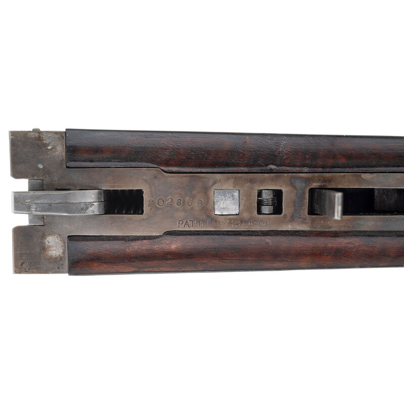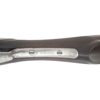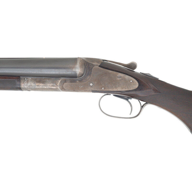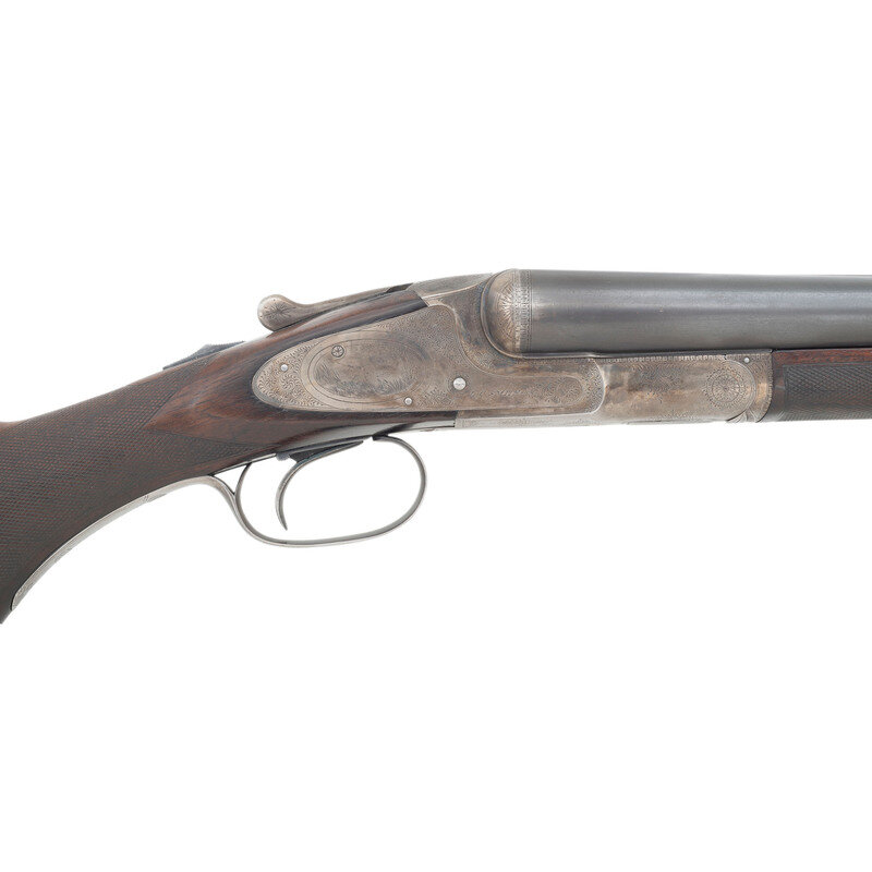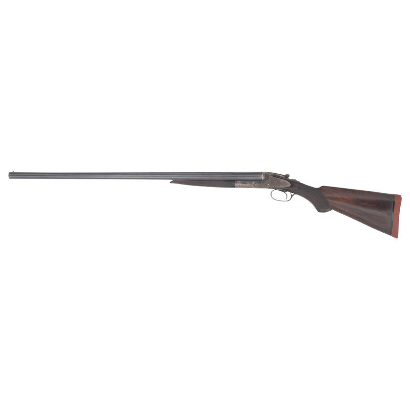 12 Gauge. 30" barrel length. SN: 202868. 2.75" chamber length. Full chokes. Casehardened frame with blued barrels mounting English walnut semi-pistol grip stock and splinter forend, and featuring twin white and gold bead sights on a matted barrel rib. Double barrel side by side sidelock ejector shotgun featuring a single selector trigger, and a rubber recoil pad. Stock and forend feature bordered checkering with hardrubber semi pistol grip cap. The sideplates are engraved with the maker marking L.C. SMITH, with a banner on the barrel rib reading HUNTER ARMS CO FULTON N.Y. in engraved letters and featuring a gold forward border, and light border engraving along the breeches and dollshead. Nitro steel proofs visible over each barrel with 4E quality marking below the serial number on the barrel flats. Watertables are marked PATD JULY 13-86/PATD OCT 5-86. Forend ejector patent mark reads PAT'D MAY 28. 1901. Trigger plate is engraved HUNTER ONE TRIGGER and features gold inlaid L and R barrel selector markings, with the tang showing a similarly gold inlaid S safety mark. Sidpelates feature spiral scroll engraved flourishes enclosing bank note scroll vignettes of pointers. Triggerguard vignette shows two quail feeding among the brush. Sunburst flourishes adorn the barrel fences and hingepin. Shotgun features removable firing pin bushings with set screws. Timing of the engraved screws indicates the shotgun has been disassembled and maintained. Item comes with an L.C. Smith Collectors Association letter by James Stubbendieck affirming that this shotgun was finished on October 28, 1904, and inspected by William C. McKnight, the primary inspector of high grade shotguns produced by L.C. Smith before 1918. The records indicate it left the factory with 30 inch barrels and a splinter forend, but that records from before 1918 do not typically record the trigger configuration. Only 495 No. 4 pattern shotguns were produced between their introduction in 1894, and their replacement in 1914. 13.5" length of pull. 1.75" drop to comb. 2.75" drop to heel. 7.66 lbs weight. {C&R}