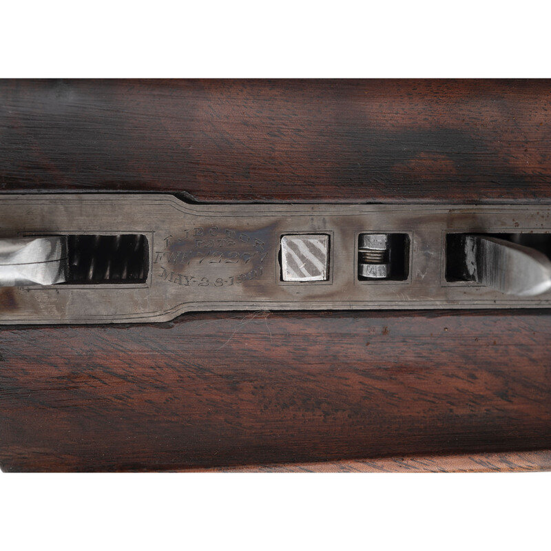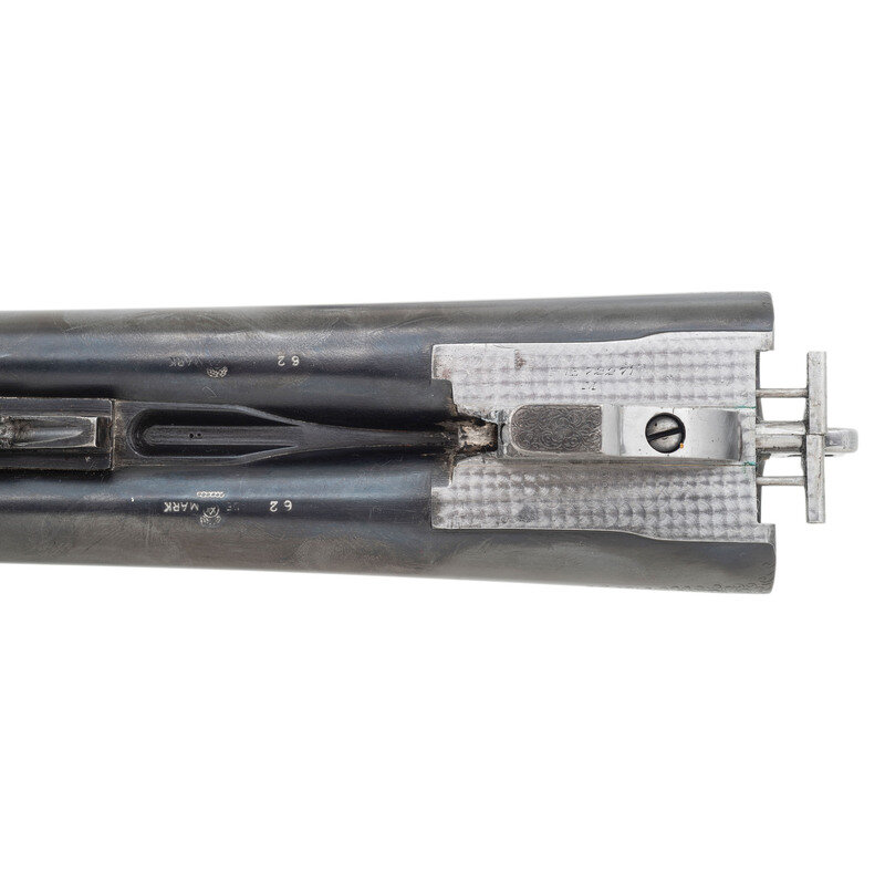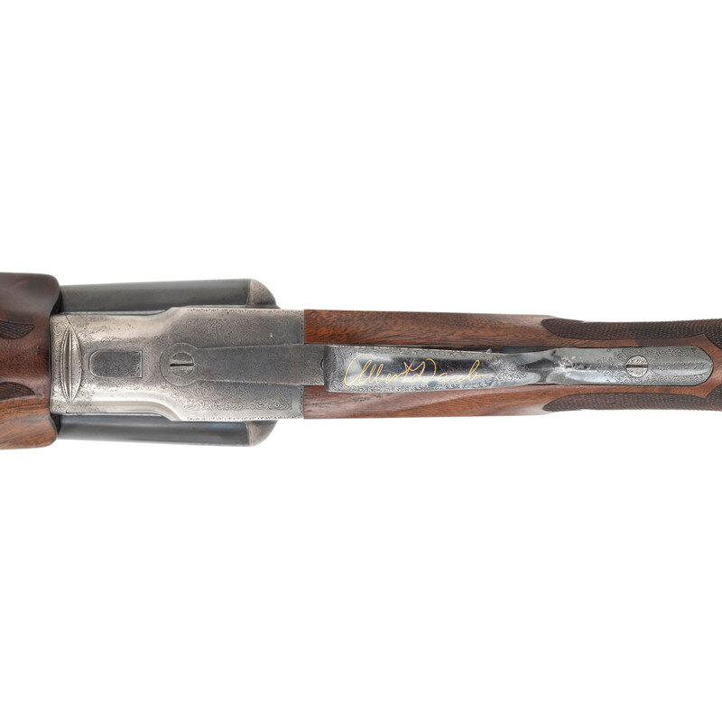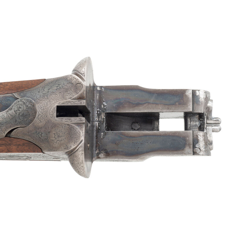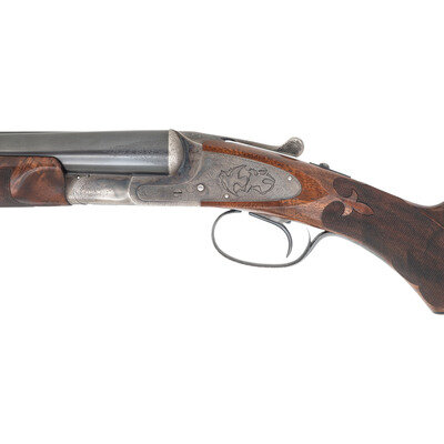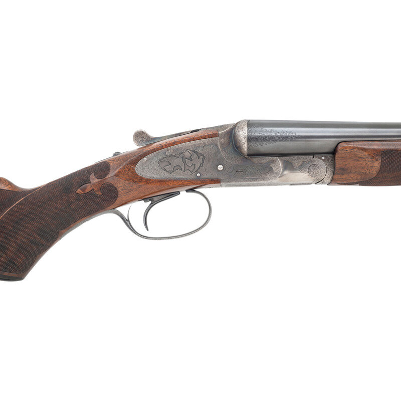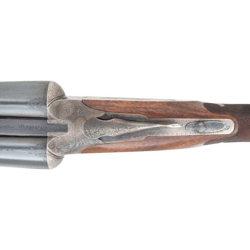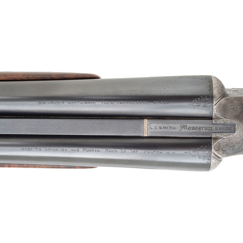 12 Gauge. 30" barrel length. SN: FWE72271. 2.75" chamber length. Modified Left. Improved Modified Right. Casehardened metal finish with blued small parts and barrels mounting Circassian walnut semi-pistol grip stock with factory replaced beavertail forend. Double barrel side by side sidelock ejector shotgun with single selector trigger. Sights consist of twin beads on a matted rib. Checkering features a prominent Fleur de Lis motif on the wrist. Engraved manufacturer markings include L.C. SMITH Monogram GRADE over the rear rib and dollshead, with gold border separating it from the matting. Right barrel is engraved SIR JOSEPH WHITWORTH FLUID COMPRESSED STEEL and the left MADE TO ORDER BY THE HUNTER ARMS CO. INC. FULTON, N.Y. The M for Monogram marking is struck into the jeweled barrel flats below the serial number, and on the watertables. The frame, sideplates, and rear barrels are richly engraved with Rose and Scroll pattern typically encountered on Monogram grades, with flying birds to each sideplate, and a duck on the lower frame. Inlaid gold S for Safe below the blued and engraved tang safety. The triggerguard features a gold inlaid signature reading Albert Daub, with the toe lacking an oval plate. Forend is engraved EJECTOR/PATD/MAY 28 1901 with a further number 2 engraved behind the forward screw. Left side of the trigger plate is engraved HUNTER ONE TRIGGER with L and R marks below the selector. Shotgun comes with an LC Smith Collectors Association letter dated August 25, 2022, affirming that this shotgun was made in 1924, and was one of ten Monogram grade shotguns built that year. 14" length of pull. 1.75" drop to comb. 2.25" drop to heel. 7.51 lbs. {C&R}