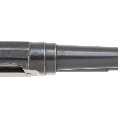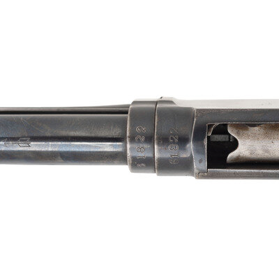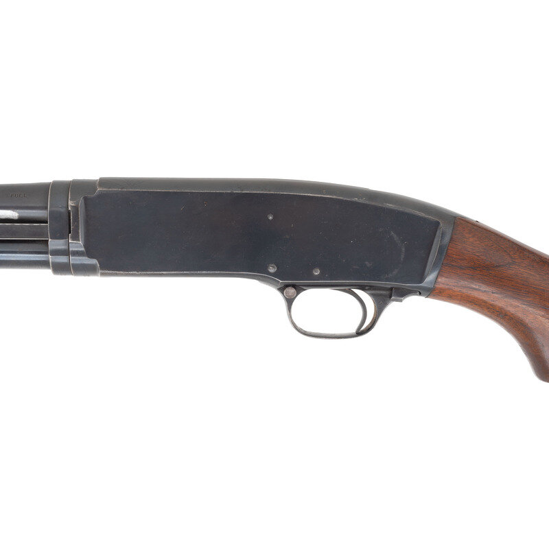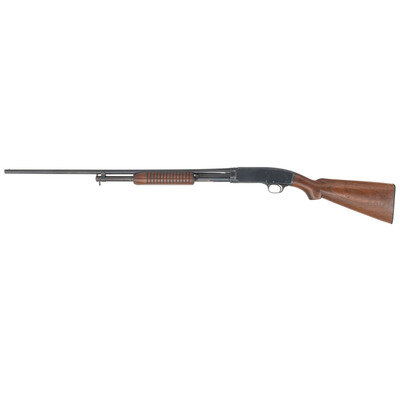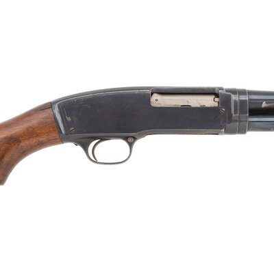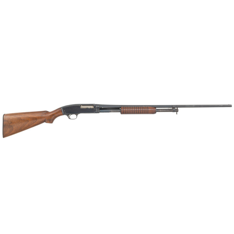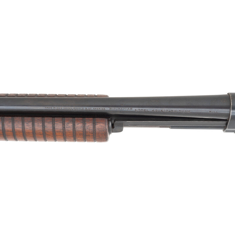 .410 Gauge Full Choke (3" chamber). 28" barrel. SN: 61822 (mfg. ca. 1947). Blued finish, smooth pistol gripped walnut stock with hard rubber Winchester buttplate and flat bottom smooth grooved forend. 14" length of pull, 1.5" drop at comb, 2.375" drop at heel. Pump action tubular magazine fed shotgun with matted receiver top, take down action and steel bead front sight. Standard Winchester markings and proof marks. {C&R}