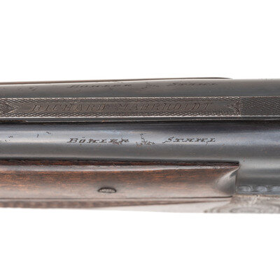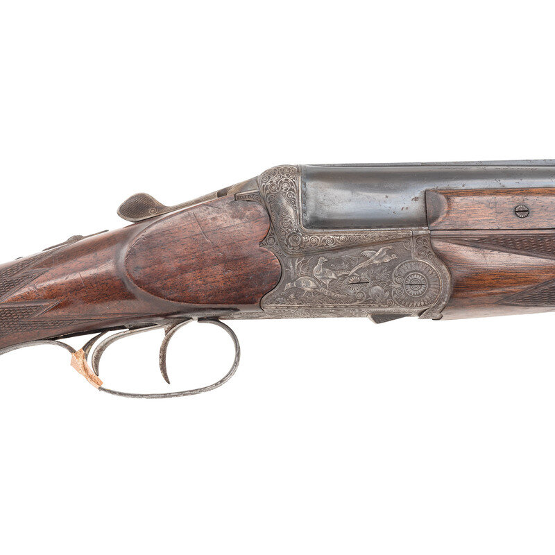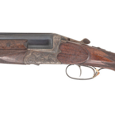 12 Gauge. 27.875" barrel length. SN: 2098-51. Blued metal finish with casehardened frame mounting walnut semi-pistol grip stock with cheek pad to left butt, bordered multipoint checkering to wrist and forend, and recoil pad. Double barrel over-under boxlock ejector shotgun featuring a full length vented rib and single bead front sight. Item is engraved with game scenes to all flat surfaces surrounded by spiral scroll with floral bouquets and sunbursts to hingepin and lever. Matching engraving to the edges of the barrel and metal components of forend. Toe of the stock fitted with a silver oval plate displaying the initials J.S.R. Barrel rib is signed RICHARD MARHOLDT with both flanks of the upper barrel further engraved BOHLER STAHL. Forend is frozen and cannot be removed for inspection. Ejector for upper barrel does not fully extend. 13.75" length of pull. 1.3" drop to comb. 2.4" drop to heel. {C&R}