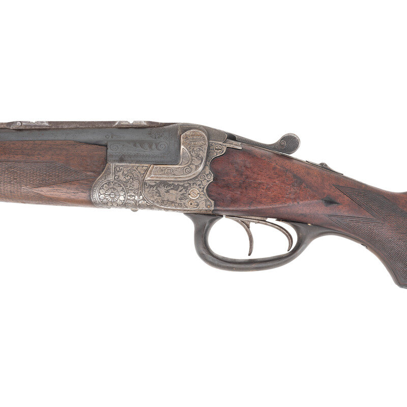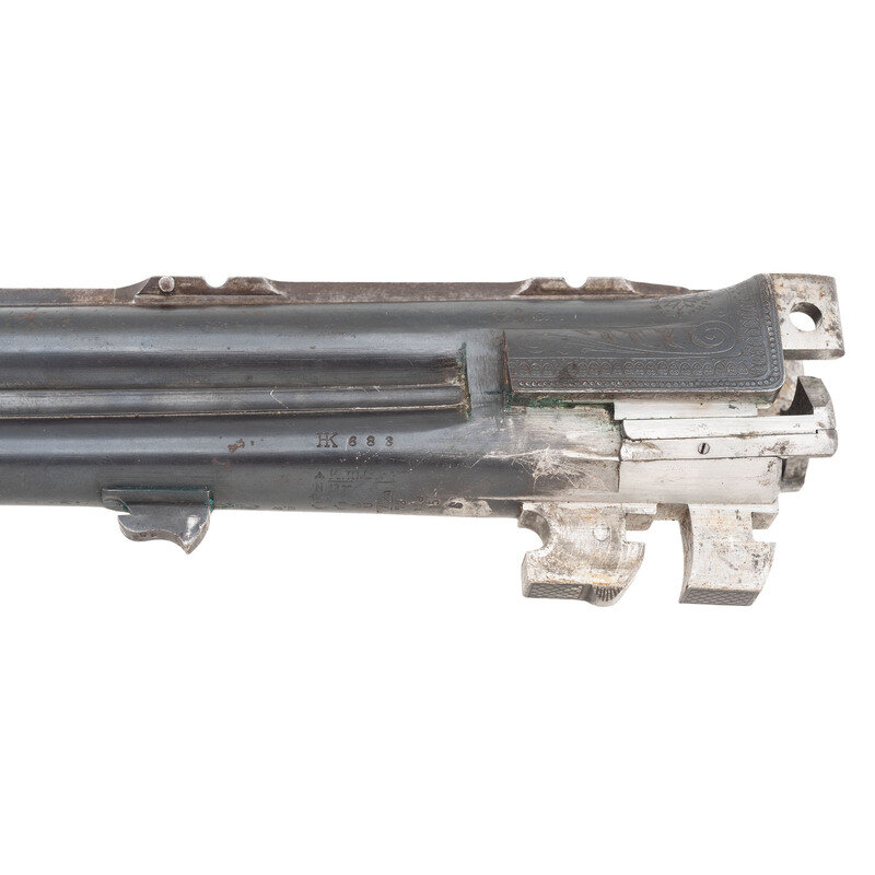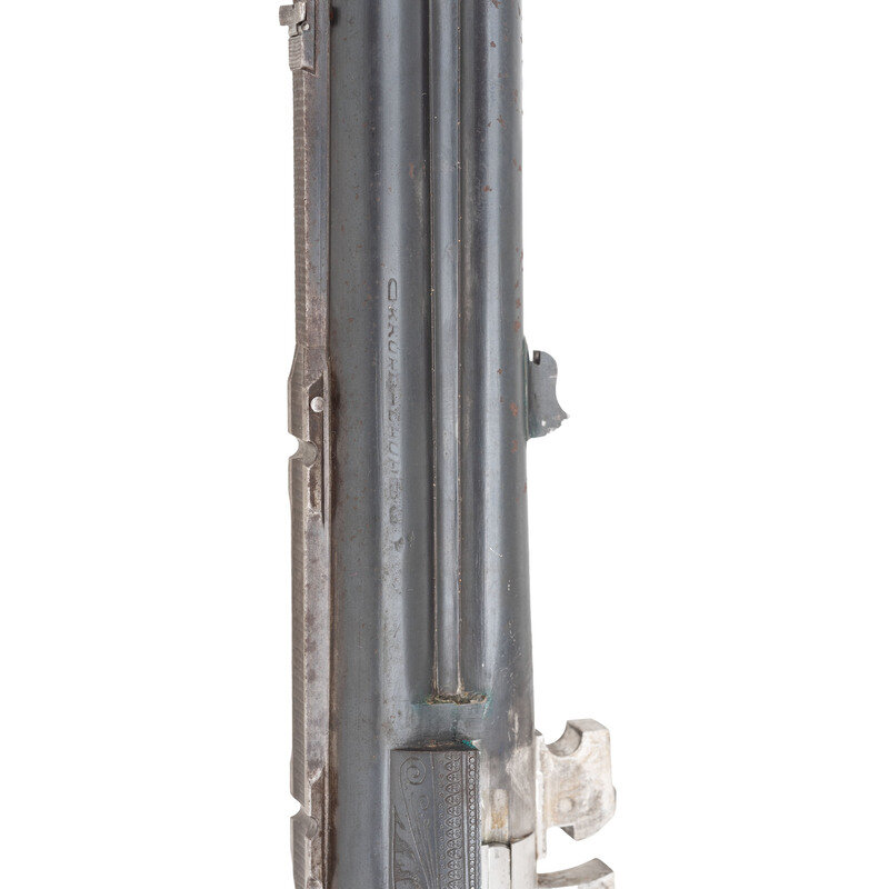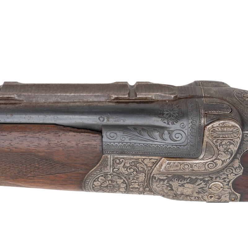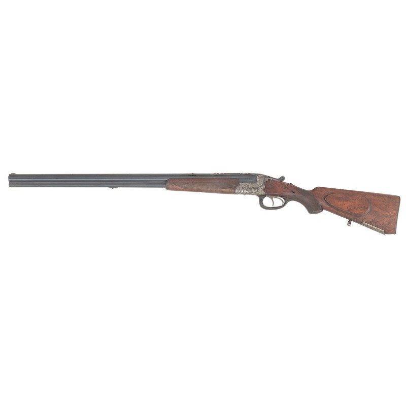 8x72R and 16 Gauge (2.5" chamber). 27.5" barrels. SN: 36167. Blued and color casehardened finish, steel mountings, horn triggerguard, checkered European hard wood pistol gripped butt with raised cheek rest and hard rubber butt plate, checkered forend. Length of pull 14", drop at comb 1.5", drop at heel 2.5". Over and under combination gun with matted top rib with scope mounting cuts, express leaf rear sight, blade front sight, double triggers with the rifle trigger adjustable, sliding thumb safety and ammunition trap in toe line of the stock, sling swivel in toe of stock, barrel swivel broken and missing. Unmarked as to maker, barrel with Krupp steel marks, both a {Crown}/G black powder proof and {Crown}/U inspection are found under the barrel, along with the loading information of the rifle cartridge, with an additional {Crown}/N Nitro proof on the shotgun chamber. Matching mating numbers on both the receiver and barrels. A former owner's Social Security number is marked on the left side of the barrels with an electropencil. Receiver with relief engraved decorations consisting of flowing Arabesque scrolls, foliate themes and game scenes with deer and stags. Receiver tang and ammunition trap cover engraved en-suite. An empty, fired casing is in the ammunition storage trap in the butt. {C&R}