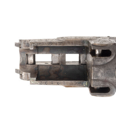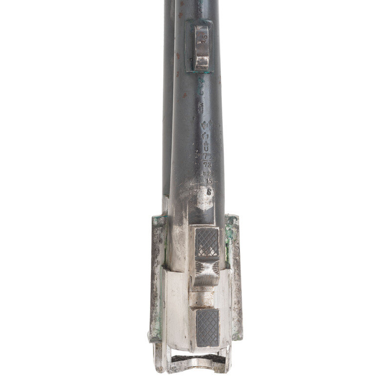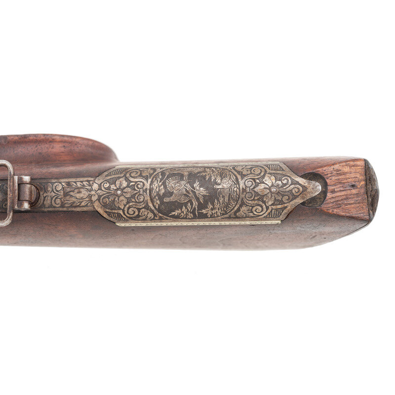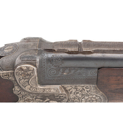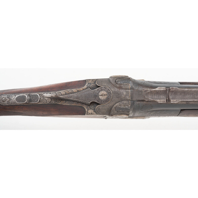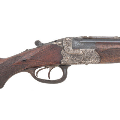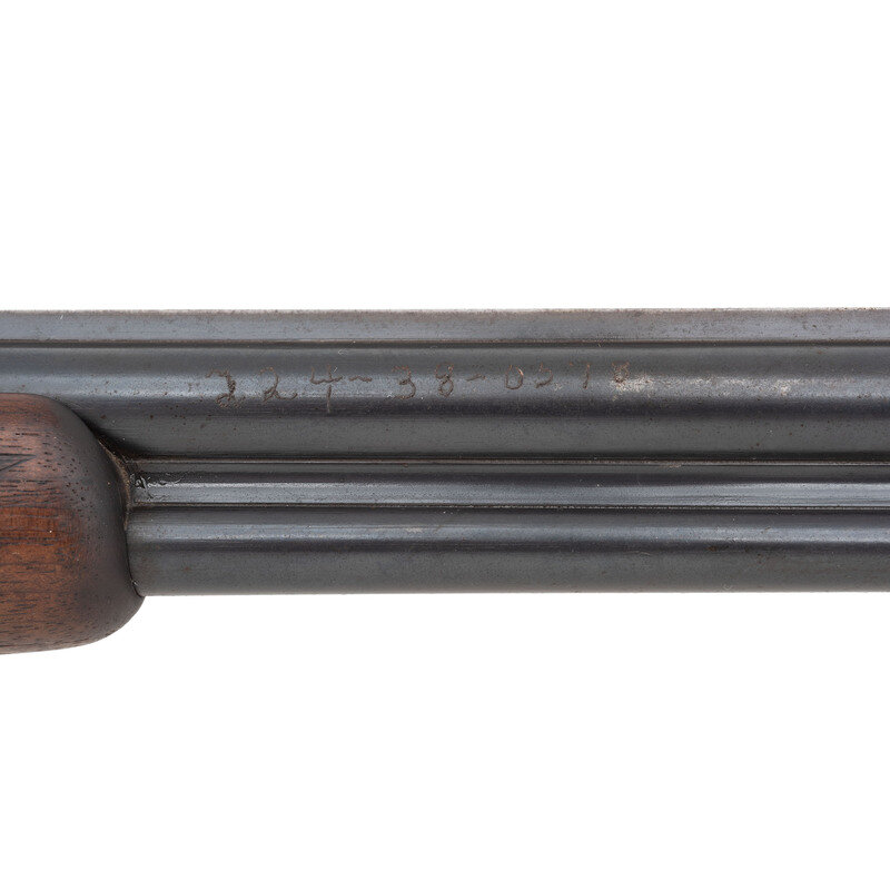 8x72R and 16 Gauge (2.5" chamber). 27.5" barrels. SN: 36167. Blued and color casehardened finish, steel mountings, horn triggerguard, checkered European hard wood pistol gripped butt with raised cheek rest and hard rubber butt plate, checkered forend. Length of pull 14", drop at comb 1.5", drop at heel 2.5". Over and under combination gun with matted top rib with scope mounting cuts, express leaf rear sight, blade front sight, double triggers with the rifle trigger adjustable, sliding thumb safety and ammunition trap in toe line of the stock, sling swivel in toe of stock, barrel swivel broken and missing. Unmarked as to maker, barrel with Krupp steel marks, both a {Crown}/G black powder proof and {Crown}/U inspection are found under the barrel, along with the loading information of the rifle cartridge, with an additional {Crown}/N Nitro proof on the shotgun chamber. Matching mating numbers on both the receiver and barrels. A former owner's Social Security number is marked on the left side of the barrels with an electropencil. Receiver with relief engraved decorations consisting of flowing Arabesque scrolls, foliate themes and game scenes with deer and stags. Receiver tang and ammunition trap cover engraved en-suite. An empty, fired casing is in the ammunition storage trap in the butt. {C&R}