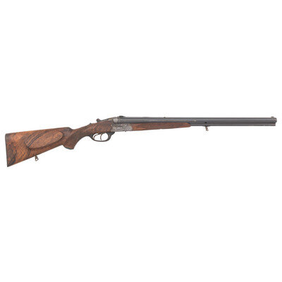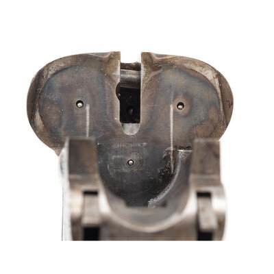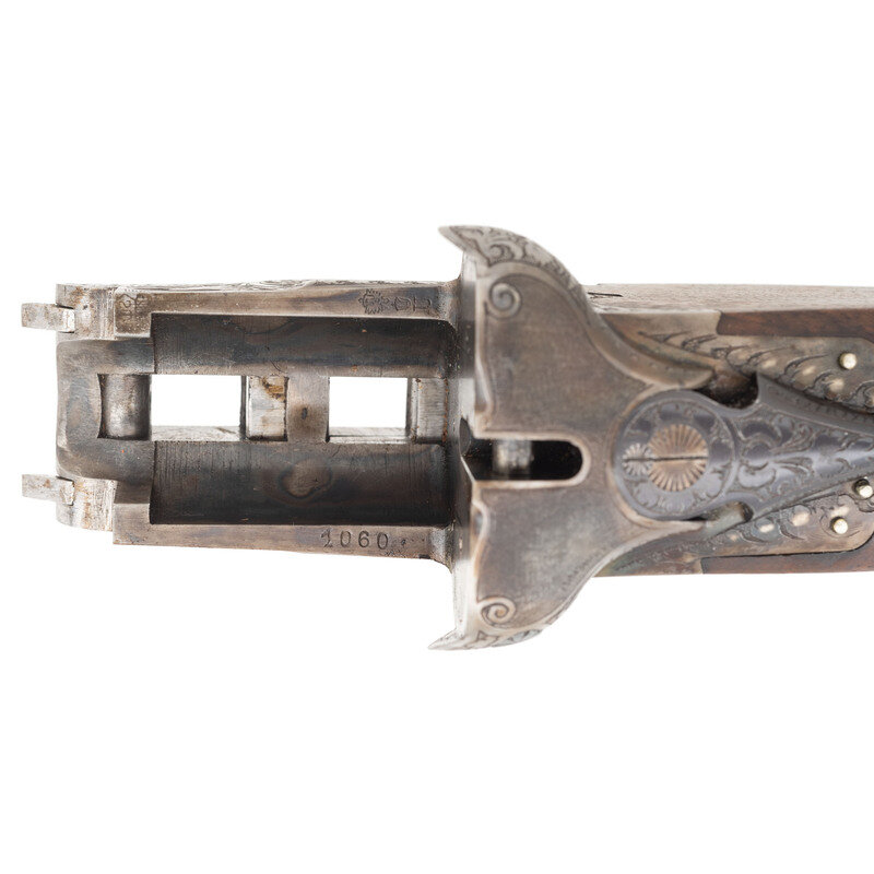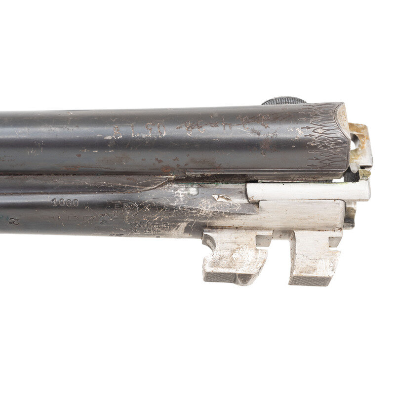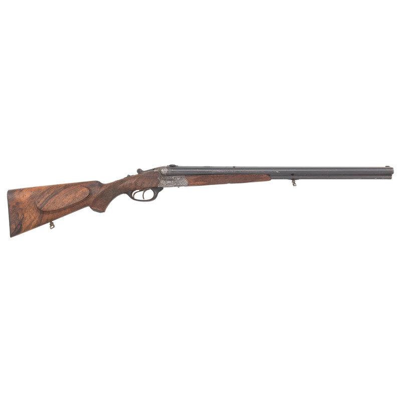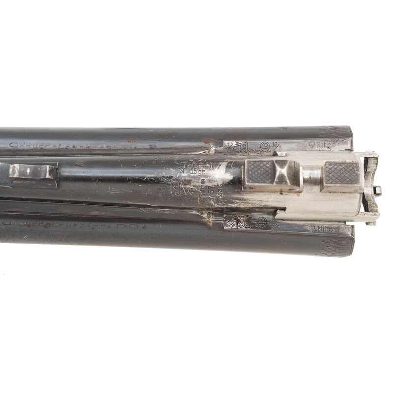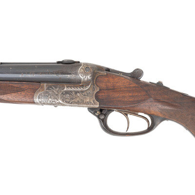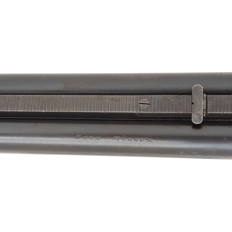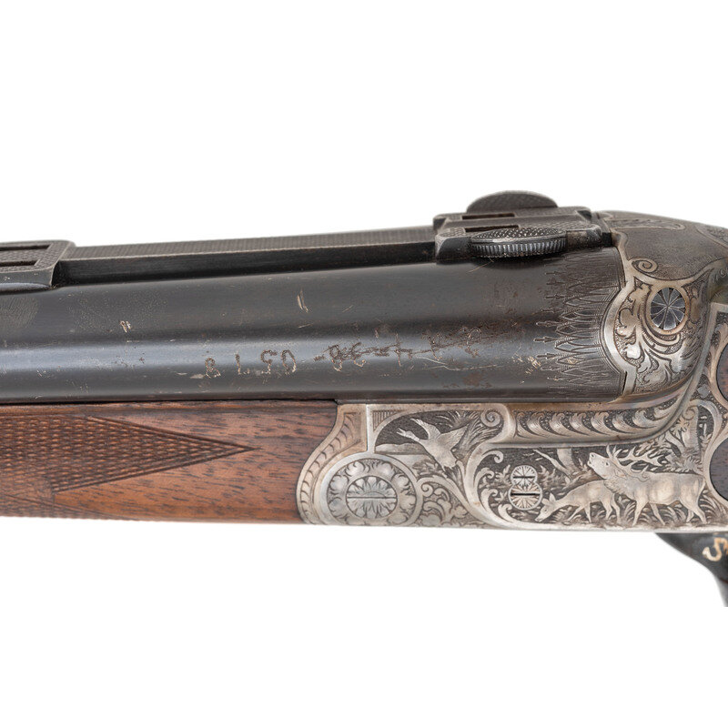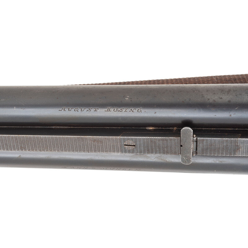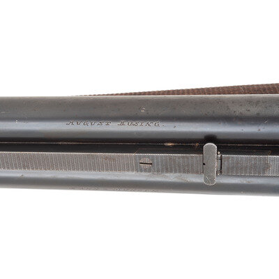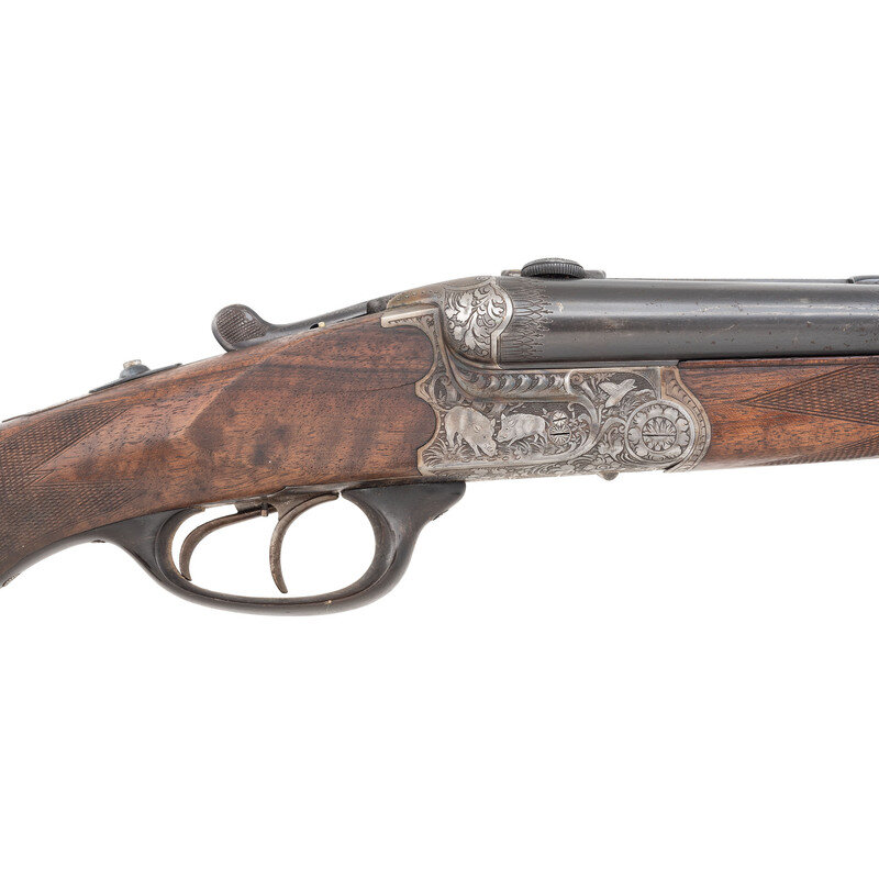 8x57 and 16 Gauge (2.5" chambers). 23.625" barrels. SN: 1060. Blued and color casehardened finish, steel mountings, horn triggerguard, checkered European hard wood pistol gripped stock with raised cheek rest on the right side and grooved hard rubber buttplate, tapered checkered forend. Length of pull 14.125", drop at comb 1.625", drop at heel 2.625". German drilling with matted top rib cut for claw style scope mounts, folding express leaf rear sight, blade front sight, double triggers with the rifle trigger adjustable, sliding thumb safety and trigerauard mounted safety on left, sling swivel in toe of stock and under barrel. Barrel marked AUGUST HUSING, possibly the maker, although Husing is not listed in Stokel or any other reference. Barrel with Krupp steel marks and {Crown}/N Nitro proofs. Matching serial numbers on both the receiver and barrels. A former owner's Social Security number is marked on the left side of the one of the shotgun barrels with an electropencil. Receiver with relief engraved decorations consisting of foliate themes and game scenes with stags, boars and birds. Receiver tang, standing breeches and lever engraved ensuite. {C&R}