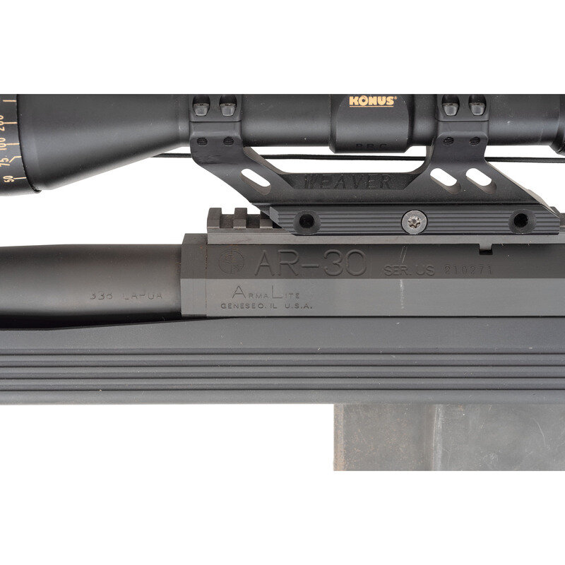 .338 Lapua. 28.5" barrel length (with muzzle brake). SN: 21071. Parkerized metal finish with black synthetic butt and pistol grip, black rubber recoil pad, and mounting a two port muzzle brake. Rifle features a weaver rail to receiver, folding bipod to the forend, and a WEAVER scope base marked WEAVER and MSR 1IN USA 7075. Mounts a KONUS P.R.C. 3-12 X scope. Standard make and model marks including ARMALITE/GENESEO, IL. U.S.A. and AR-30. Comes with a total of two magazines. {MODERN}
