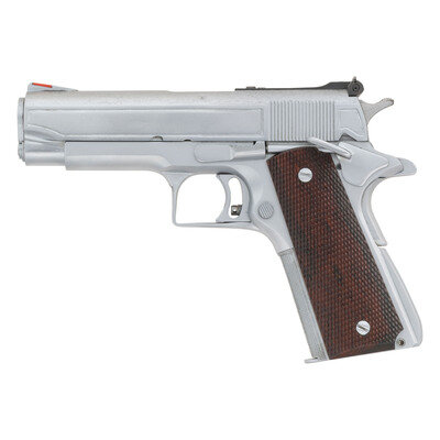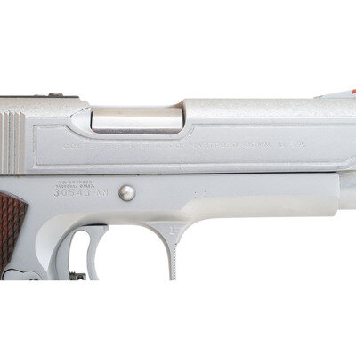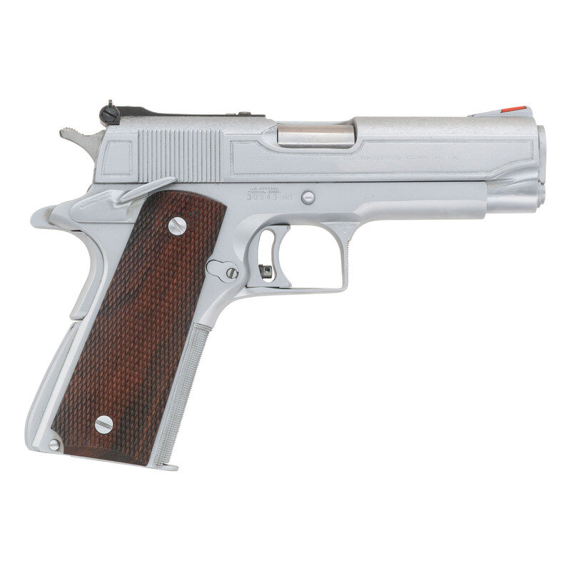 .45 ACP. 4.125" barrel length. SN: 30543-NM. Hard chrome plated finish overall mounting checkered walnut grips and customized by Armand Swenson. Short recoil operated single action autoloading pistol fed by detachable single stack magazines. Original manufacture mark to right slide reads COLT'S PT. F.A. MFG. CO. HARTFORD, CONN. U.S.A. The right frame and both sides of the ambidexterous safety are marked A.D. SWENSON/GARDENA. CALIF. Custom features include: matted rear slide, custom matted upper slide, engraved borders to slide flanks, checkering to slide stop, ambidexterous grip safety, checkering to forward gripstrap, squared off and checkered triggerguard, vertically serrated adjustable wide target trigger, Smith & Wesson adjustable white outline rear and matted red plastic insert front ramp sights, full length guide rod, custom fitted bushing, barrel and slide cut down to Commander length, and a beveled magazine well. {MODERN}