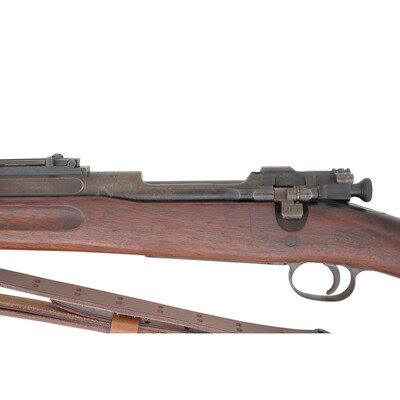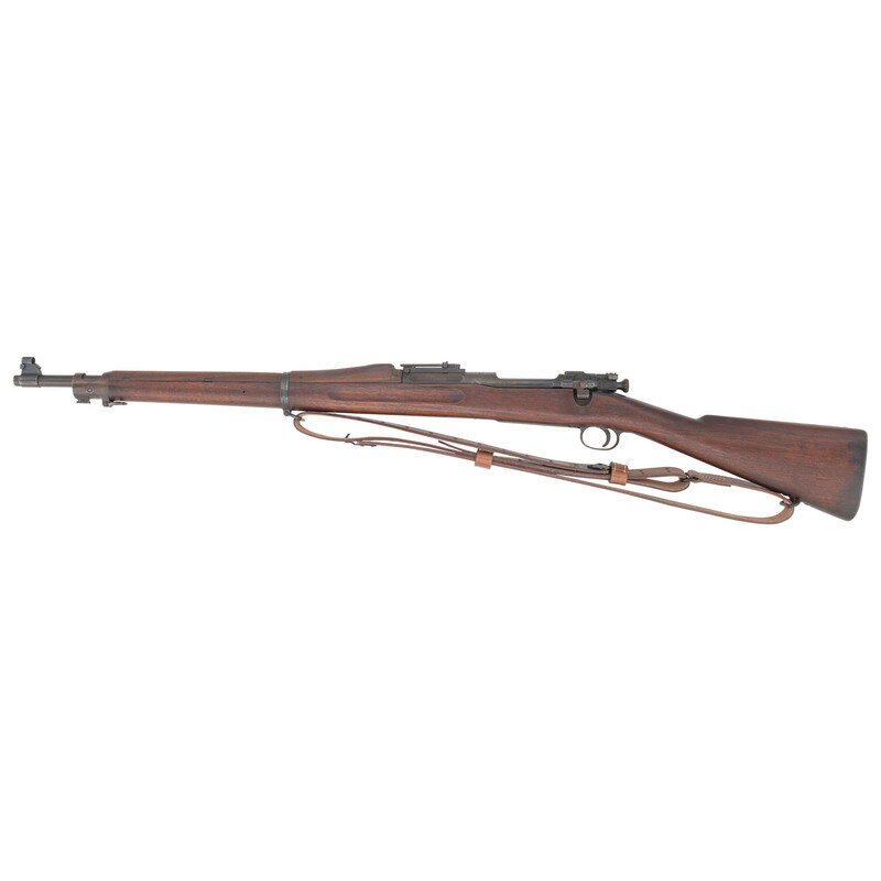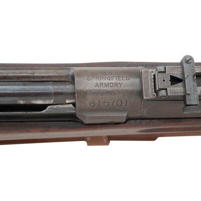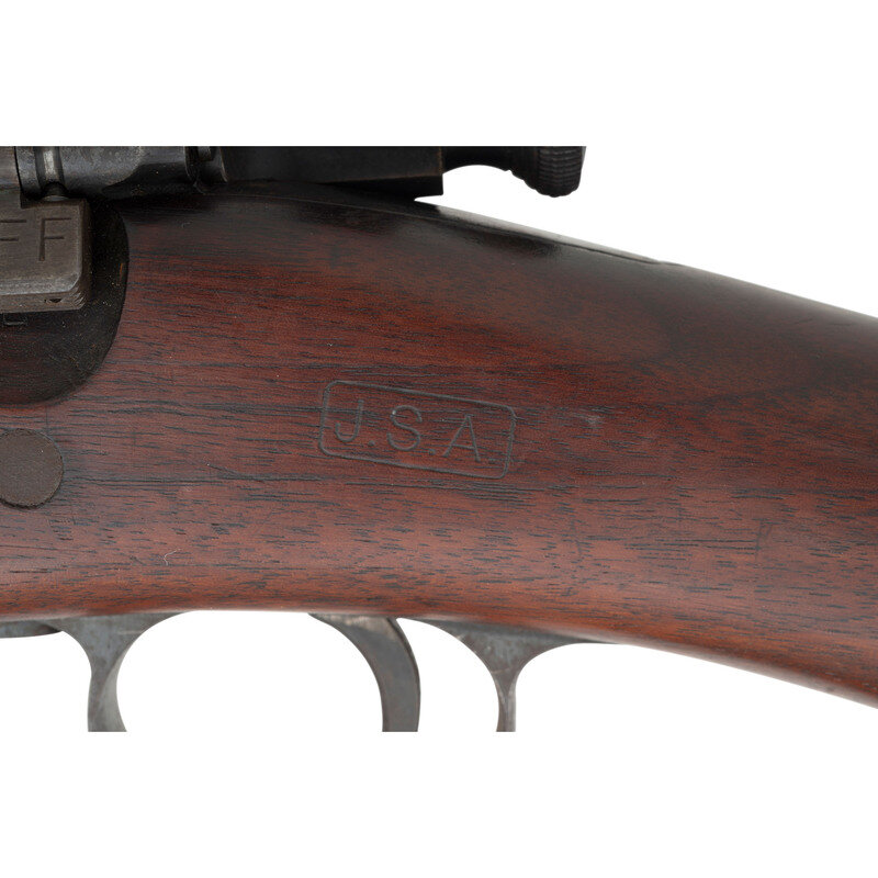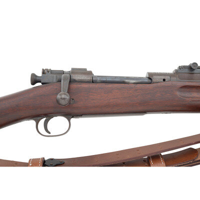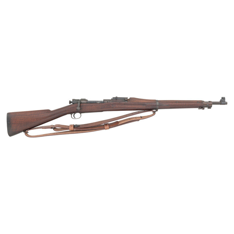 .30-06. 24" barrel length. SN: 615701. Blued metal finish mounting a walnut s-type straight stock with full length upper handguard. Bolt action internal magazine fed rifle charged with stripper clips and mounting adjustable rear ladder and fully hooded front sights. Receiver struck U.S/SPRINGFIELD/ARMORY/MODEL 1903. with serial number beneath. Barrel date mark reads S.A./{Ordnance Bomb}/10-15, indicating it was produced in October, 1915. Rifle additionally marked with an {Ordnance Bomb} on the triggerguard tang, along with N.R.A. initials. J.S.A. stamped on left side of wrist above trigger. Features circled P on underside of wrist and a 13 inscribed behind trigger guard. Currently mounts a reproduction Model 1907 leather sling. Triggerguard markings indicate this was one of the rifles sold by the Director of Civilian Marksmanship to NRA members between 1913 and 1916. The rising tensions in Europe that erupted into World War I had spurred on the call for improved preparation for the war to come, with this rifle serving as a tangible piece of this moment in history. {C&R}