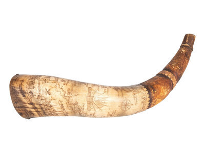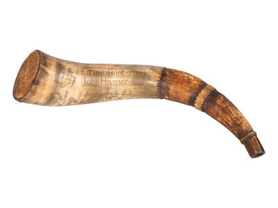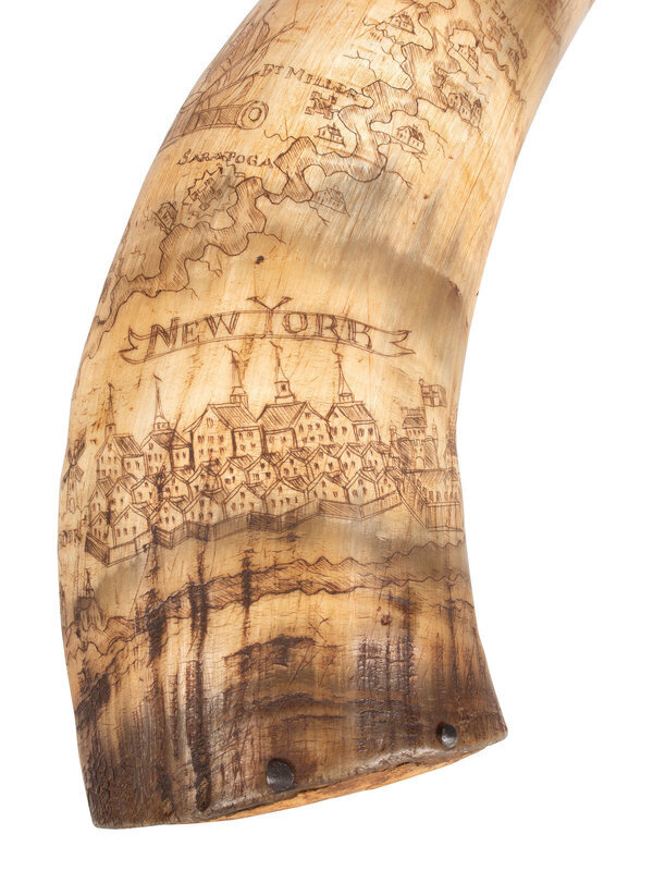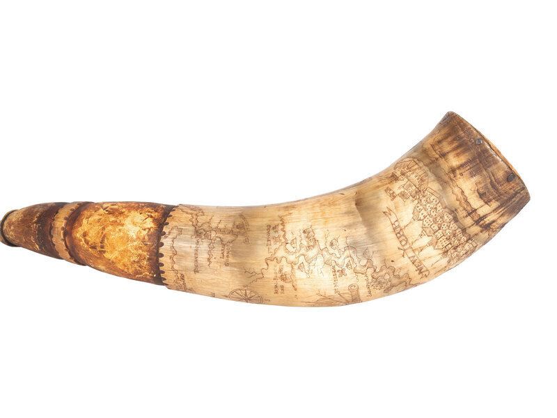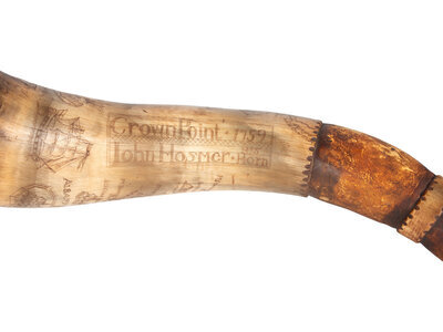 Contemporary French & Indian War Carved Map Powder Horn Named to John Hosmer at Crown Point in 1759.