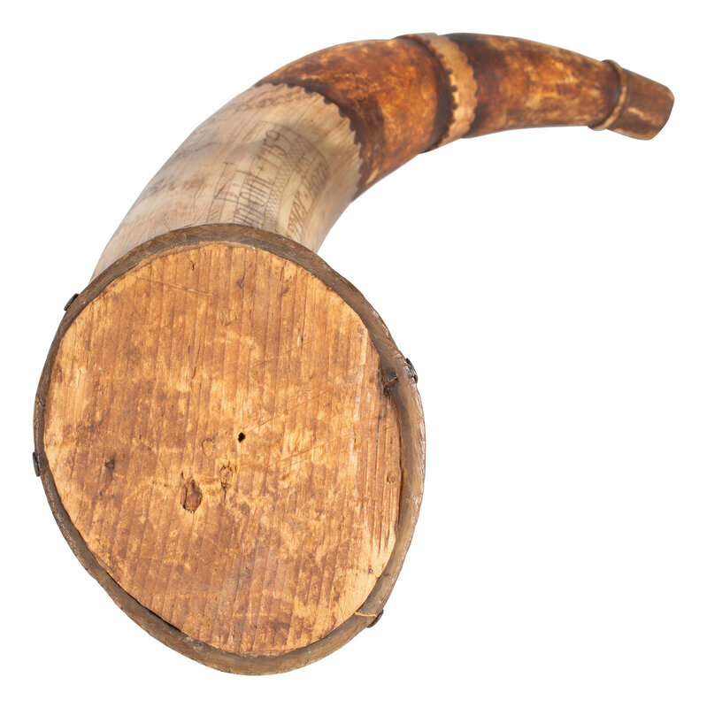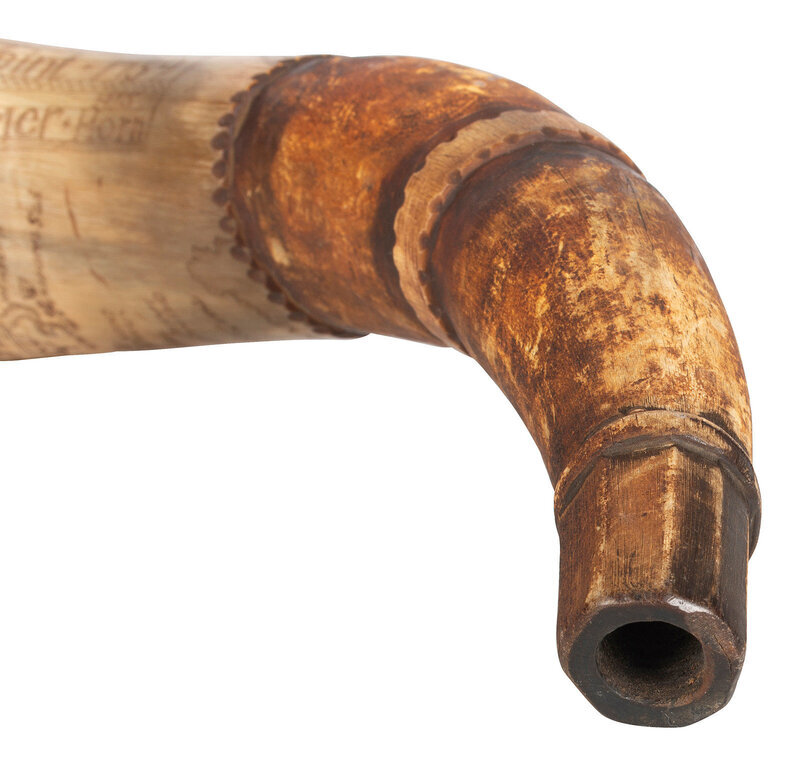 Nominally 14.5" long carved cow horn. Horn features raised ring carved near spout, with scalloped ring carved in throat, and horn proper with scalloped edge. Spout nominally 7" in length. Horn nominally 3.25"x2.75" at base plug. While the horn itself appears to be relatively old with good age, the carving appears to be contemporary.