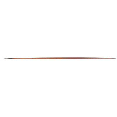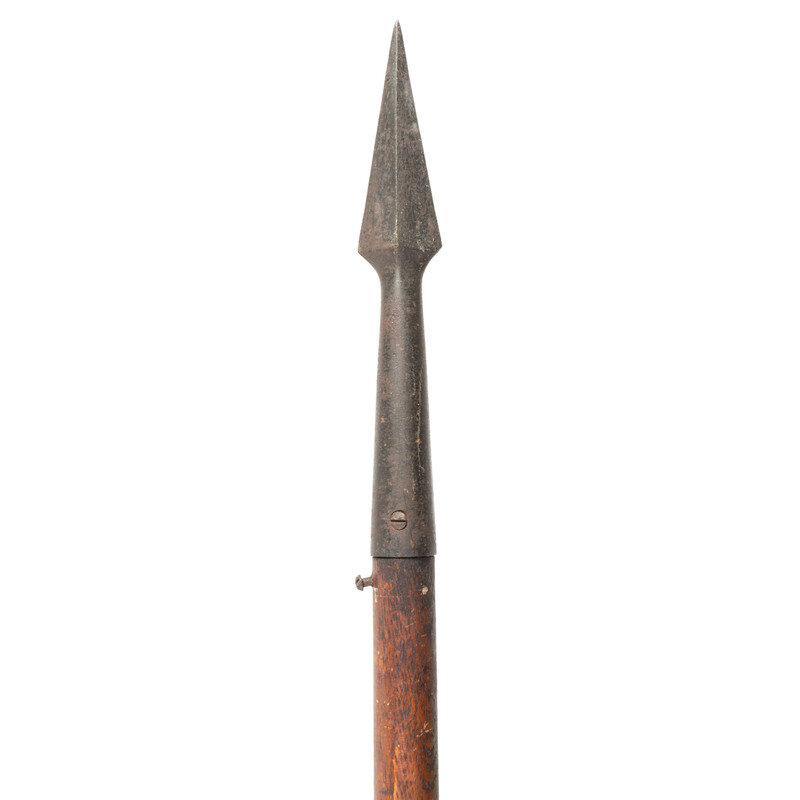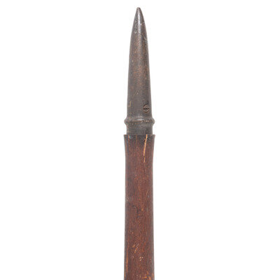 Nominally 116" in overall length (9' 8") with a 9.75" iron head and a 5" tapered grounding iron. Diamond cross section blade is nominally 4.75"x1.625". Haft is nominally 107" in length (8' 11"). Two iron screws are in the shaft for the attachment of a flag or similar device, nominally 4' apart. Haft with an old, applied ocher paint.