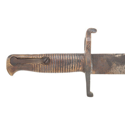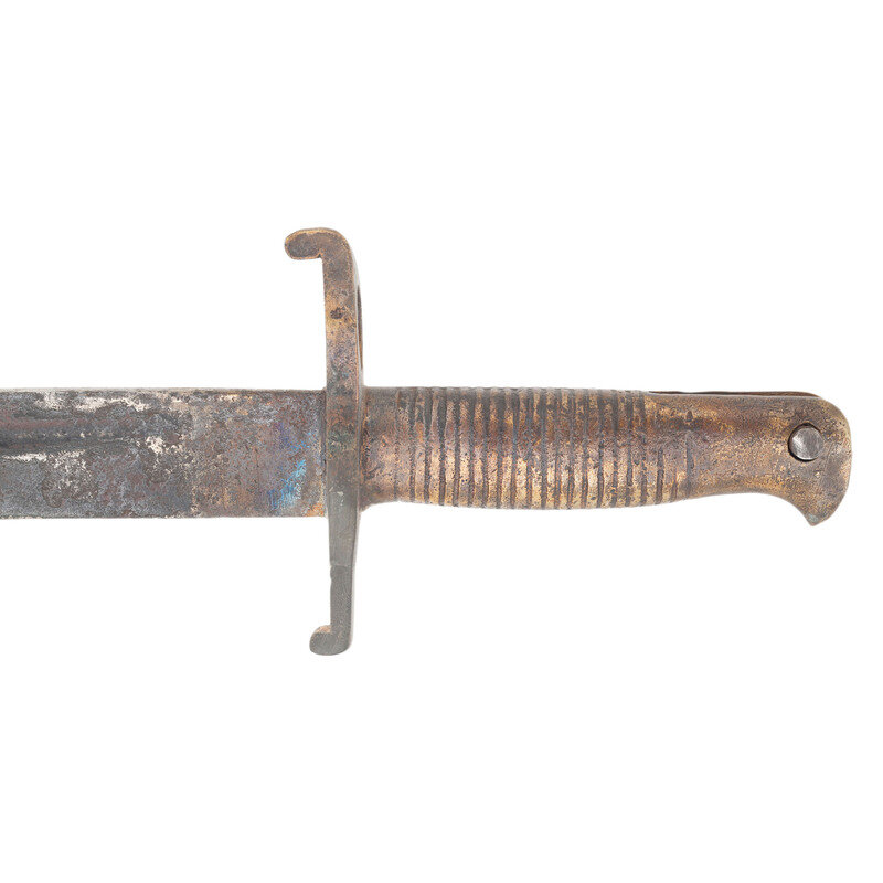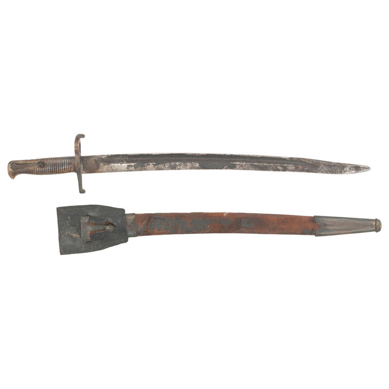 19.5" semi-Yataghan style blade, with a 13" fuller. Overall length 24.25". Crudely cast 4.75" brass hilt with 21 cast grasping grooves. Muzzle ring diameter is nominally .79" with a cock's comb quillon, lower portion of cross guard and lower quillon appear to be restored. The bayonet appears to have been intended for Enfield pattern rifles. Spring catch is a modern replacement. Blade appears to be repaired near the ricasso. The bayonet appears to be a restored relic or even dug example. Includes an old leather scabbard with aged modern brass mounts and an old leather frog.