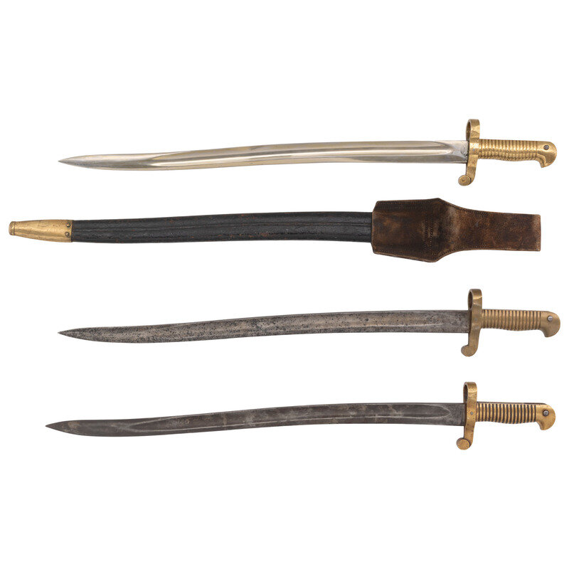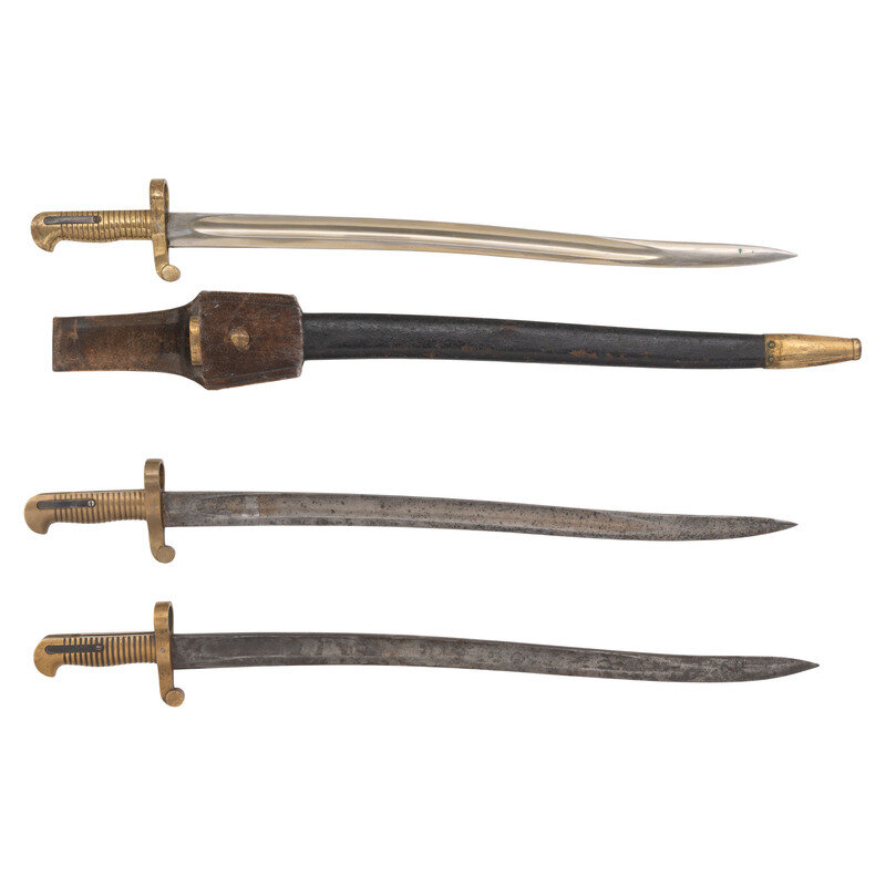 Three US Model 1861 Navy Rifle Saber Bayonets, One with Scabbard & Frog