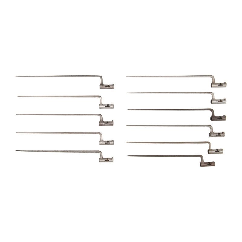 Group includes one flintlock period US Model 1816/22/27 socket bayonet with a 16" blade and sharp blade shoulders marked US/TA on the blade. The other ten bayonets are US Model 1816 Replacement Bayonets with nominally 18" blades and tapered 1855 style blade shoulders. All ten are US marked. All bayonets have a T-mortise, friction fit socket.
