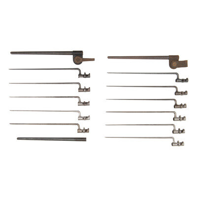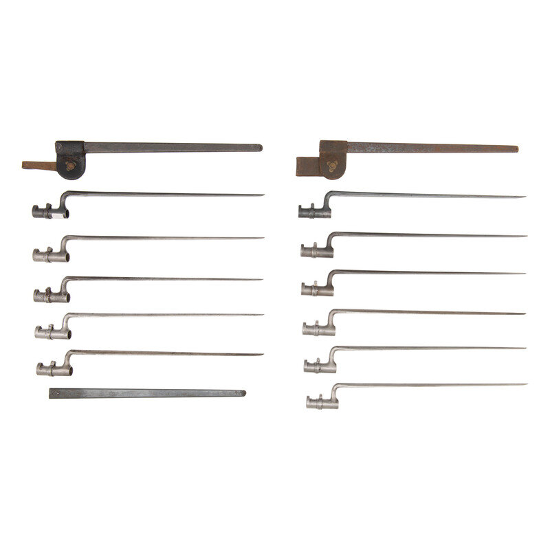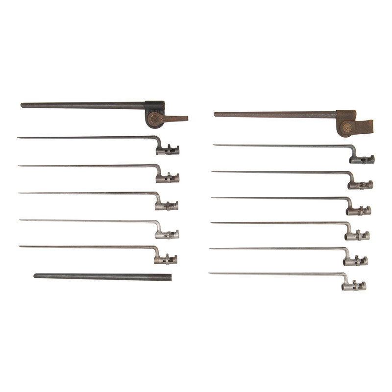Group includes nine US Model 1855 Socket Bayonets for .58 caliber rifle muskets from 1855-1864 and through the early Allin conversions until 1870. All have nominally 18" blades, functional locking rings and are all US marked on the blade. Also includes two US Model 1873 blued Trapdoor Rifle Bayoents for the Models 1873 through 1884 and many of the secondary and trials arms used during that period. Both have nominally 18" blades, are US marked and have functional locking rings. Both with metal scabbards, one with an early Hoffmann swivel frog and one with a later prairie belt brass hook frog. Also includes one spare metal trapdoor bayonet scabbard without any frog.