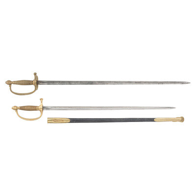 1) US Model 1840 NCO Sword by Ames. 32" single edged spear point blade with 30" stopped median ricasso. Blade .88" wide at ricasso. Overall length 38.75" with a 6" cast brass hilt with dual clam shell guards and knuckle bow. Cast grip with faux wire wrap cast into it. Reverse ricasso with Ames scroll mark, obverse ricasso marked U.S./ADK/1858. Knuckle bow with script WAT inspection. No scabbard is present.